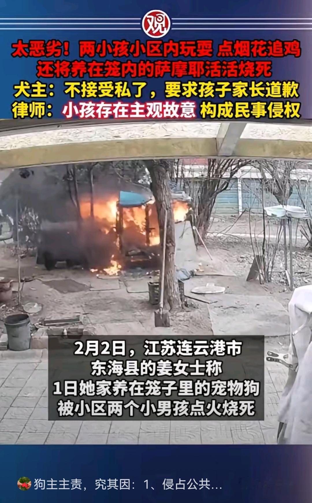 江苏萨摩耶被烧死,狗主的问题比两个孩子更严重,狗主长期侵占小区公共区域,使用易燃物圈养宠物,已经属于违法了。从视频里看,两小孩都不大,这个年纪正是招猫逗狗的年龄,我周围的人在这个小孩差不多的年纪也是拿着鞭炮乱崩,崩厕所、崩牛屎,甚至崩别人家芥菜洞。事情整体看下来,狗主侵权在先,违反养犬条例在后,这狗投胎在这户人家也是真可怜!