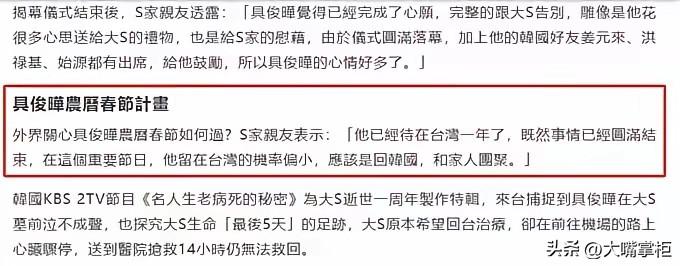在办完大S的周年祭以后,具俊晔也准备回韩国过春节了。 最近大S周年祭,具俊晔的好朋友姜元来坐着轮椅也要来陪好兄弟,韩国歌手崔始源也来了。 当着好兄弟的面,具俊晔似乎更悲伤了,看到二人就眼泪汪汪,三个大男人坐在一起,无助得像三岁小朋友。具俊晔用文字代替悲伤,在手纸上写满了对大S的思念。 据知情人士介绍,这个春节具俊晔应该不会留在台湾,而是准备回韩国陪家人,一来是这边的事情已告一段落,二来近一年都在台湾,他想利用这个春节,好好陪陪家人。 对于春节后还会不会再返台,具俊晔没有表示,可能来,也可能不来,不过就算不来,他也会时不时回来看望大S,只是像2025年一样,天天守在墓地陪大S的可能性几乎没有了。
