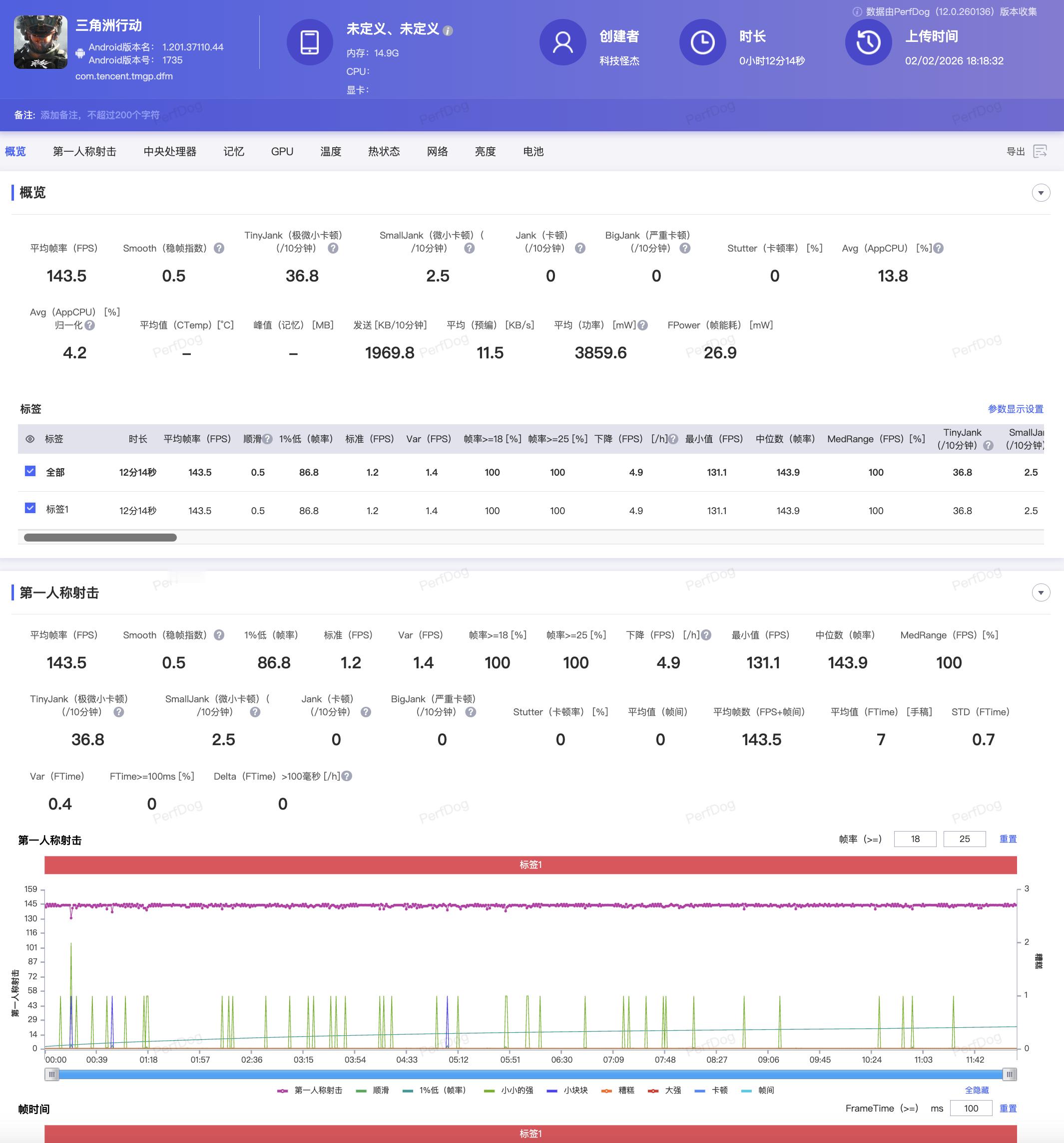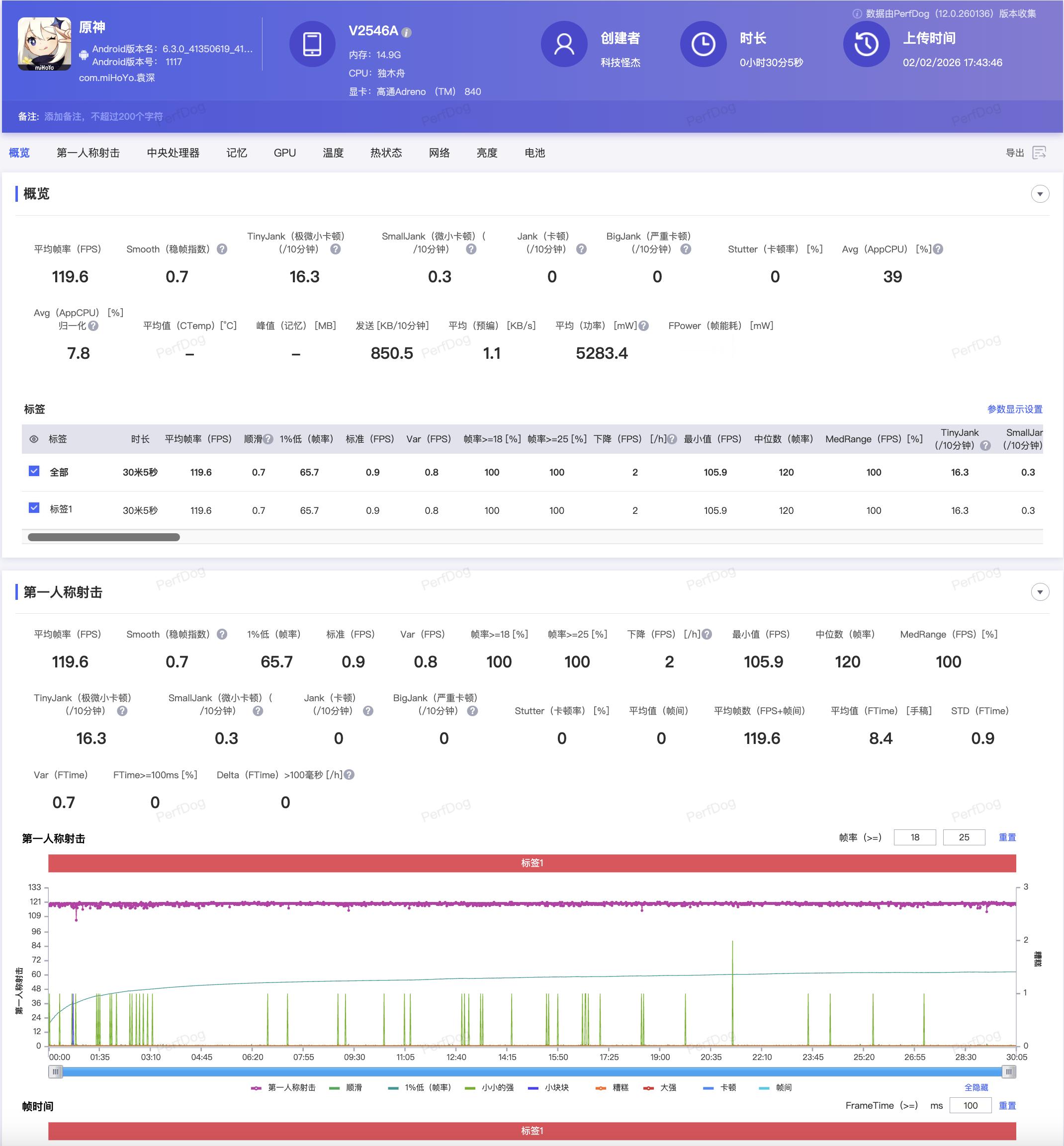 最离谱的是《三角洲行动》,平均 143.5 帧,那种跟手感完全不正常,近战对枪真的像开了物理外挂一样爽。至于《原神》这种公认的“帧率收割机”,30 分钟下来还能干到 119.6 帧,全程稳得离谱,我是真的第一次见到手机把原神压成这样。