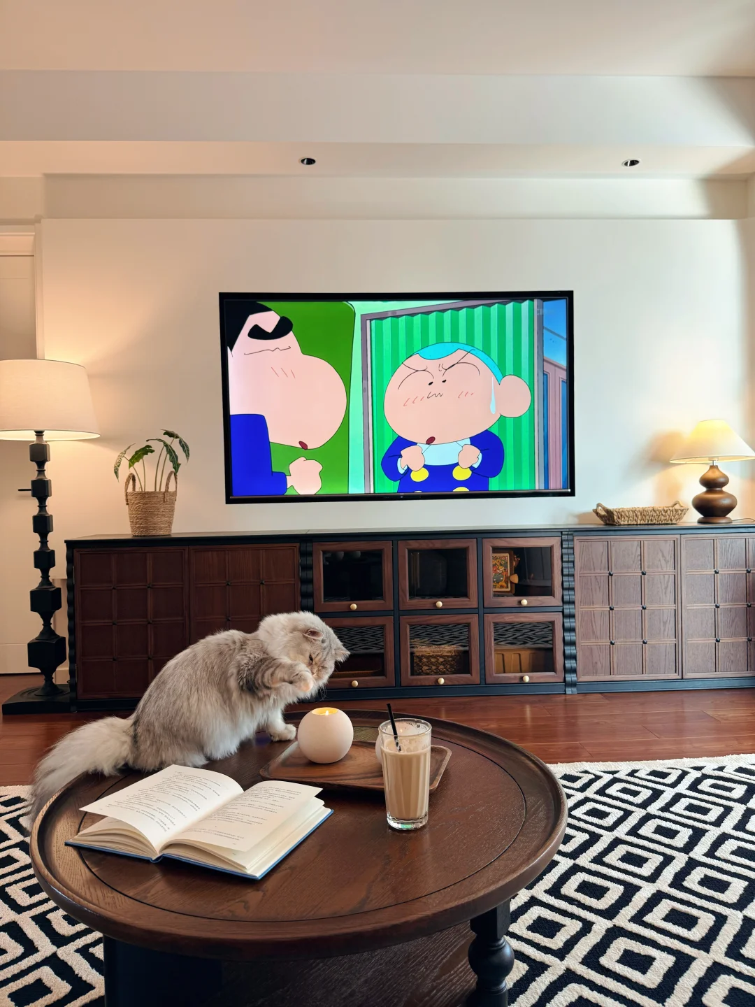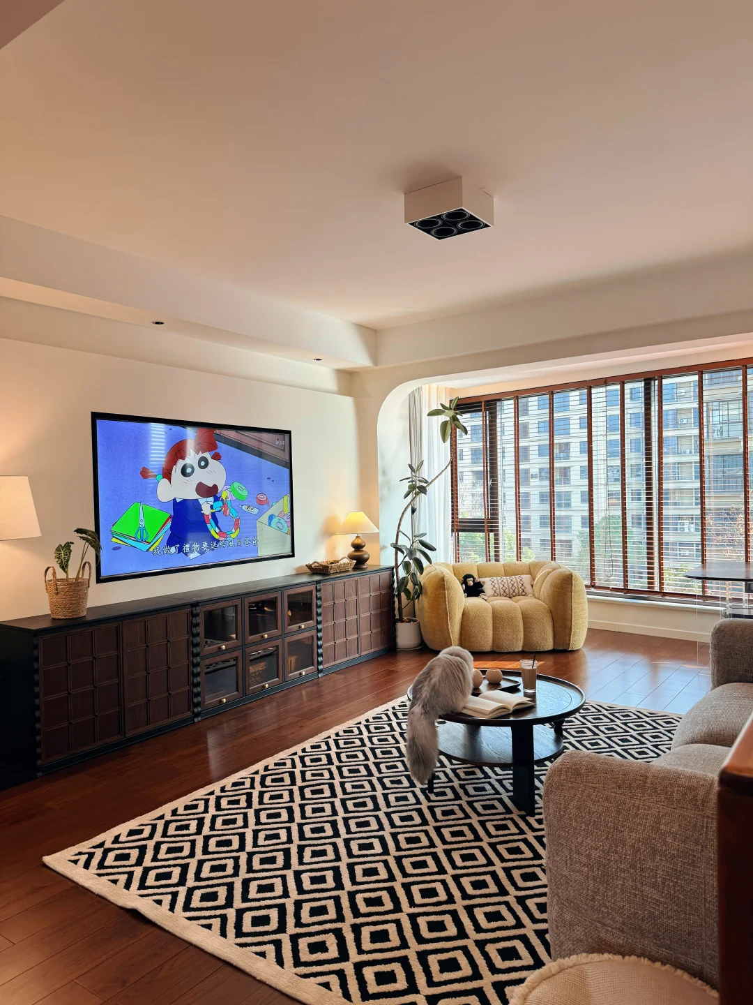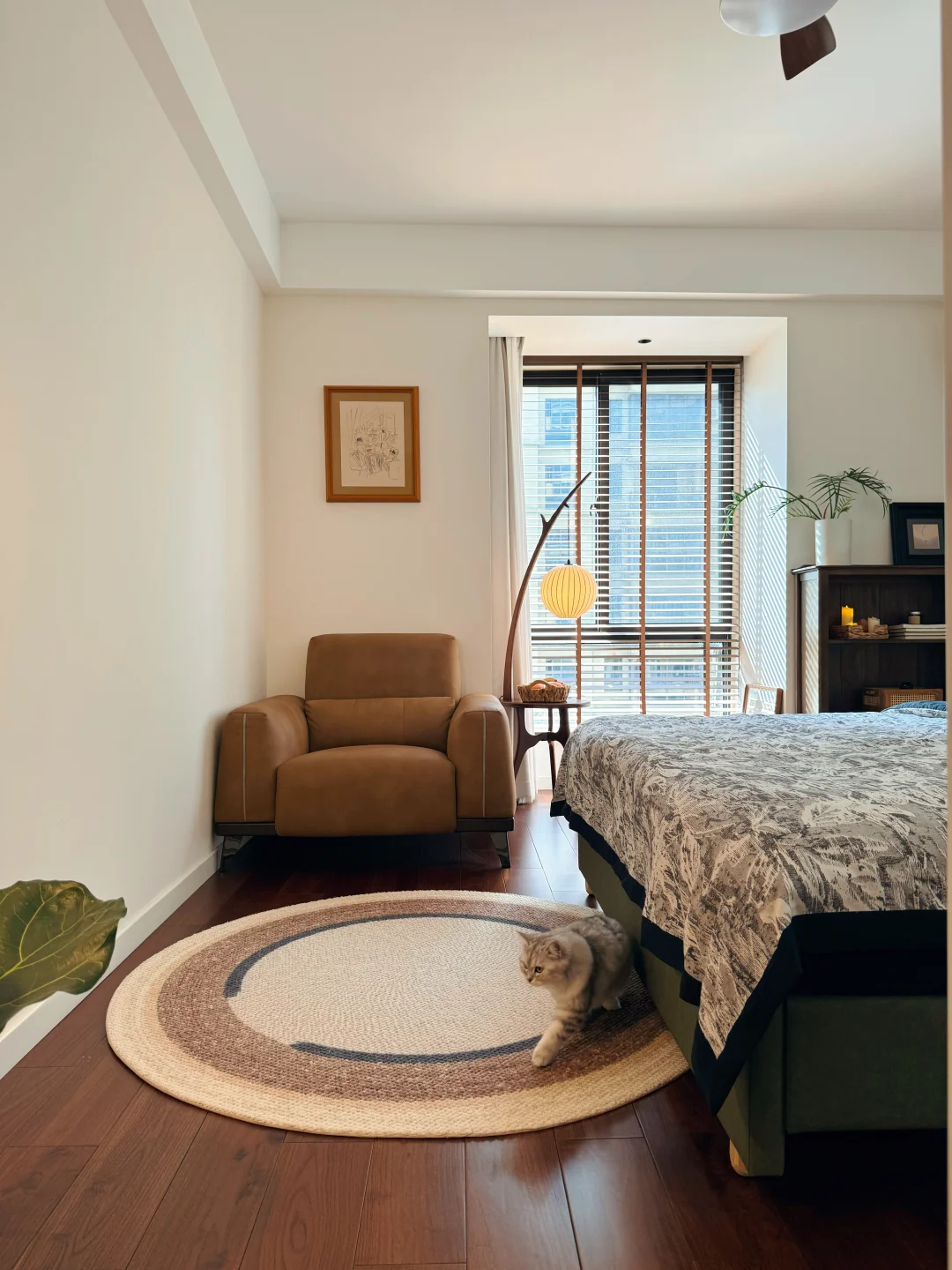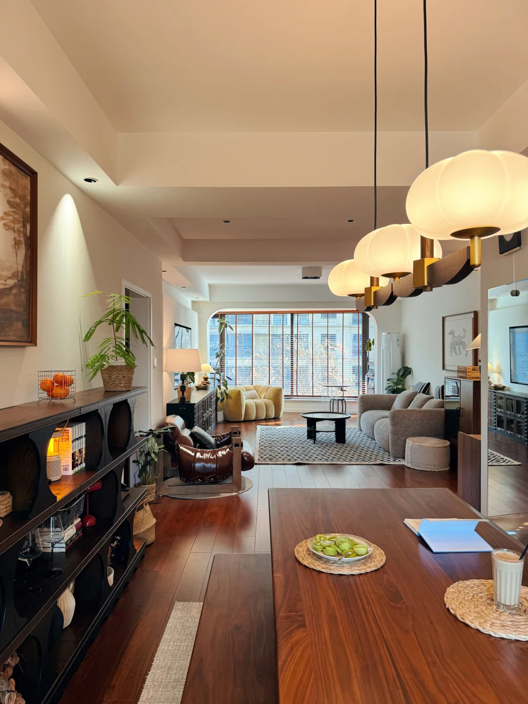 硬装墙浅地深,后期软装便以低饱和棕调调和,黑胡桃木家具自带温润木纹,复古又耐用,日常打理省心省力。