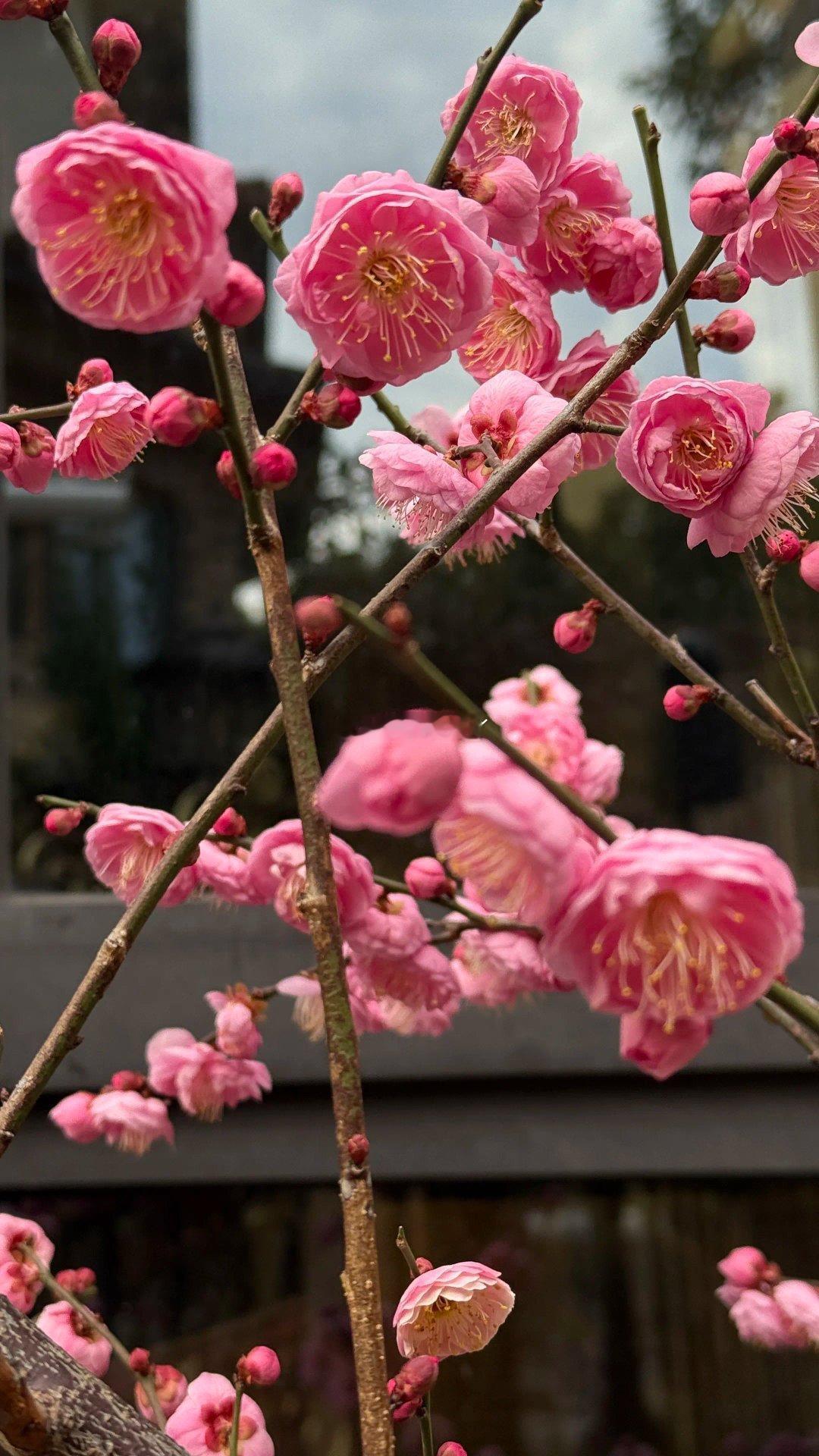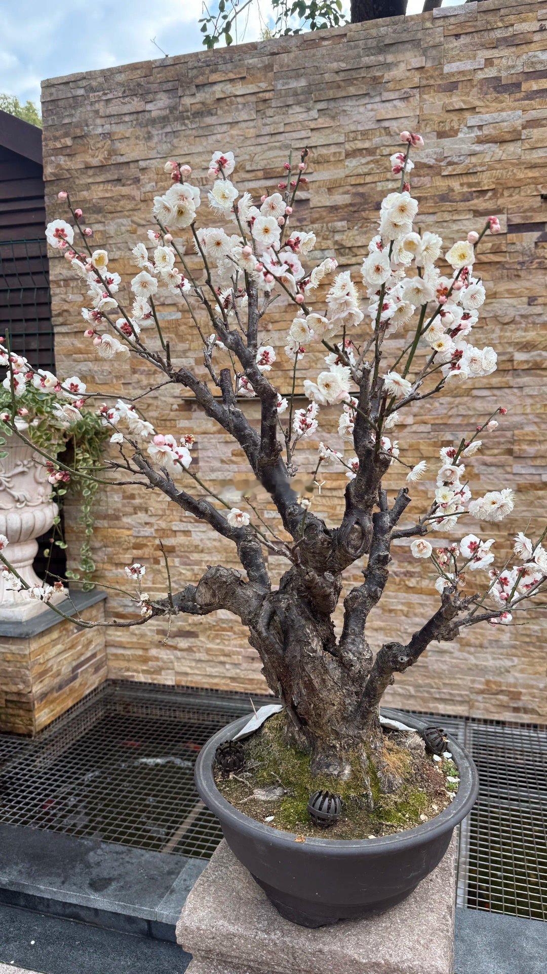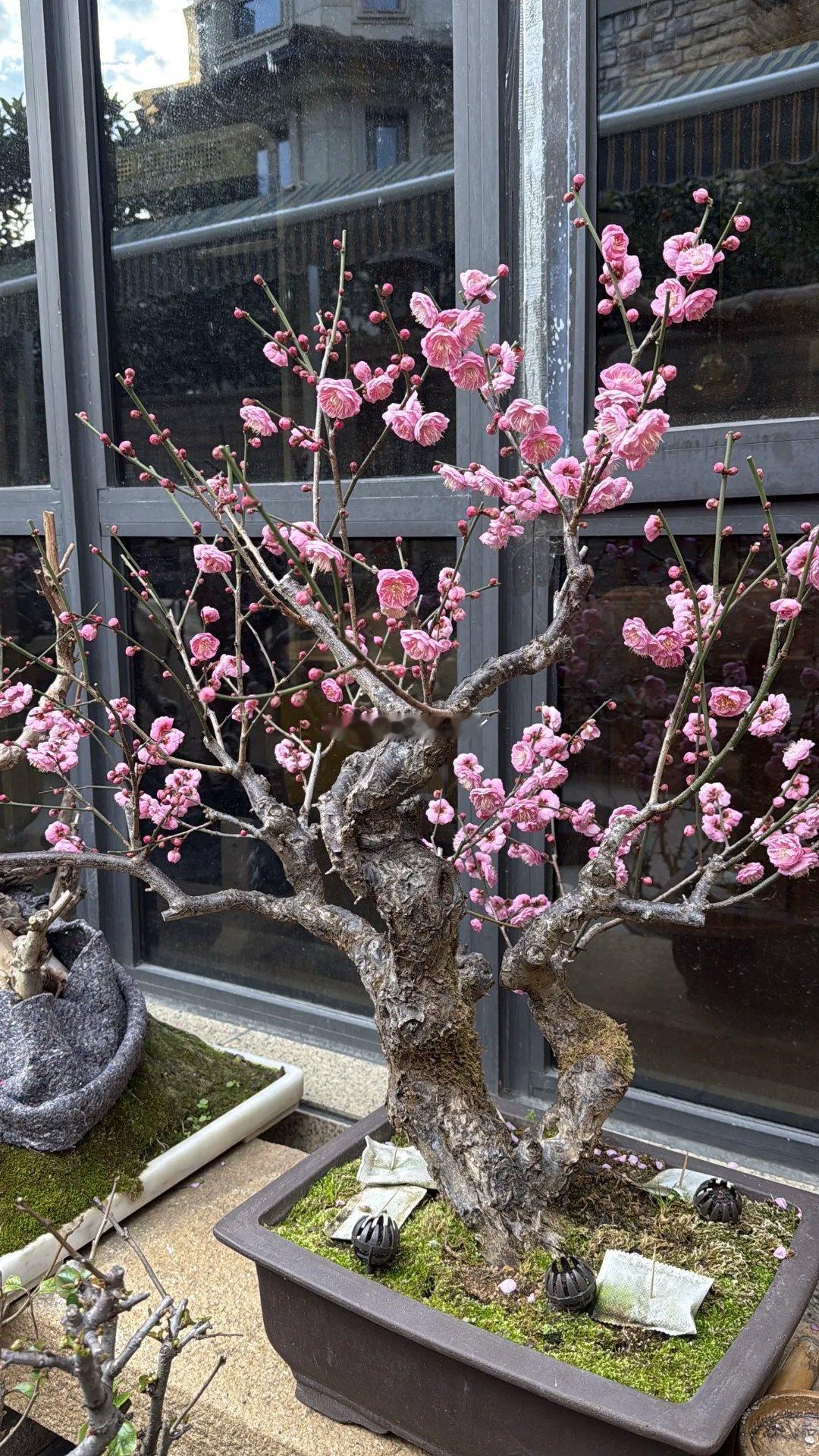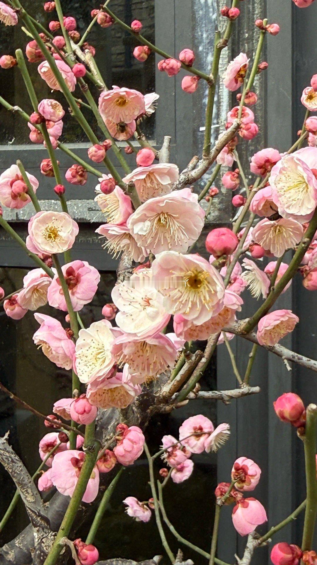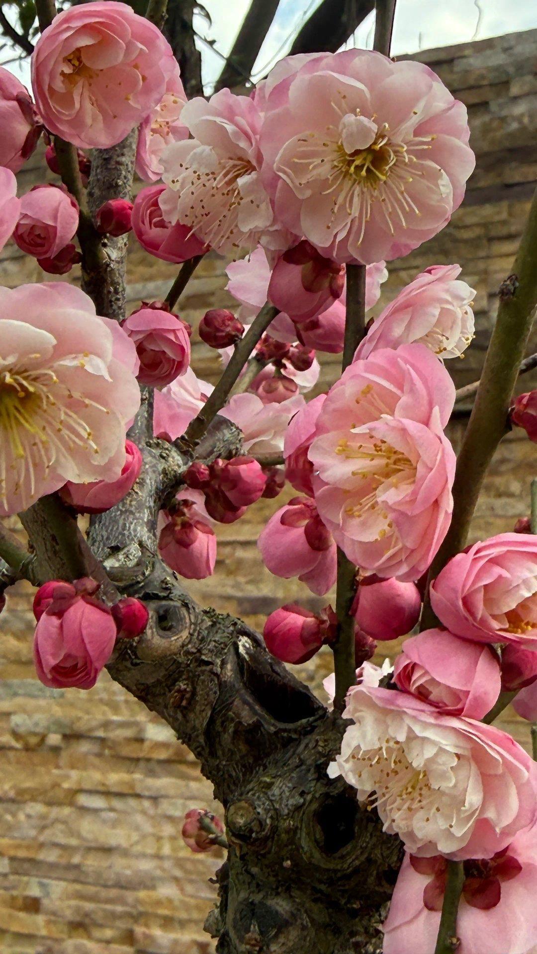 老桩上的梅花攒着劲儿绽放,粉白相间的花苞缀满虬曲的枝桠,像冬日里攒了半季的温柔,在风里轻轻舒展。它们不与春桃争艳,只在料峭里开得清绝,花瓣上沾着细润的水汽,裹着冷香漫过木台。这满枝的盛放,不是为了取悦谁,只是在凛冬里守着一份倔强的温柔,等懂它的人俯身轻嗅,读懂这藏在花骨朵里的春信。