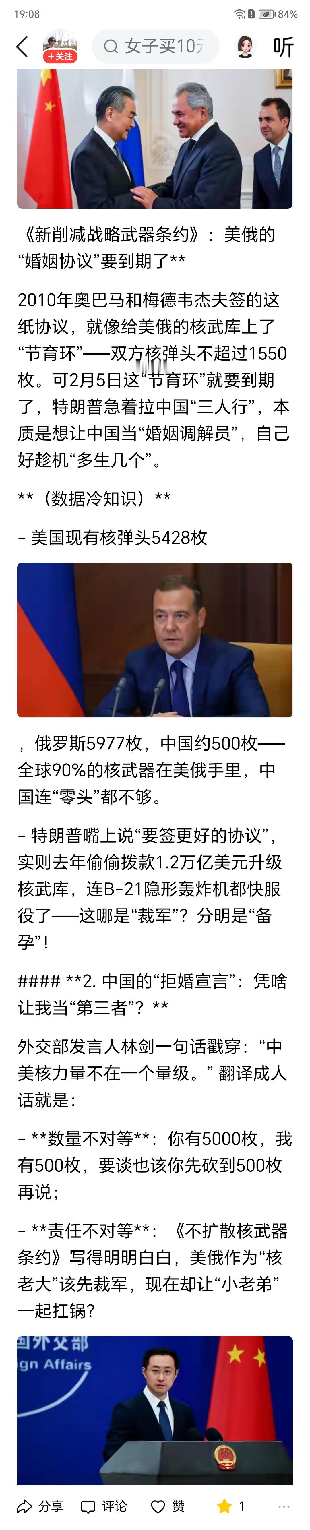 为什么,特朗普非要“让”中国参与到美俄军控谈判?说来你可能不信,但在笔者看来,就是因为他发现了在2010年奥巴马和梅德韦杰夫签订的从2011年开始执行在10年内把两国核武器,从当时各拥有6000枚左右削减到1550枚以内,因在期限内谁也没执行条约,后经商议确定在今年的明天,也即2026年2月5日执行的《新削减战略武器条约》,到了两三年前才显现出来的一个让美国不可接受的漏洞。 看到这里的朋友可能也已经猜到这漏洞就是,若美俄按新条约从明天开始把核武器数量削减到1550枚以内,中国现拥有的核武器已经不是2010年时的100或200枚,即使美俄真的削减到了1550枚以内,也不过是它们的十分之一。 但现在不一样啦。当美俄同时削减到1550枚以内时,传闻中的中国现在拥有的500枚核武器就会达到它们核武器的三分一,而不再是从前以为的十分之一,1550枚以内的三分之一和1550以内的十分之一相比完全不是一个概念啦。 尤其这个国家是中国时,这种让美国对中国核威慑能力瞬间顿失的事实,特朗普或者任何一个美国总统都不可容忍。这就是特朗普非要把中国拉进军控谈判的原因。 但是,一切都晚了。因为美俄有中导条约,中国才有了在中程弹道弹道上独占鳌头的优势;现在特朗普想借新削减条约到期之机把中国强行拉进美俄间的军控谈判,但已经错过了强行拉进最佳时机——中国早已不是2010年时的中国。 时间,不仅是杀猪刀,还是抹掉时机、胜算的利器。和俄罗斯——美国愿意怎么玩就怎么玩去吧!