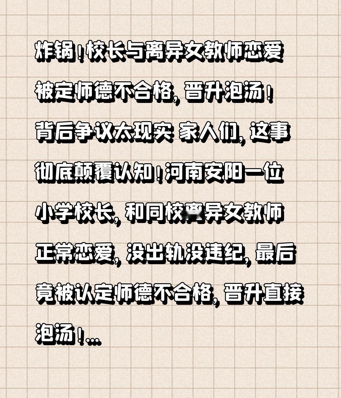 炸锅!校长与离异女教师恋爱被定师德不合格,晋升泡汤!背后争议太现实 家人们,这事彻底颠覆认知!河南安阳一位小学校长,和同校离异女教师正常恋爱,没出轨没违纪,最后竟被认定师德不合格,晋升直接泡汤!一边是成年人的恋爱自由,一边是教育部门的师德红线,网友吵翻了天,这事儿到底谁对谁错?背后的门道太值得说道! 这事得从2023年说起,安阳西高平小学的陈校长,早在2011年就离婚了,单身多年后,和同校2022年离异的韩老师走到了一起。两人都是单身,你情我愿,考虑到工作影响没公开关系,本是一段正常的中年恋情,没想到却因为韩老师前夫的操作,彻底变了味。 韩老师前夫周某知道两人恋爱后,气不过竟偷偷窃取韩老师手机隐私,把两人的聊天记录截图打印成传单,跑到教育局门口散发,还实名举报两人“乱搞男女关系”。一时间谣言四起,负面舆情直接引爆网络。可谁能想到,第一个转折点来了!警方调查后认定,周某散布他人隐私、公然侮辱他人,直接行政拘留6天,其他参与传播的人也被罚款处罚,这足以证明两人的恋爱关系并非“不正当”。 本以为谣言澄清就没事了,可更离谱的还在后面!陈校长被调离原校,韩老师也被学校辞退。2025年底,陈校长准备参与岗位晋升,调取资料时才发现,2024年的师德师风考核居然是“不合格”,而教育局给出的理由是:他和韩老师的恋爱行为违背社会公序良俗,违反职业道德! 这一下全网炸了锅,支持陈校长的网友怒了:“两人都是单身,恋爱自由受法律保护,凭啥算师德不合格?” 可教育部门也拿出了硬依据,第二个转折点浮出水面!根据《河南省中小学幼儿园师德师风评价考核办法》,教师若违背社会公序良俗,可直接认定师德不合格。而区纪委早已调查后给予陈校长党内警告处分,理由是他的行为引发不良社会影响,违反党的生活纪律。 更关键的是,这事触及了一个核心争议:教师的私人恋爱,到底该被师德管到哪一步?陈校长觉得自己没做错,合法恋爱却被剥夺晋升资格,程序也不合规——考核不合格的结果他事先完全不知情;可反对者认为,校长作为教育管理者,和下属教师恋爱存在权力不对等风险,容易引发利益冲突,而且确实造成了负面舆情,影响学校形象。 其实这事儿的本质,从来不是“能不能恋爱”,而是“职场权力差距下的恋爱边界”。就像雀巢CEO因和下属恋爱被解雇一样,很多单位都禁止上下级恋爱,不是否定爱情,而是怕权力影响公平。但陈校长和韩老师的情况特殊,两人都是离异单身,没有利益输送,也没有强迫行为,仅仅因为引发舆情就定师德不合格,确实让不少人觉得“一刀切”太生硬。 更值得深思的是,师德考核的初衷是遏制有偿补课、性骚扰等真正的败德行为,守护教育净土。可如果把成年人合法合规的恋爱,简单归为“违背公序良俗”,是不是有点偏离本质?教师首先是人,享有恋爱自由的权利,不能因为职业特殊就被剥夺私人生活空间;但同时,教师尤其是管理者,确实要承担更高的道德责任,言行举止需要兼顾社会影响。 这场争议没有标准答案,但它给所有职场人提了醒:权力差距下的恋爱,从来都不只是两个人的事,既要守住法律底线,也要考虑职业影响;而管理部门在执行规则时,也该把握好尺度,既要维护行业风气,也该尊重个人合法权利,别让“师德”变成僵化的枷锁。 你觉得校长和女教师的恋爱该被定师德不合格吗?职场上下级到底能不能谈恋爱?评论区聊聊你的看法,一起探讨这个现实难题!