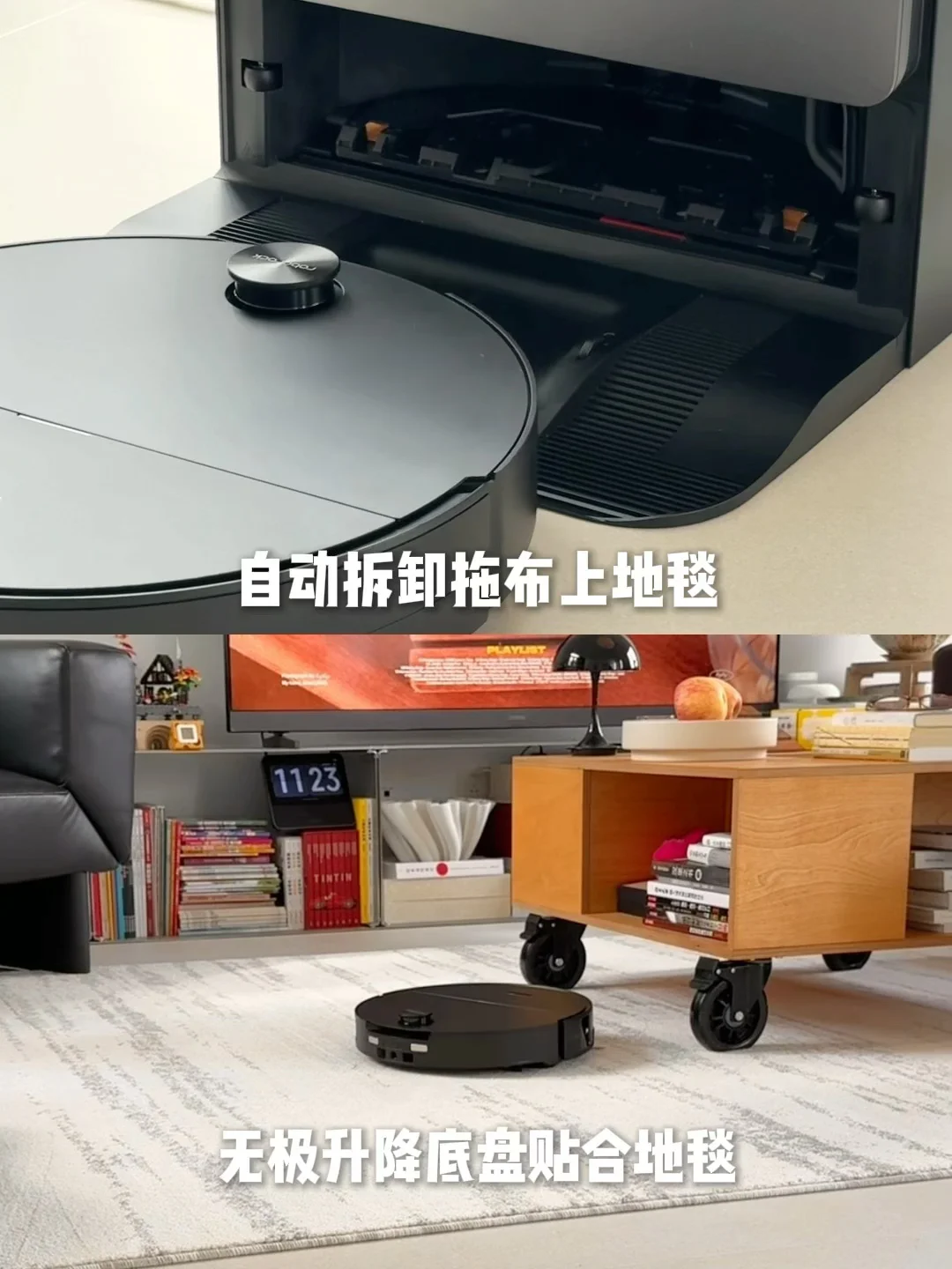 以往扫地机总让地毯边起毛,吸尘也浮于表面。上下地毯的动作轻巧从容,底盘能自适应调节、适配长短绒毛,把藏得很深的尘埃也收拾服帖,地毯也恢复了蓬松柔软的本貌。