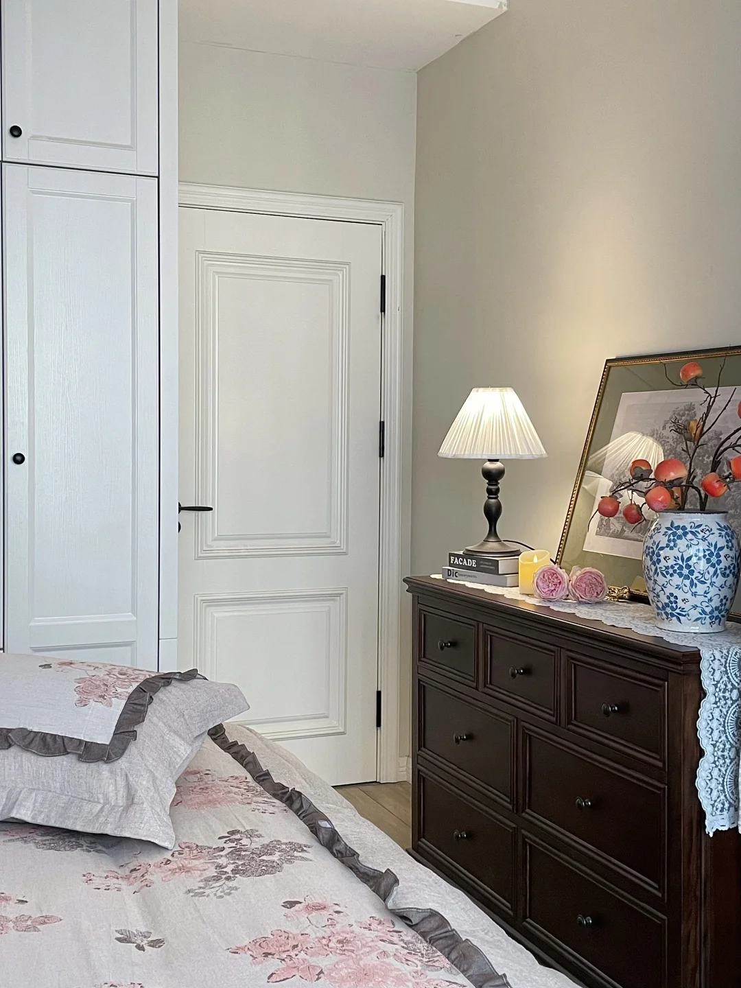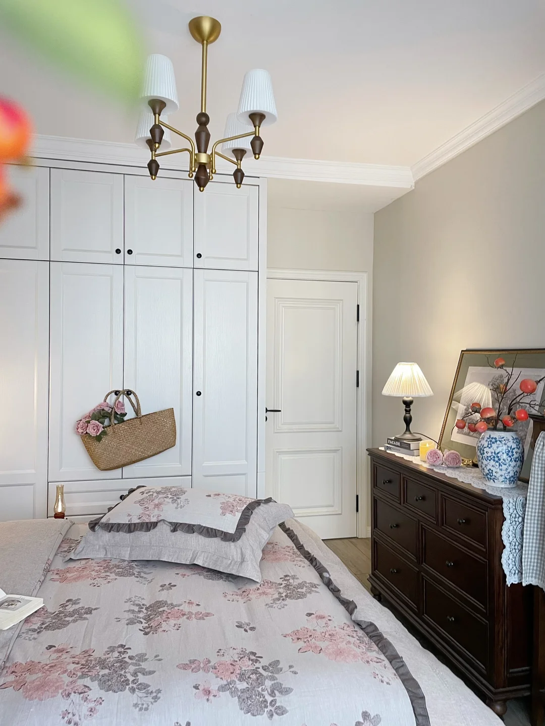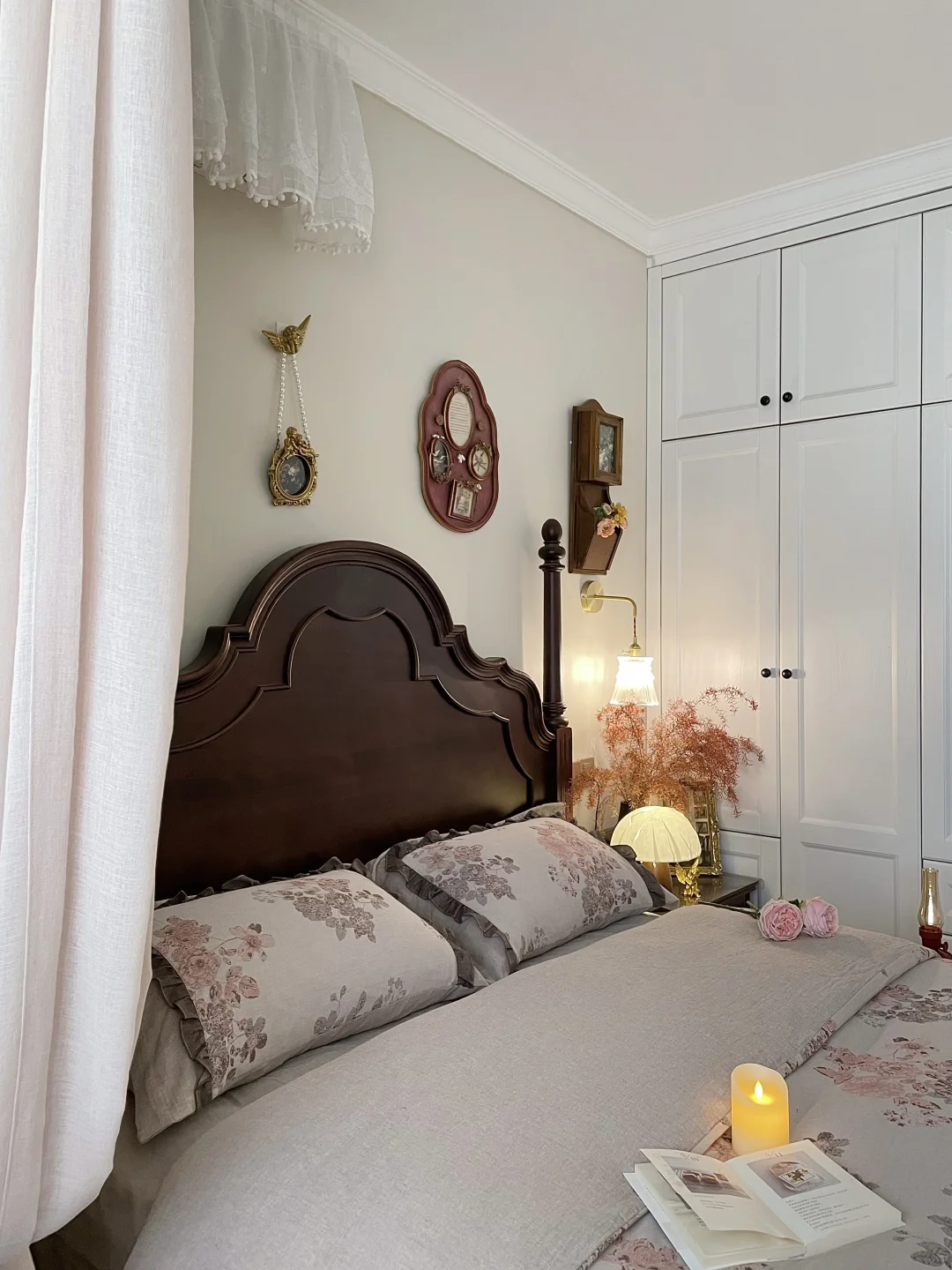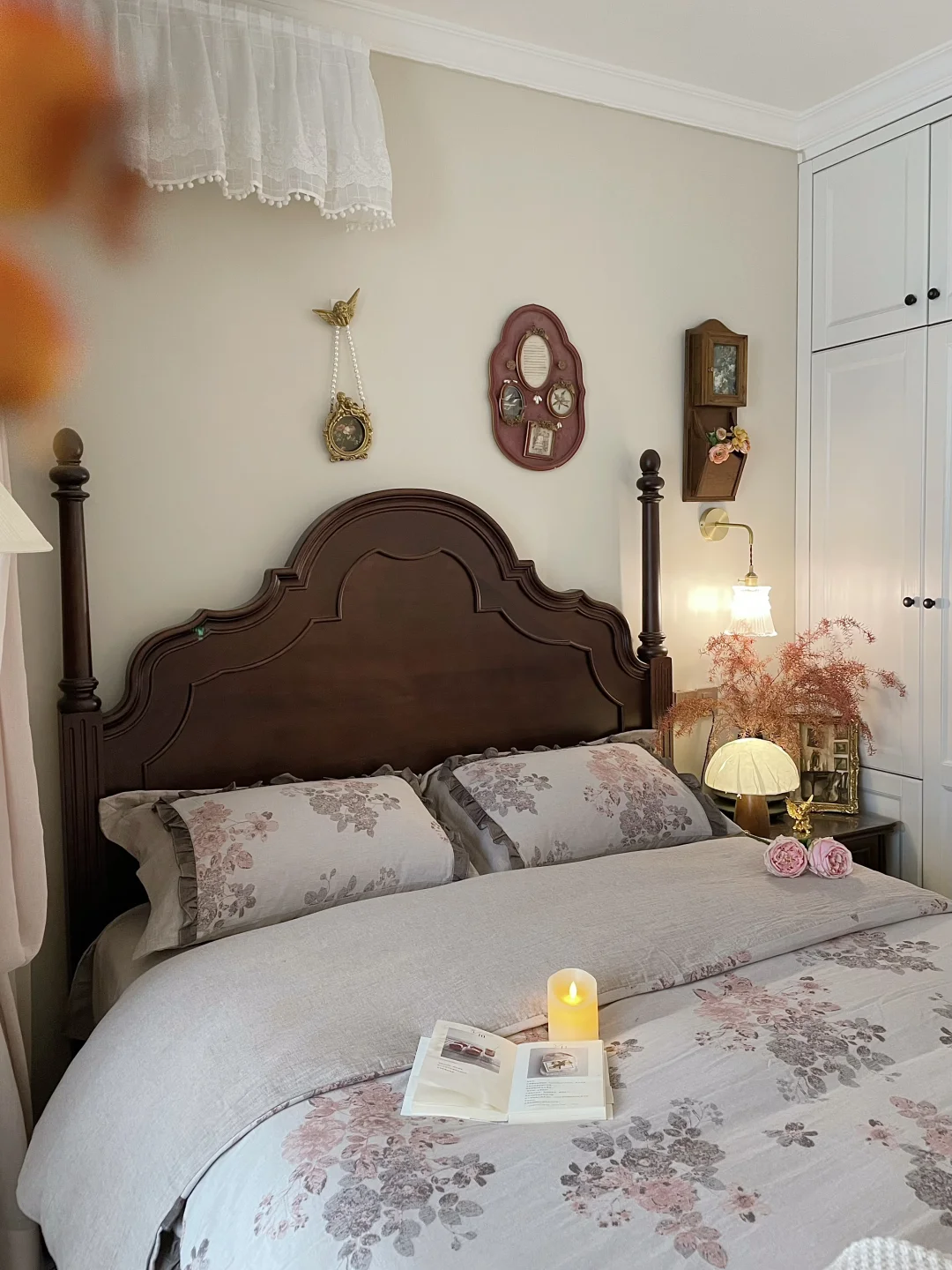 空间够的话,床尾搭配同系列的斗柜,风格统一又和谐,也是卧室收纳小能手,斗柜上还可以摆放一些复古摆件、绿植或画框,给小房间增添更多温馨的氛围感~