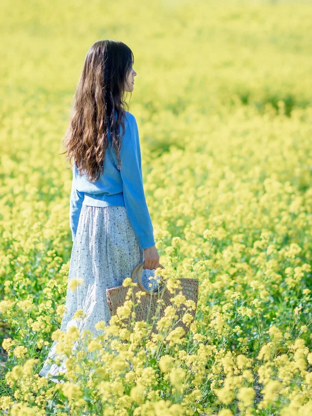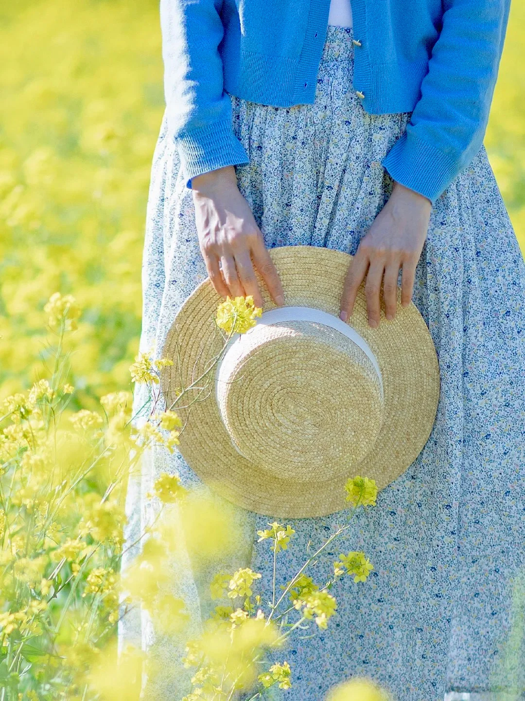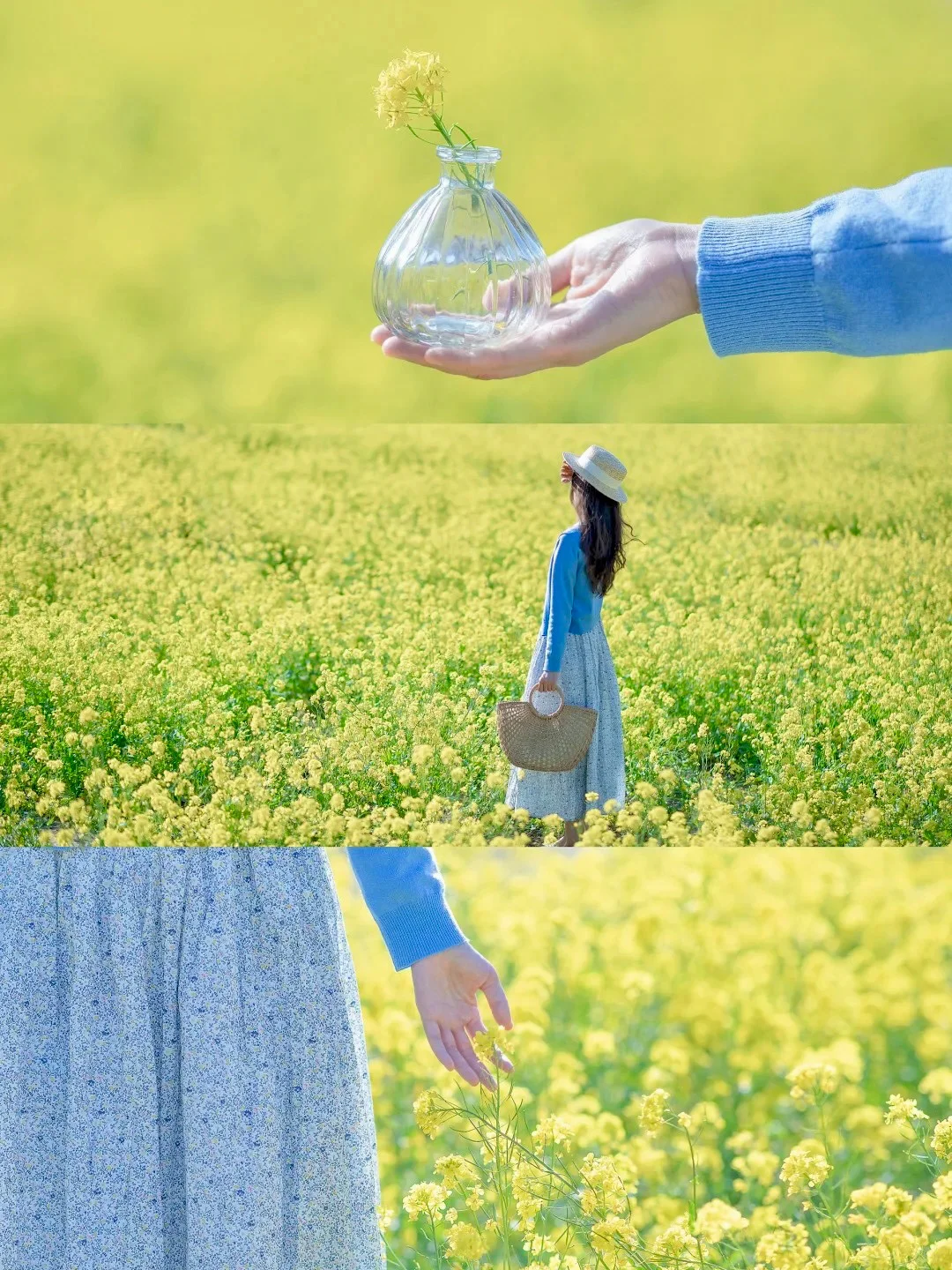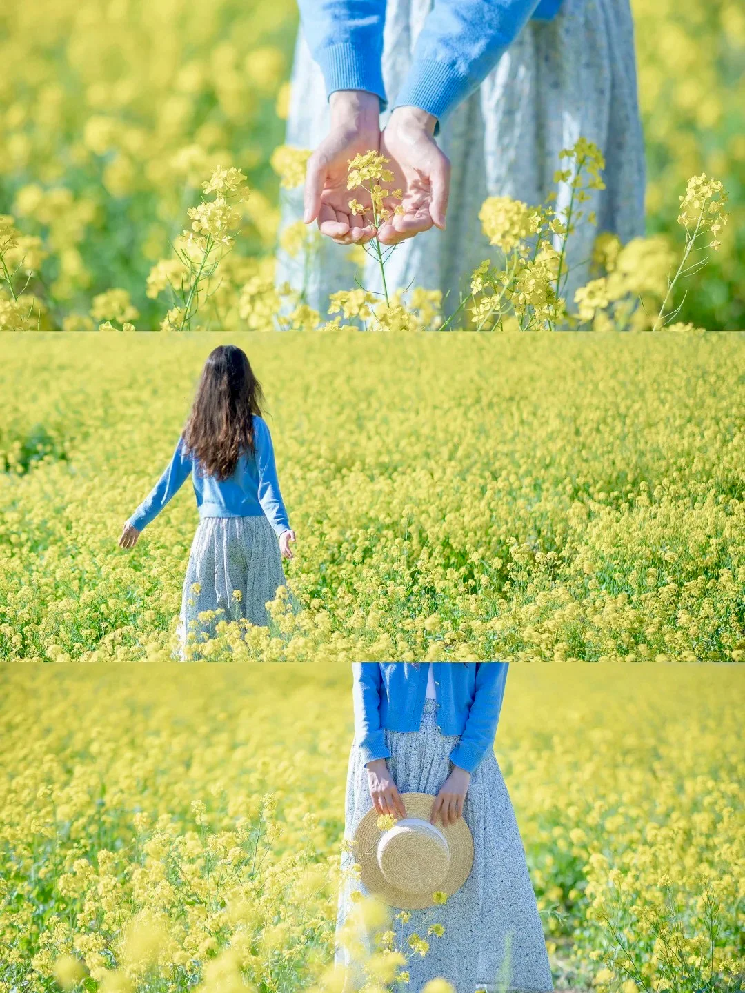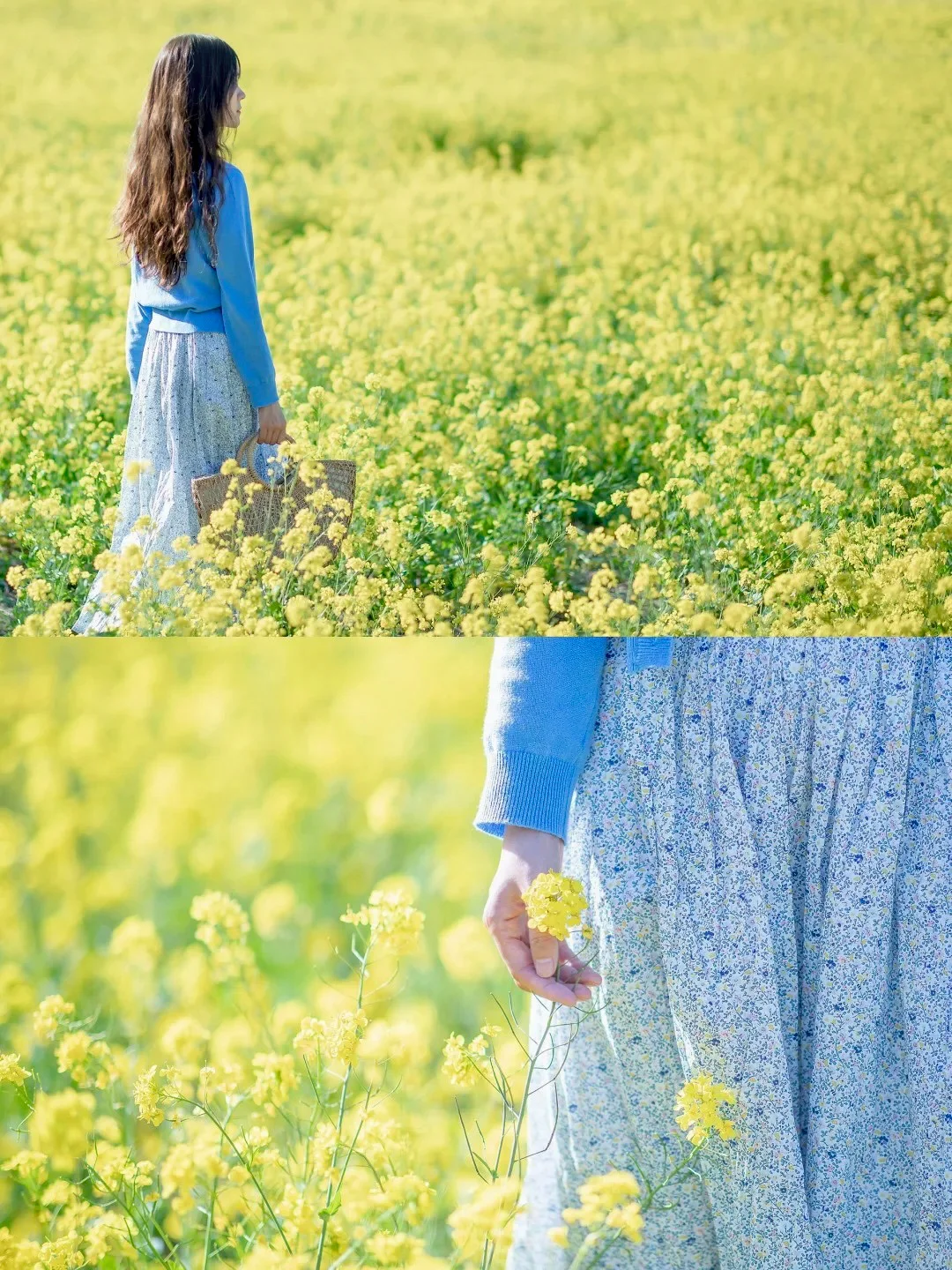 1️⃣、油菜花饱和度比较高,服装简约纯色为主最好,这里推荐清新的白色,冷暖的蓝色。