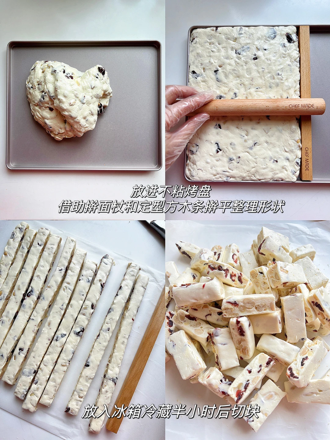 5️⃣放进不粘烤盘,借助擀面杖和定型方木条擀平整理形状,放入冰箱冷藏半小时后切块,裹上糯米纸,包上糖纸就完成啦~~