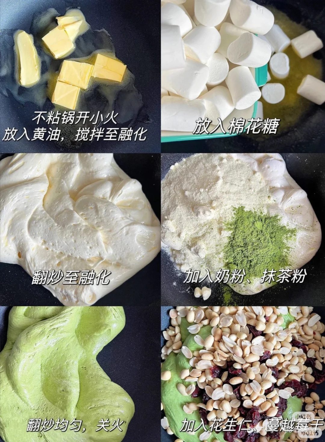 ⭐️憩解锁其他口味牛轧糖也很简单:在加入奶粉那一步,加入抹茶粉或可可粉,加入坚果这一步替换其他坚果,比如花生仁、巴旦木、开心果、芝麻之类,按照自己喜好来就好!