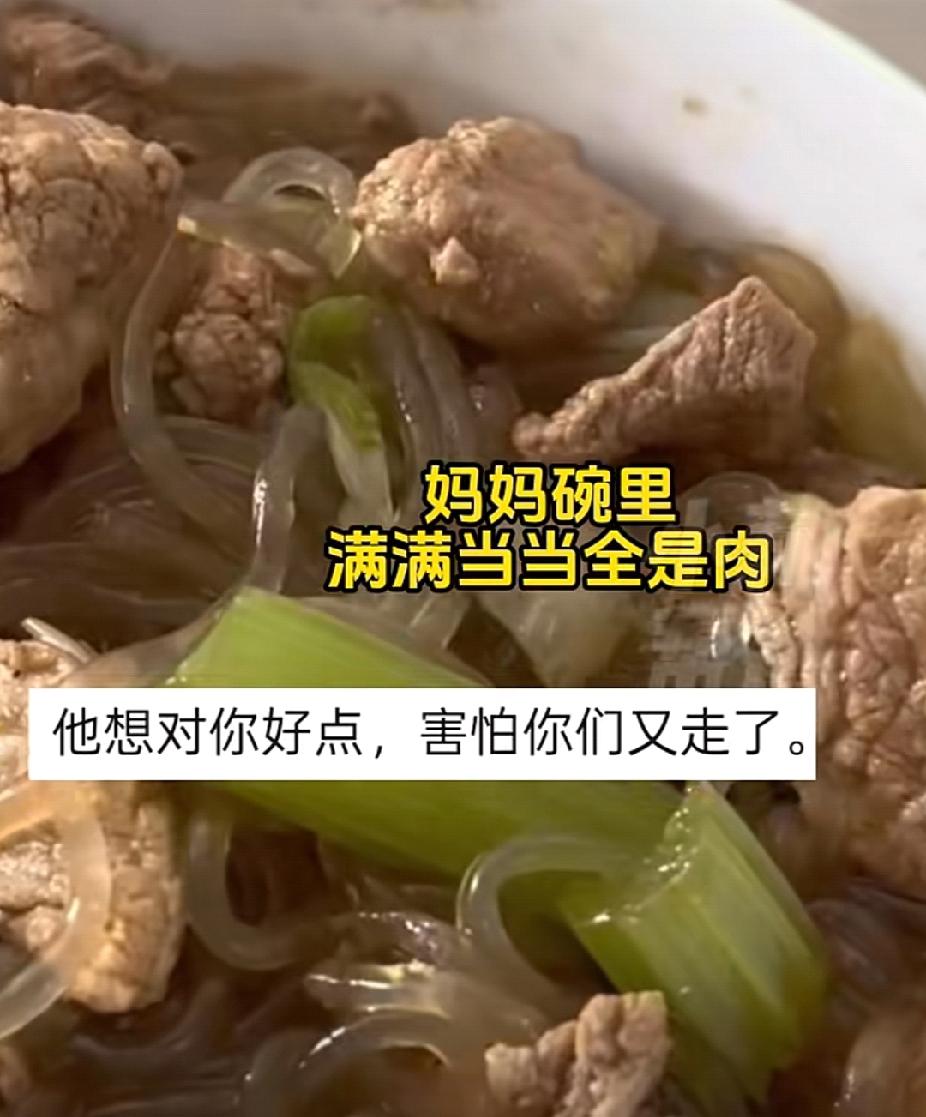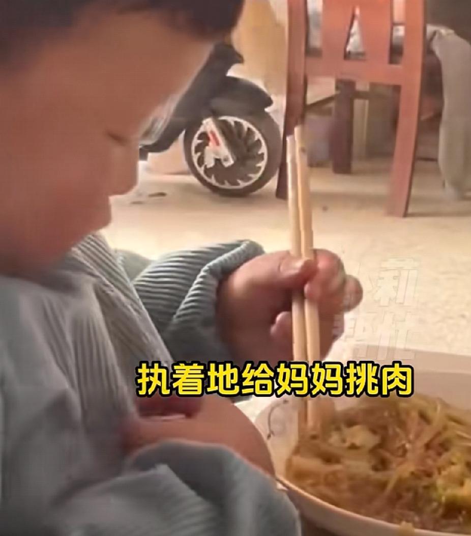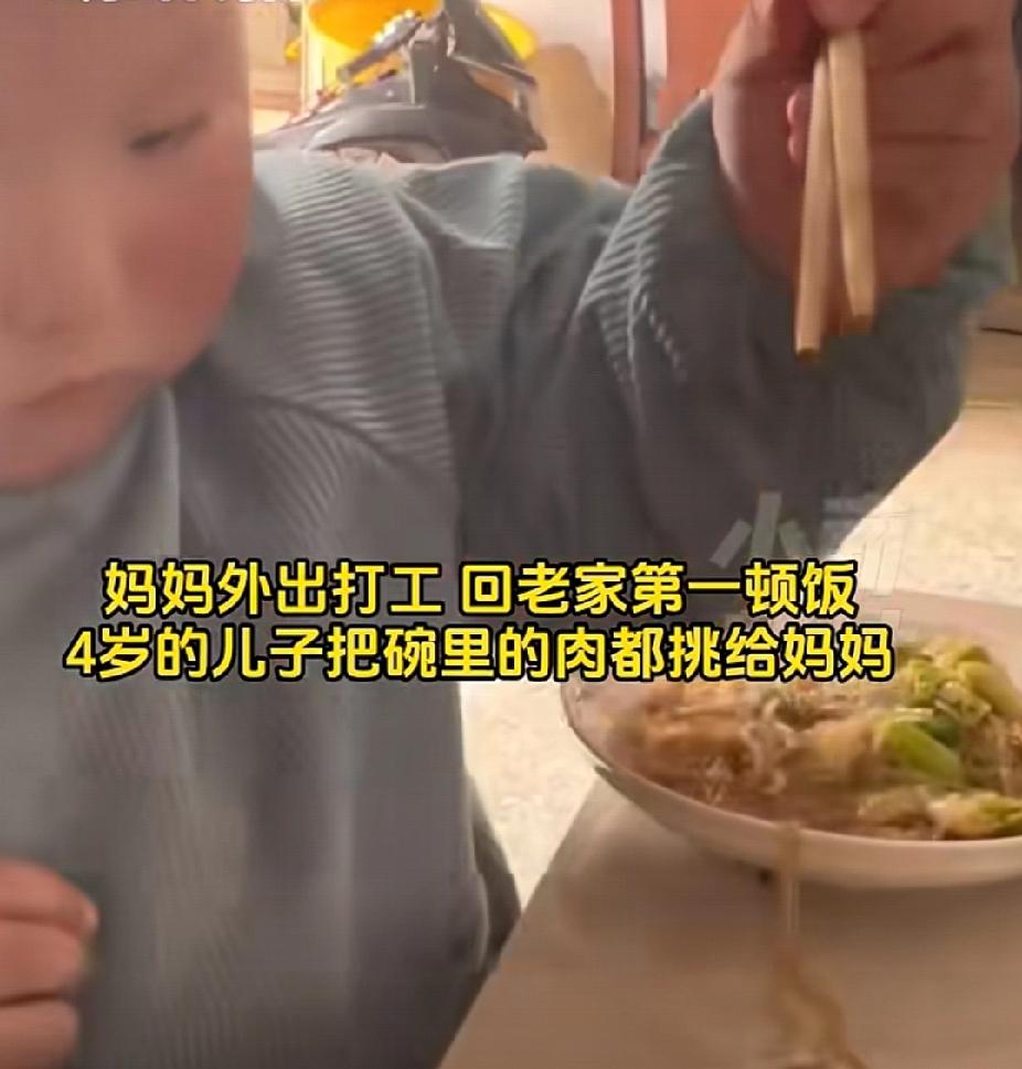 心酸!妈妈打工一年回老家第一顿饭,4岁孩子将碗里的肉全部夹给妈妈,然后把自己碗挪到一旁! 2月2日,河南一女子打工一年回到老家,这是她回来后在老家吃的第一顿饭。 4岁的孩子已经记不清多久没有和妈妈一起吃饭了,他见到妈妈没有哭闹,没有黏人。只是在吃饭时将自己碗里的肉全部挑了出来放到妈妈碗里。 孩子使劲搅动着碗里的粉条,将大肉块和小肉丁一个不落的全部挑了出来,还对妈妈说:“妈妈,我喜欢吃菜,你吃肉。” 妈妈以为孩子挑食,于是问婆婆:“妈,他平时不爱吃肉吗?” 婆婆却说:“他平时都不爱吃菜,只爱吃肉。” 妈妈瞬间明白了什么,将碗里的肉夹起来想要放到孩子的碗里,孩子却护着自己的碗,将碗小心翼翼地挪到一旁妈妈够不到的地方,防止妈妈把肉还给自己。 妈妈碗里是满满当当的肉,孩子的碗里却只有蔬菜和粉条。孩子对妈妈深深地思念,已经不再是单纯的诉说和依恋所能表达的。 在孩子的世界里,他并不知道为什么妈妈要离开自己外出打工。他小小的世界里,只有不喜欢一样东西,这样东西才会被抛弃。所以他努力的想要讨好妈妈,希望妈妈不要再像以前那样离开那么久。 看到这里,我想起了自己小时候。母亲去世,父亲外出打工,每年年初父亲出门的时候我都会哭闹。过完年后的日子,每一天我都在担惊受怕,因为我知道爸爸又要离开我很久了,我害怕那一天的来临,所以也不敢问。 有时候爸爸会去别人家串门,我就像个跟屁虫一样围绕在爸爸身边。爸爸并不会给我买零食和玩具,但即便两手空空,我也愿意跟在爸爸身边。因为那对我来说,是一种难以言说的踏实和温暖!留守儿童 河南