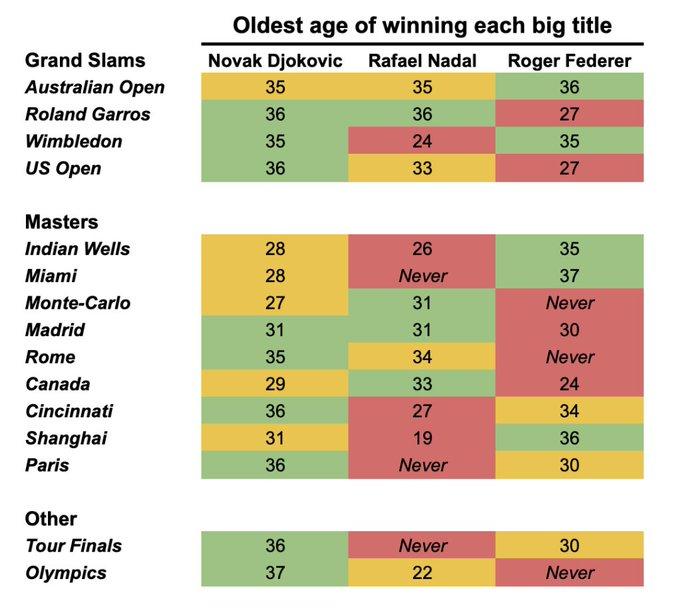 超长待机! 诺瓦克·德约科维奇的职业生涯有多么长久? 在网球界,他不仅是唯一一位赢得全部15个重要冠军的选手。 还是双圈金大师,3圈全满贯获得者。 而且以年龄来看,他是三巨头中赢得15个重要冠军中9个的最年长者, 而纳达尔和费德勒分别是4个和5个。 任何一个重要冠军的年长者排名,德约科维奇或是领先,或者居中。 纳达尔和费德勒无法同时完成对诺瓦克的超越。 我们再也不会看到一个35至40岁左右的运动员在如此耗费体力的运动中表现得如此出色了。