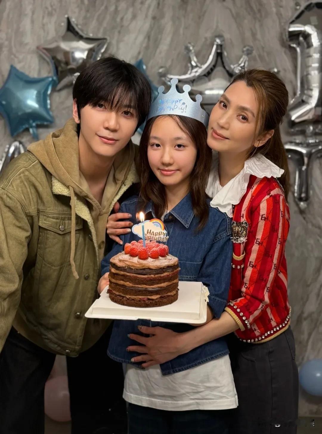 洪欣晒照,庆祝女儿彤彤12岁的生日,儿子张镐濂现身。五十出头的洪欣依然肤白貌美大