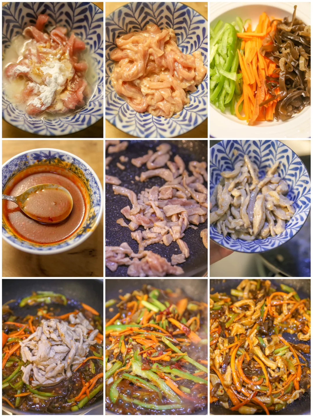 1.把所有的蔬菜切成丝,葱和姜切丝,蒜切末。里脊肉切成丝,放入腌肉丝酱料,腌制5分钟。