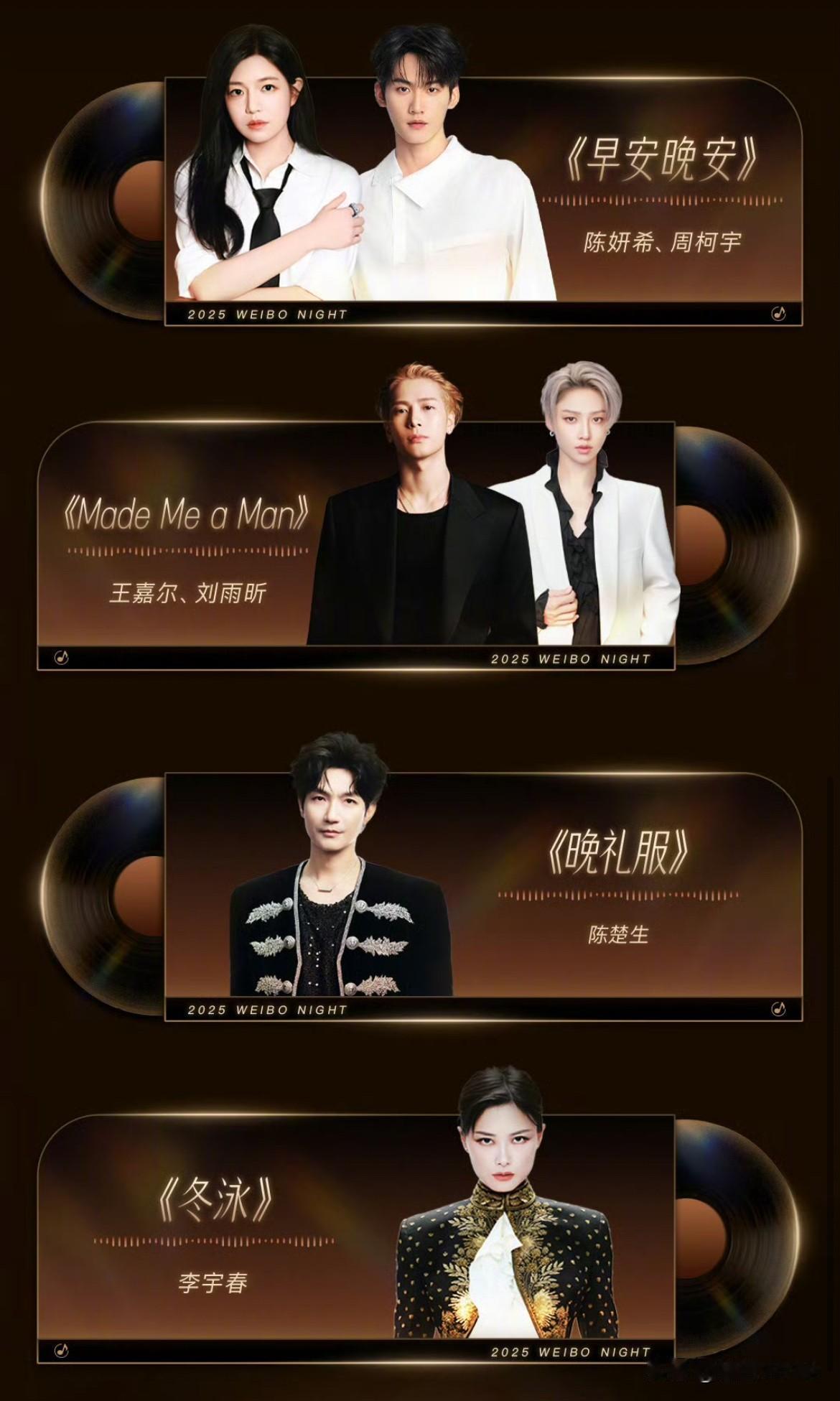 2月4日,🧣之夜节目单,虽然一水的歌曲,但歌手及《歌曲》选择上含金量颇高! 期待周深,张碧晨,刘宇宁,陈妍希周柯宇,王嘉尔刘雨昕,陈楚生,李宇春压轴 混内娱的都知道李宇春非压轴不出场,今天白天一直有人在关注李宇春官宣有没有压轴,现在看到节目压轴,也算是稳了! 陈妍希周柯宇最佳的合唱时间是在上个月星光大赏的时候,现在热度退散了很多,去年新剧很多人都转向磕宋威龙赵今麦去了,这次合唱,算是弥补上次被于正阻拦没有合体的遗憾吧,他们接下来都有其他剧,肯定是合作完就解绑的,就算不解绑,等金吾不禁播出时,于正也会手拆! 串场的歌都不错,期待节目,也期待获奖的艺人们明天各自的风采! 周深 刘宇宁