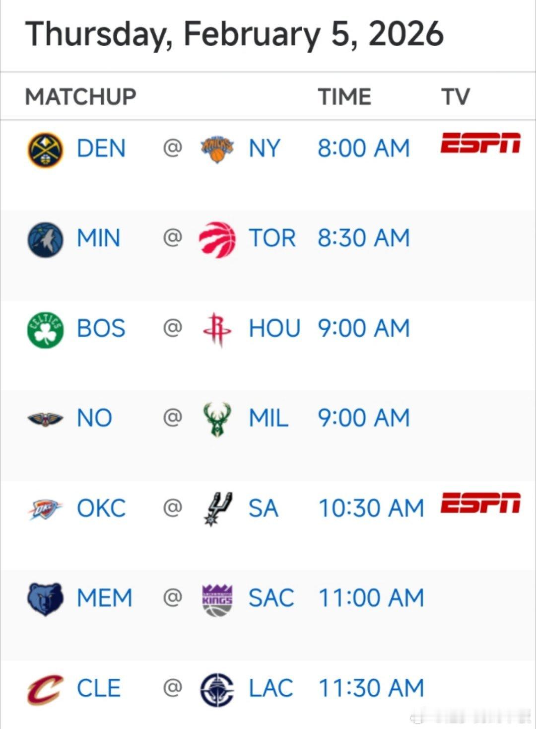 8:00 掘金vs尼克斯8:30 森林狼vs猛龙9:00 凯尔特人vs火箭10:30 雷霆vs马刺11:30 骑士vs快船新赛季篮不住
