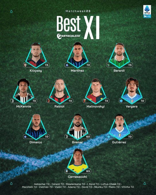 意甲23轮最佳阵容: