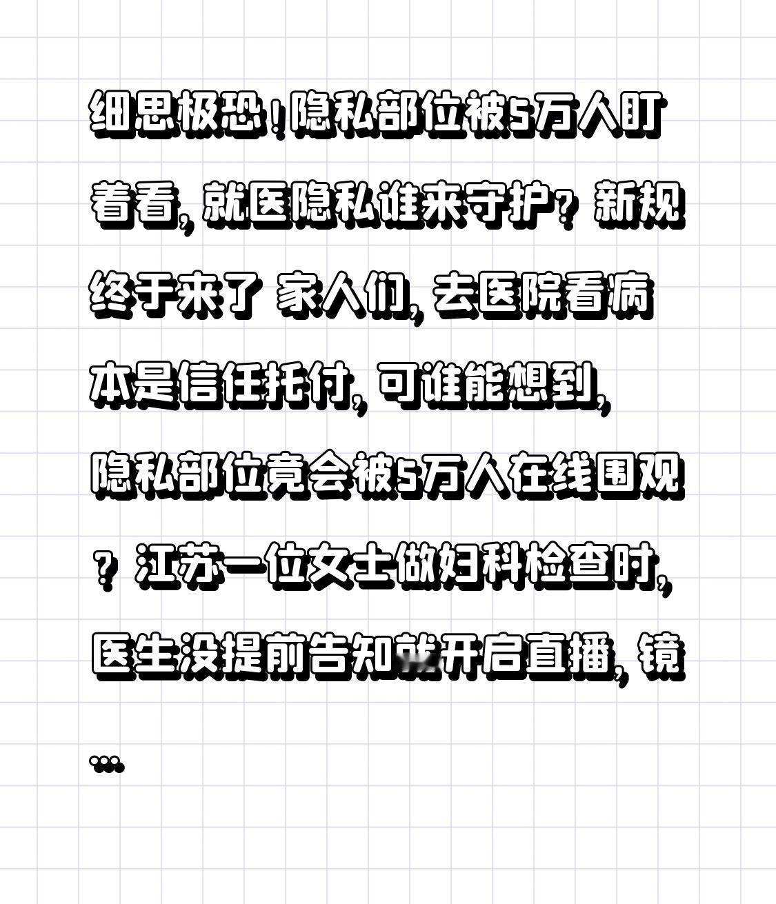 细思极恐!隐私部位被5万人盯着看,就医隐私谁来守护?新规终于来了 家人们,去医院看病本是信任托付,可谁能想到,隐私部位竟会被5万人在线围观?江苏一位女士做妇科检查时,医生没提前告知就开启直播,镜头直怼隐私部位,弹幕里全是低俗评论,这事儿看完让人浑身发毛!就医时的隐私安全,到底该谁来保障? 这事不是个例!浙江一位男士做肛肠手术,术后刷短视频时,竟刷到自己手术的全程直播,画面里不仅有裸露的隐私部位,还有医生的调侃调侃,观看人数超3万;山东某医院的整形科,把患者的双眼皮手术、隆胸手术当成“教学案例”,在多个平台同步直播,甚至公开患者的姓名、年龄等信息,让患者遭到网友人肉搜索。 更让人愤怒的是,这些直播大多打着“医学科普”“教学交流”的旗号,实则暗藏窥私猫腻。很多医生根本不提前告知患者,甚至在患者麻醉无意识时开启直播,美其名曰“让更多人了解医学知识”,可直播间里的评论全是“求特写”“看得真清楚”这类低俗言论,5万多人的围观,哪里是科普,分明是赤裸裸的侵犯隐私! 第一个转折点来了!随着受害者纷纷维权,这些违规直播被陆续曝光,涉事医生和医院受到了应有的处罚:有的被吊销执业证书,有的医院被罚款整改,平台也下架了相关直播和视频。可维权过程却异常艰难,很多患者发现自己被直播时,视频已经传播数月,隐私泄露造成的心理伤害根本无法弥补,而且取证难、举证难,不少人最后只能不了了之。 更让人揪心的是,医疗隐私泄露的渠道远不止直播。有患者发现,自己的病历被医院工作人员拍照发朋友圈;有人在二手平台买到包含隐私部位的医学影像资料;还有不法分子勾结医院内部人员,倒卖患者的就诊记录、检查报告,这些信息被用来精准诈骗、骚扰,让患者苦不堪言。 就在大家对就医隐私感到绝望时,第二个关键转折带来了希望!2026年1月,国家卫健委正式出台《医疗服务直播管理暂行规定》,明确要求:医疗直播必须提前告知患者并获得书面同意,严禁拍摄暴露隐私部位的画面,教学类直播需对患者面部、隐私部位进行模糊处理,违规者将面临最高50万元罚款,情节严重的吊销医疗机构执业许可证! 新规的落地,让无数人松了一口气。但要真正守护就医隐私,还需要多方发力:医院要加强内部管理,杜绝工作人员泄露隐私;平台要严格审核医疗类直播,堵住监管漏洞;而我们作为患者,也要提高警惕,就医时主动询问是否有拍摄、直播行为,发现违规及时举报。 其实大家害怕的不是医学科普,而是打着科普旗号的隐私侵犯;担心的不是治疗过程中的必要暴露,而是未经同意的恶意传播。就医是信任的交付,每一位患者都有权利要求隐私被尊重、被保护,这不仅是法律的规定,更是医者仁心的底线。 医疗的本质是守护生命健康,而不是消费患者隐私。希望新规能真正落到实处,让每一个人都能放心就医,不用再担心隐私被窥探、被传播。你有没有遇到过就医隐私被泄露的情况?评论区聊聊你的经历和看法,一起为守护就医安全发声!