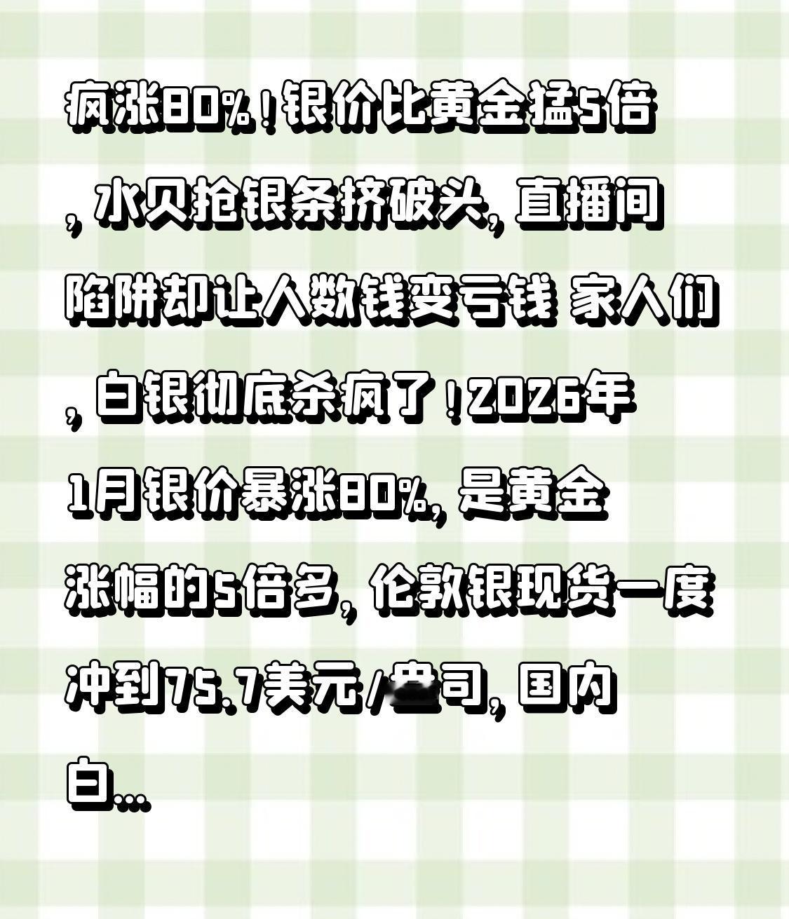 疯涨80%!银价比黄金猛5倍,水贝抢银条挤破头,直播间陷阱却让人数钱变亏钱 家人们,白银彻底杀疯了!2026年1月银价暴涨80%,是黄金涨幅的5倍多,伦敦银现货一度冲到75.7美元/盎司,国内白银T+D最高飙至23420元/千克!水贝珠宝市场抢银条的人挤破头,大爷大妈扛着现金扫货,可这波“银疯狂”背后,有人一夜赚翻倍,有人却栽进直播间陷阱,血本无归! 这波银价暴涨,根本不是单纯的“跟风黄金”,第一个转折点就藏在它的“双重身份”里!白银不只是贵金属,更是工业刚需品——全球55%的白银都用在光伏产业,2026年光伏装机预计突破600GW,就算新技术降银,总需求还是创新高;再加上新能源汽车、5G基建、AI数据中心的抢银大战,工业需求彻底爆发。而供应端却跟不上,70%的白银是铜铅锌的伴生品,新增产能要等5-10年,再加上中国出口“一单一审”收紧流通,供需缺口高达8000吨,这才是涨价的核心逻辑。 价格一涨,市场直接沸腾!深圳水贝的银条被抢成“硬通货”,商户加价收货,1千克投资银条从6000元涨到1.2万元,依然供不应求;银行的纸白银、白银ETF被散户疯抢,全球最大白银ETF持仓量暴涨2000吨;甚至有人盯上“平替”,电商平台的“投资铜条”都被扫空。可第二个转折点来了——越疯狂的市场,陷阱越多! 直播间里的“低价足银”全是坑!有消费者花几百元买了宣称“999足银”的饰品,想融掉变现时才发现,银含量仅1.4%,黄铜占比高达87%。这些商家用“包银”冒充“足银”,表面镀一层薄银,底层藏着镍、铅等致敏金属,长期佩戴会引发皮肤红肿过敏。更离谱的是检测证书造假,网上两块钱就能定制一张仿冒NGTC证书,扫码跳转的都是假官网,普通人根本分辨不出来。 第三个更致命的转折,是投资市场的“过山车”风险!白银波动是黄金的2-3倍,1月就出现过单日暴跌7%的情况,加杠杆的投资者惨被收割。上海的小张跟风加10倍杠杆买白银期货,仅一次5%的回调就爆仓,10万本金一夜归零。更要警惕的是,监管已经开始降温,上金所上调白银延期合约保证金和涨跌停板比例,过度投机很可能被“精准打击”。 其实对普通人来说,白银投资和黄金完全是两回事:黄金是“稳健压舱石”,适合5%-10%家庭资产配置;白银是“高风险过山车”,配置比例绝不能超过5%,只能用闲钱快进快出,设置15%-20%止盈、10%止损。而且投资要选正规渠道,银行纸白银、白银ETF更靠谱,实物银条要选有回收渠道的品牌,千万别碰直播间的低价“足银”和没资质的炒银平台。 银价疯涨的背后,是工业刚需的支撑,也是资金炒作的泡沫。我们可以把握机会,但不能被赚钱效应冲昏头脑,更不能贪图低价掉进消费陷阱。不管是投资还是消费,理性永远是第一位,毕竟保住本金,才能在市场里走得更远。 你最近有抢白银吗?是投资还是买饰品?评论区聊聊你的经历,也转发给身边想跟风的朋友,一起避坑,理性守护财富!