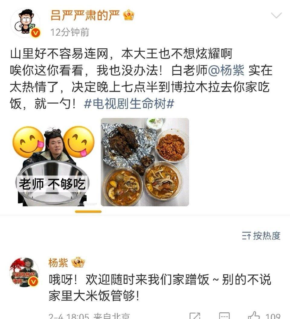 杨紫喊土豆吕严回家吃饭 当《生命树》的巡山队遇见《大王别慌张》的喜剧人,博拉木拉的星空下连笑声都带着青稞饼的香气!杨紫这一声“回家吃饭”,喊出了剧粉双厨狂喜的终极境界——原来保护区的羊、巡山队的枪、喜剧人的梗,最后都汇成了一碗热腾腾的团圆饭。今晚,我们都是博拉木拉饭搭子!