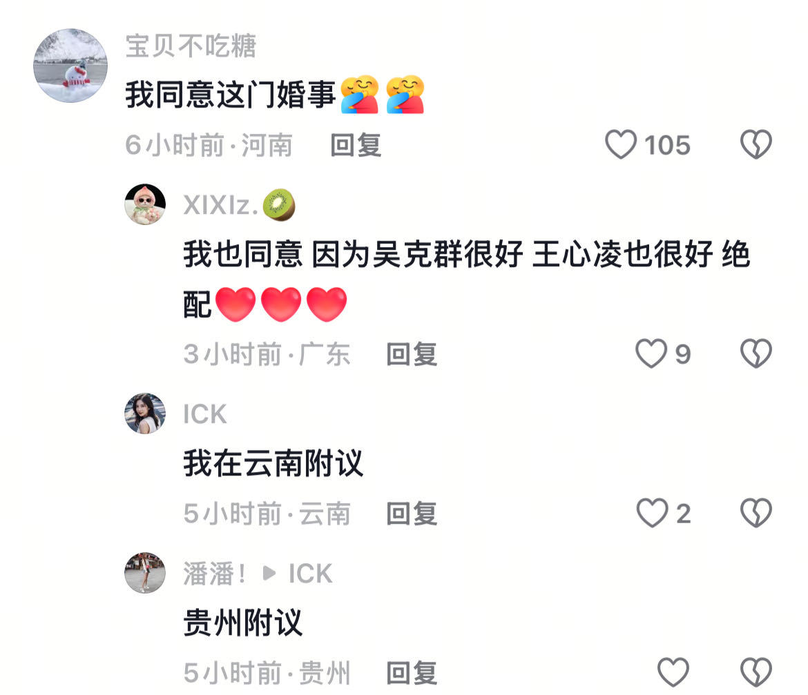 王心凌 吴克群 吴克群王心凌被拍同住,全国网友集体排队刷“这门亲事我同意”,随出去的份子钱都够办100场婚礼了有没有~有人说这大概是内娱近几年民心所向程度TOP1的明星情侣,还有好多用自己爱担名义随份子钱,别@ 了人醒来天塌了哈哈
