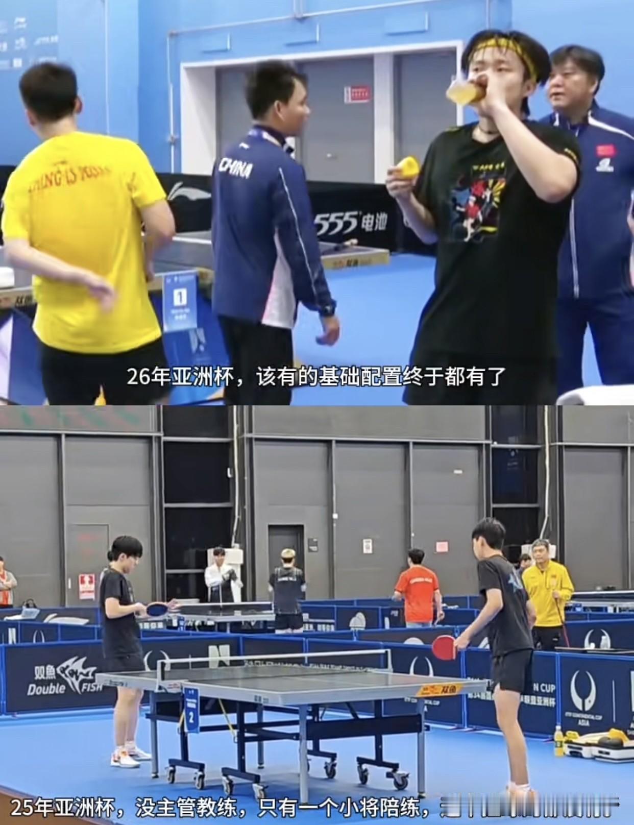 被这一幕感动到哭,王楚钦也终于有教练帮忙做这些了。 25年亚洲杯,没有教练在身边,只有一名小将在陪练。 26年的亚洲杯,看到孙逊,牛牛,杨教练在身边,真的是被感动了。 孙逊拿着拍子给交拍,挑球,然后验比赛服,这些王楚钦都可以不用亲自去了, 可以留出一点时间,静静地思考一下。 绝对主力的配置好像现在才有,一路走来其实也蛮苦的。 相信未来会更好,加油王楚钦!