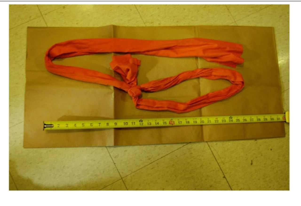(图一)是爱泼斯坦精心制造的勒死自己的用狱衣布料制造的条状物,然后他"自杀"时不小心"甲状软骨断裂"。