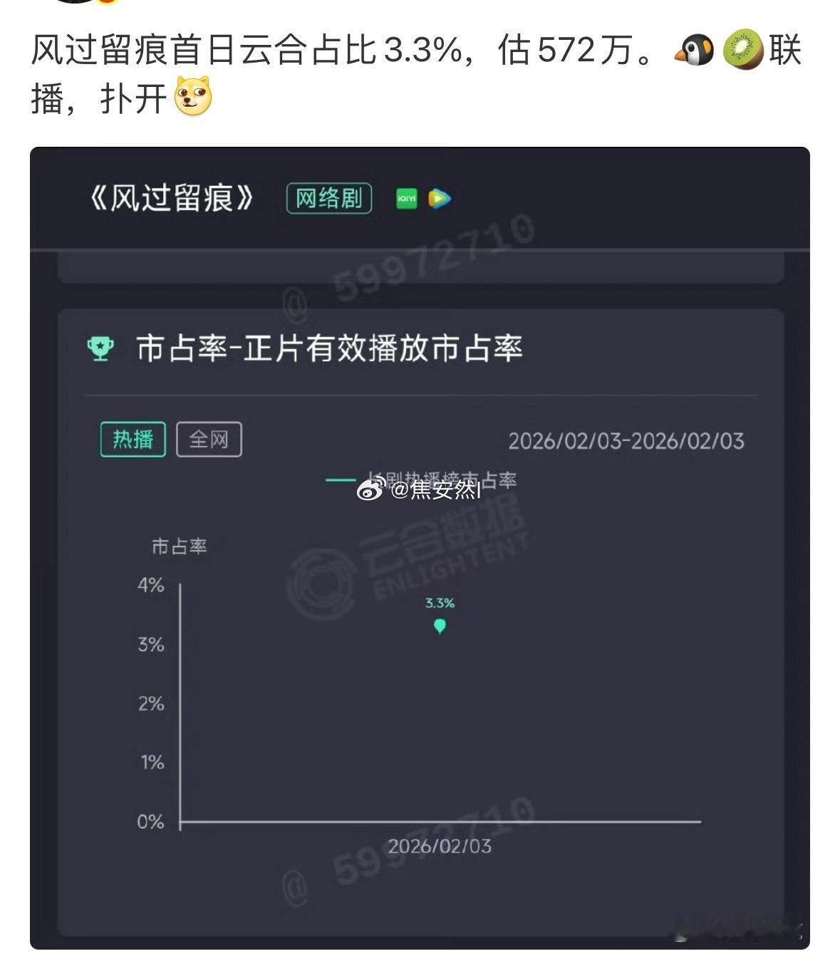 风过留痕刑侦剧也算热门,双平台加一起播放量才500w+,招商还萝卜感觉龚俊好像自从安乐传之后就一直在扑剧,安乐传有点那啥啊云合