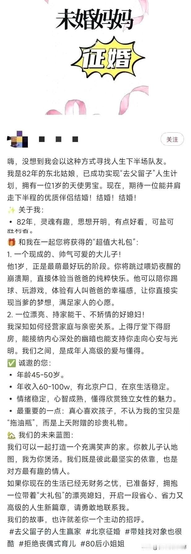 82年“未婚妈妈”(儿子一岁)征婚条件:北京户口,年收入60~100万[黑线] 虽然说“心有多大,舞台就有多大”但这位东北“未婚妈妈”的心,也太大了! 44岁,有一个一岁儿子。 要求对方还是北京户口,年收入60~100万。 有这个条件的男性,又有几个还是未婚? 就算人家未婚,能看上你一个44岁的带儿子离婚妈妈。 这位“未婚妈妈”是把番茄小说《霸道总裁爱上人老珠黄还快要绝经的我》当真了。 最让我不解的是,她说好的是去父留子,既然已经成功了,还征什么婚? 缺钱了?