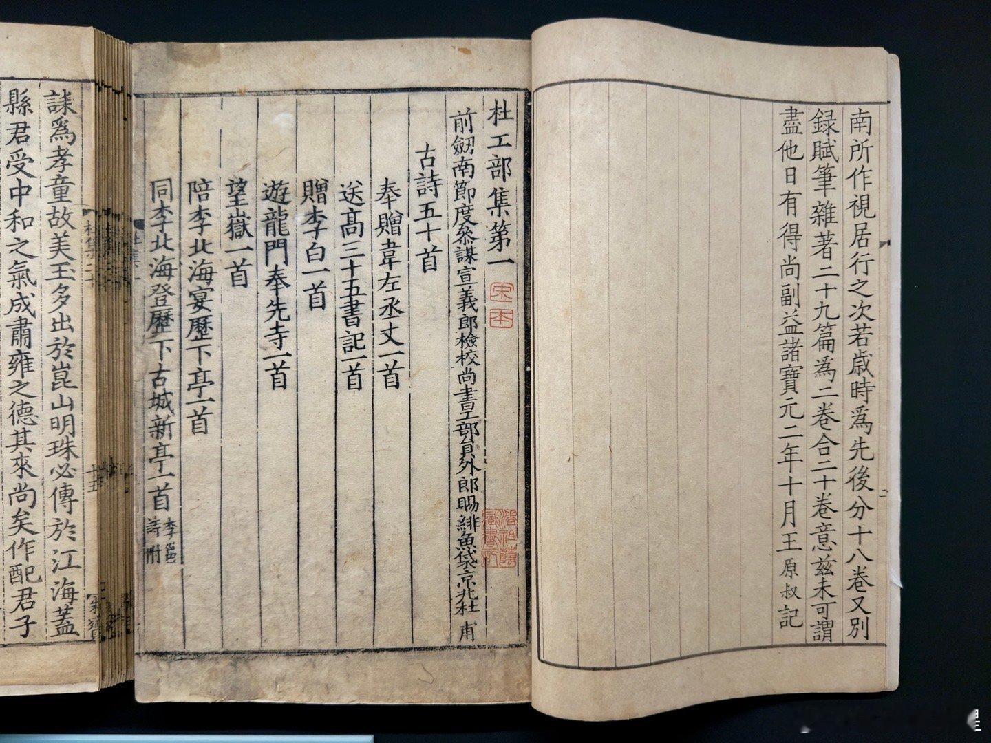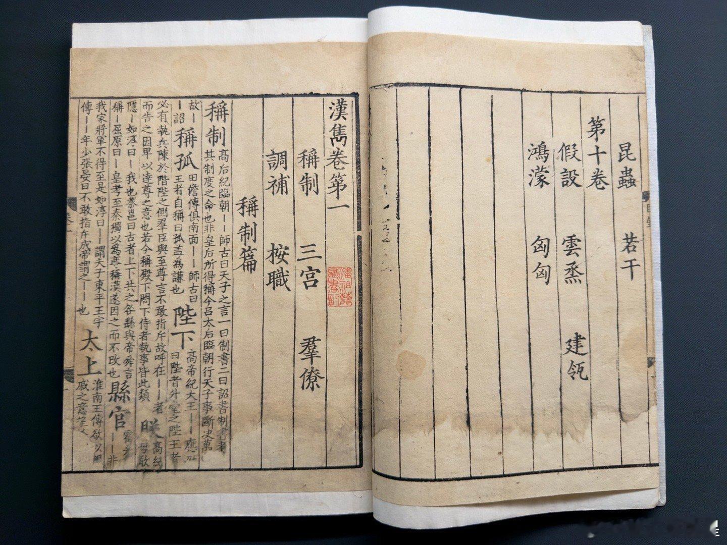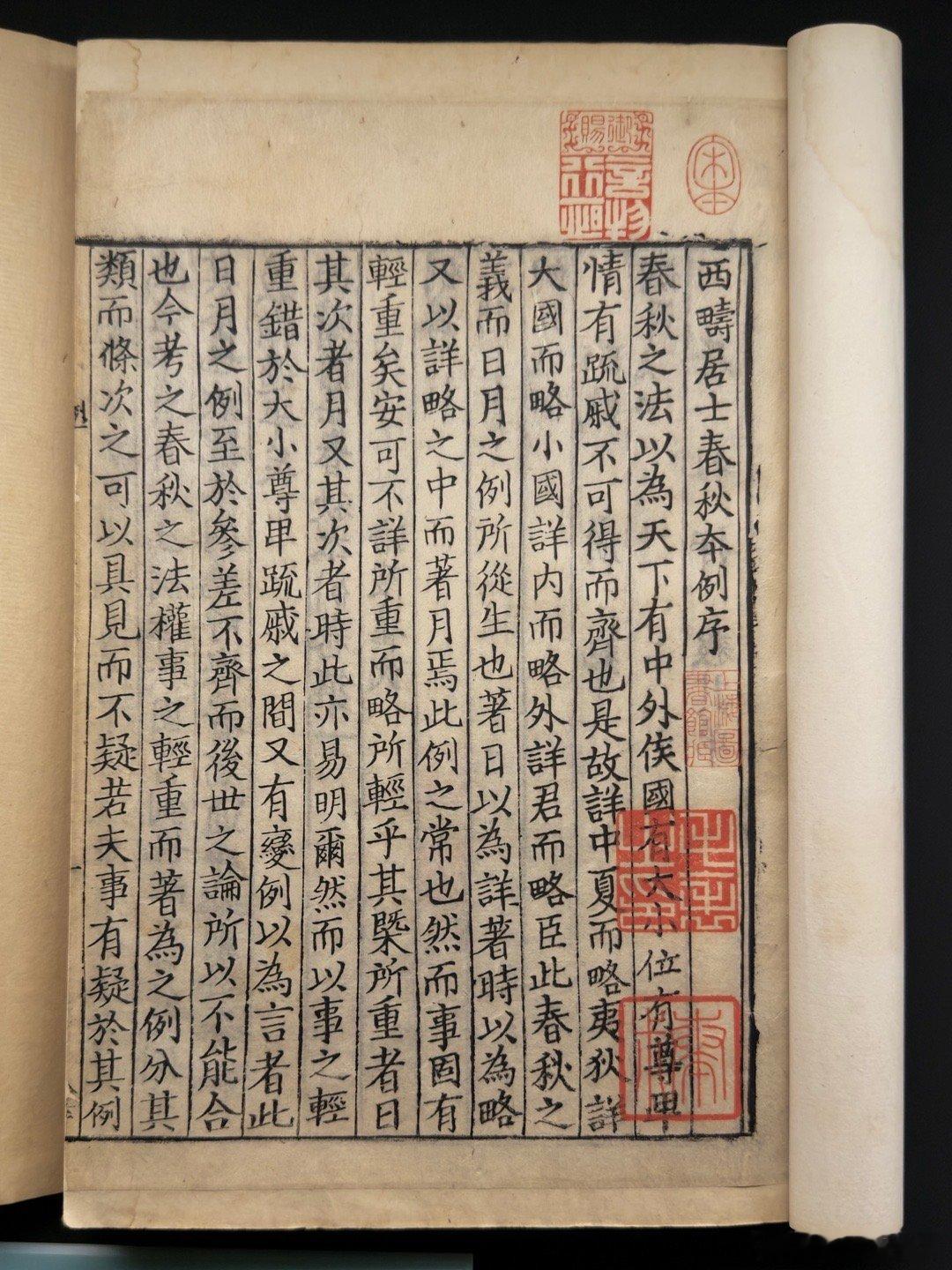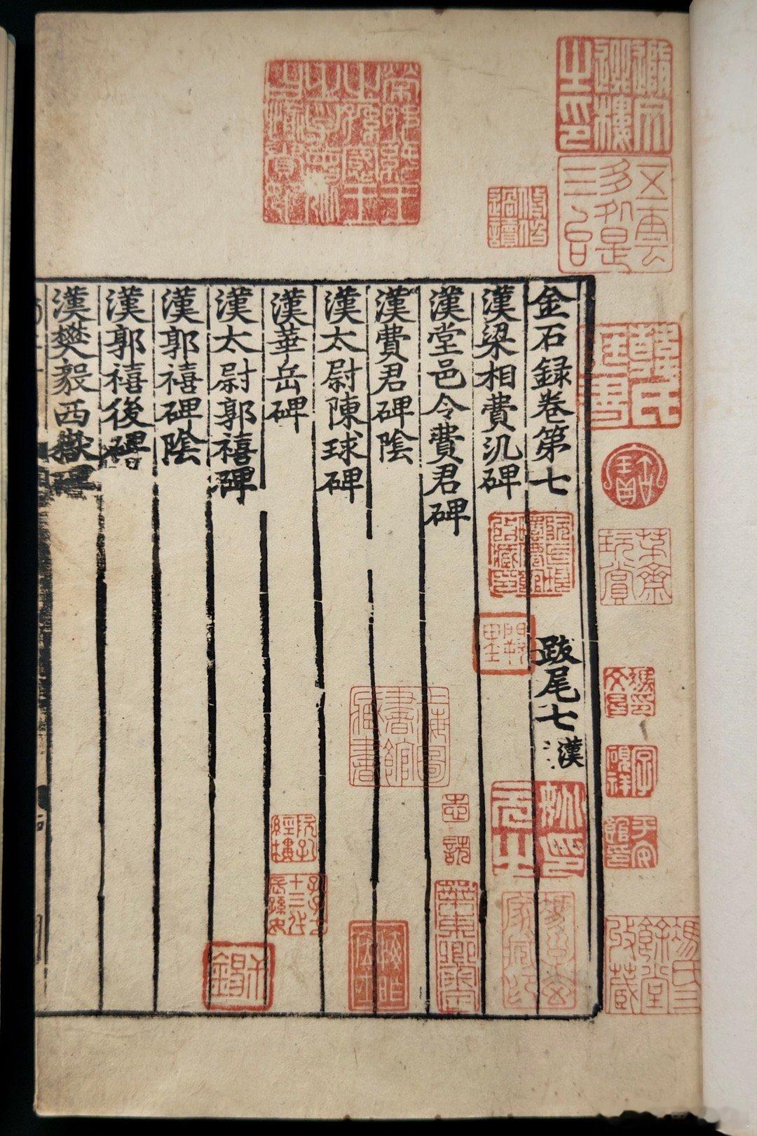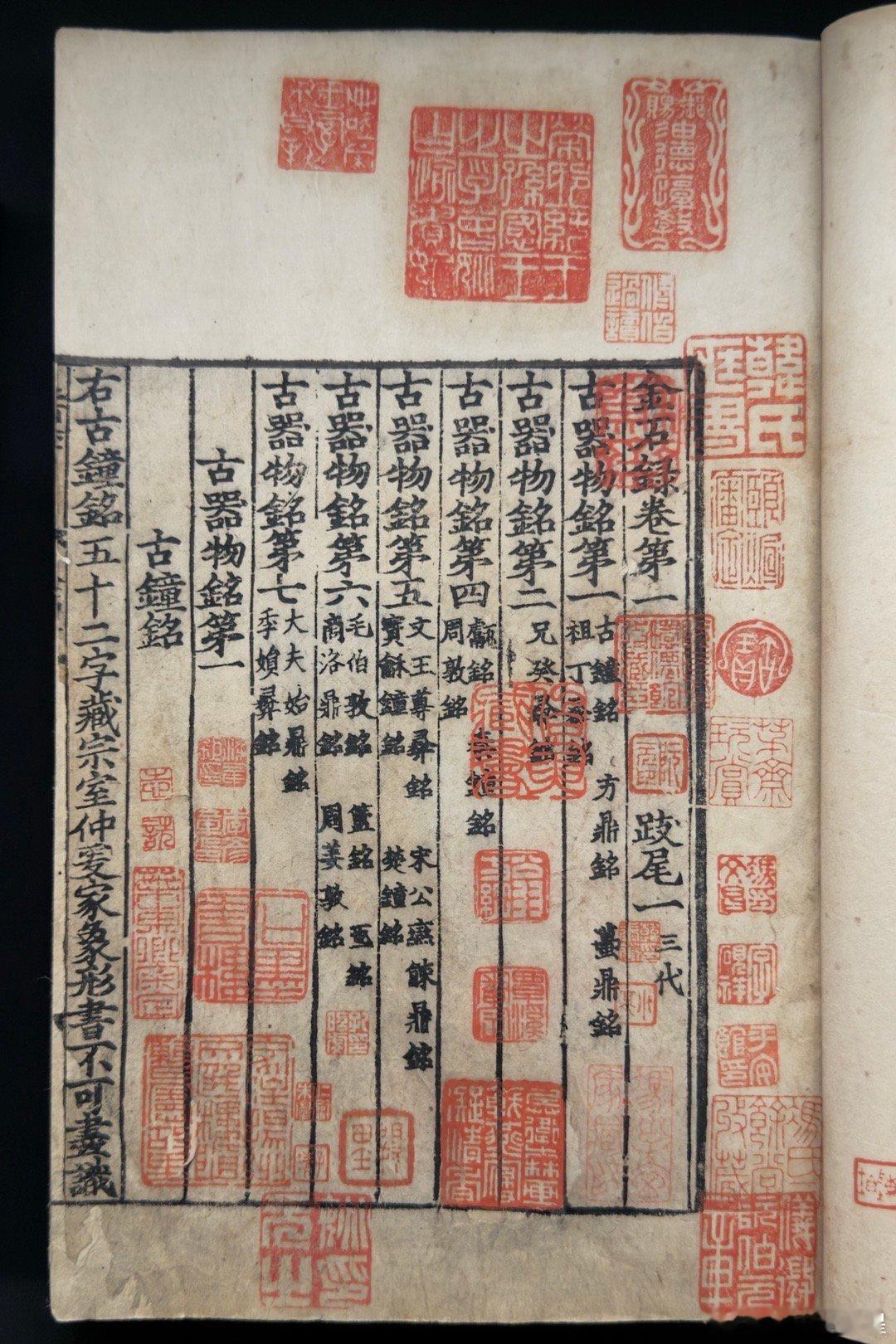 《金石录》由南宋初年的赵明诚、李清照夫妻合著,是中国古代金石学首屈一指的重要著作。李清照在赵氏去世后整理书籍,刊行问世,并撰写《金石录后序》一文。《金石录》现存最早的版本为南宋淳熙龙舒郡斋三十卷完整刻本(图1-2),藏于北京国家图书馆,堪称绝世宝物。这套足本《金石录》原藏于南京甘氏的津逮楼,但甘家有一个习惯:特别珍贵的善本,可能担心被他人觊觎,并不列入公开的目录之中,所以这套足本在古代不为人知,直到50年代才被发现,1951年被国家图书馆收藏。上海图书馆藏潘氏旧藏十卷本(图3、4、6)为国图版本的后印修补本,内容包括原书的卷十一至卷二十,缺失开头的十卷目录,以及后十卷跋尾。这个版本是历代珍藏的宝物,印章盖了三百多方,但是被造过假,第十一卷被改成了第一卷。《金石录》存世宋刻仅此二种,此次一起展出,非常难得。