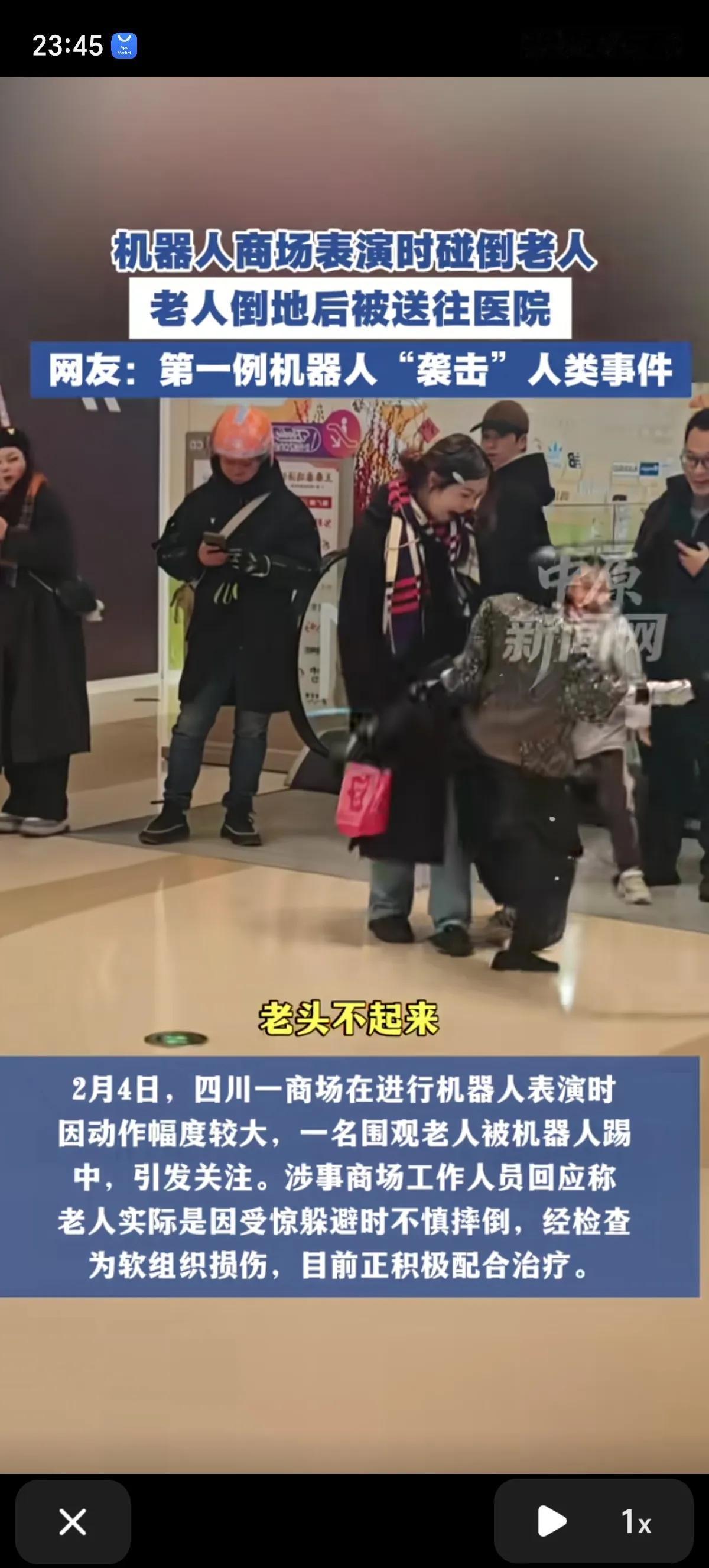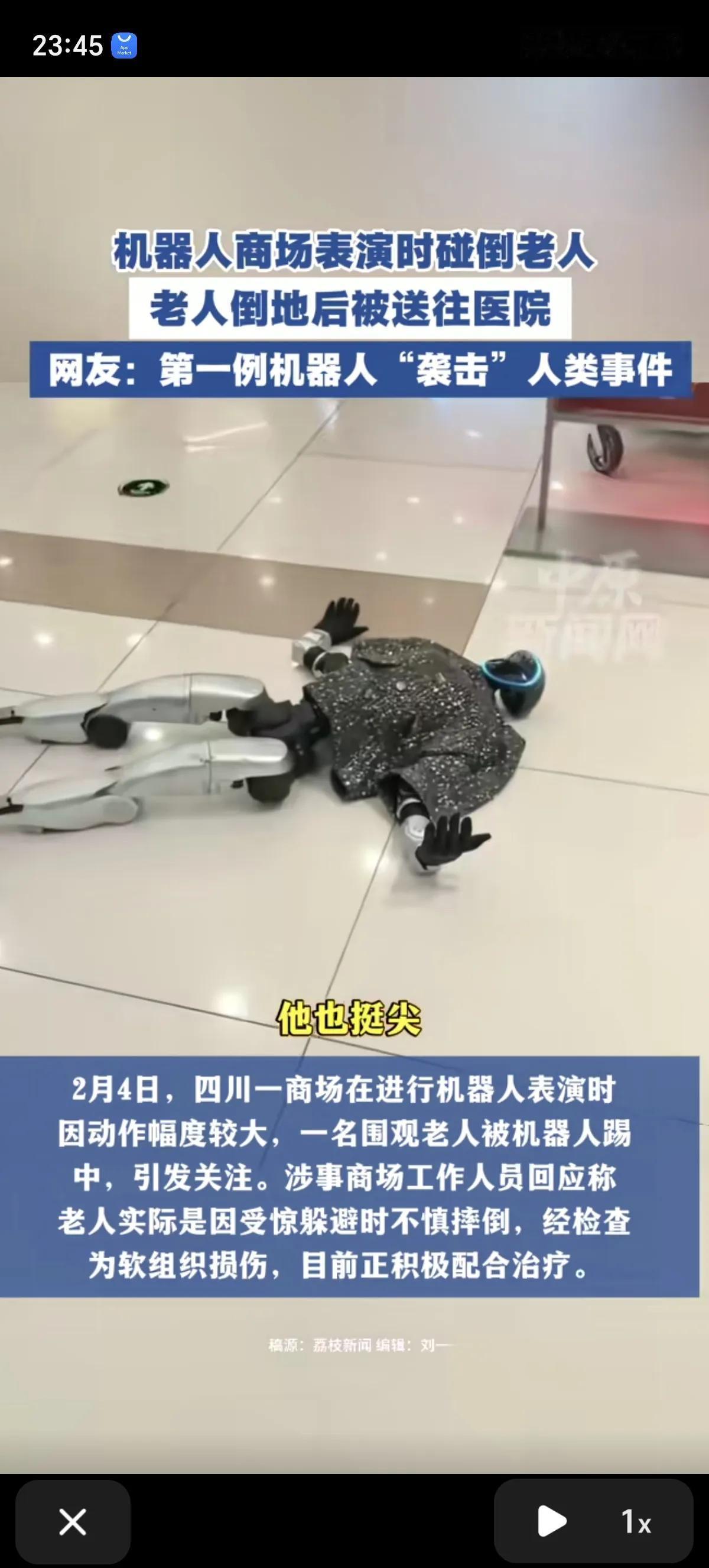 机器人都学会碰瓷老头了,第一例机器人“袭击”人类的的事情出现了。2月4日四川某商场一个机器人表演舞蹈时没控制好动作幅度,把一个正在看表演、还没反应过来的老人踢倒了。 机器人一看自己闯祸了,反应十分迅速,很聪明的倒地不起。主打一个老头不不起来,它就不起来。老头坐着不起来,它就平躺着不起来,一动不动。 这是2月4日发生在四川成都凯德广场(魅力城店)的事情,商场内一商户组织人形机器人表演时,一位围观的老人被向他走来的机器人吓到,在跨步躲避的过程中与机器人发生碰撞,导致老人和机器人双双倒地。 老人被送往医院检查,确诊为软组织挫伤,目前已经出院了,商家目前正在积极配合后续治疗。 闯祸的机器人已送回公司,商场后续的机器人表演也已暂停。