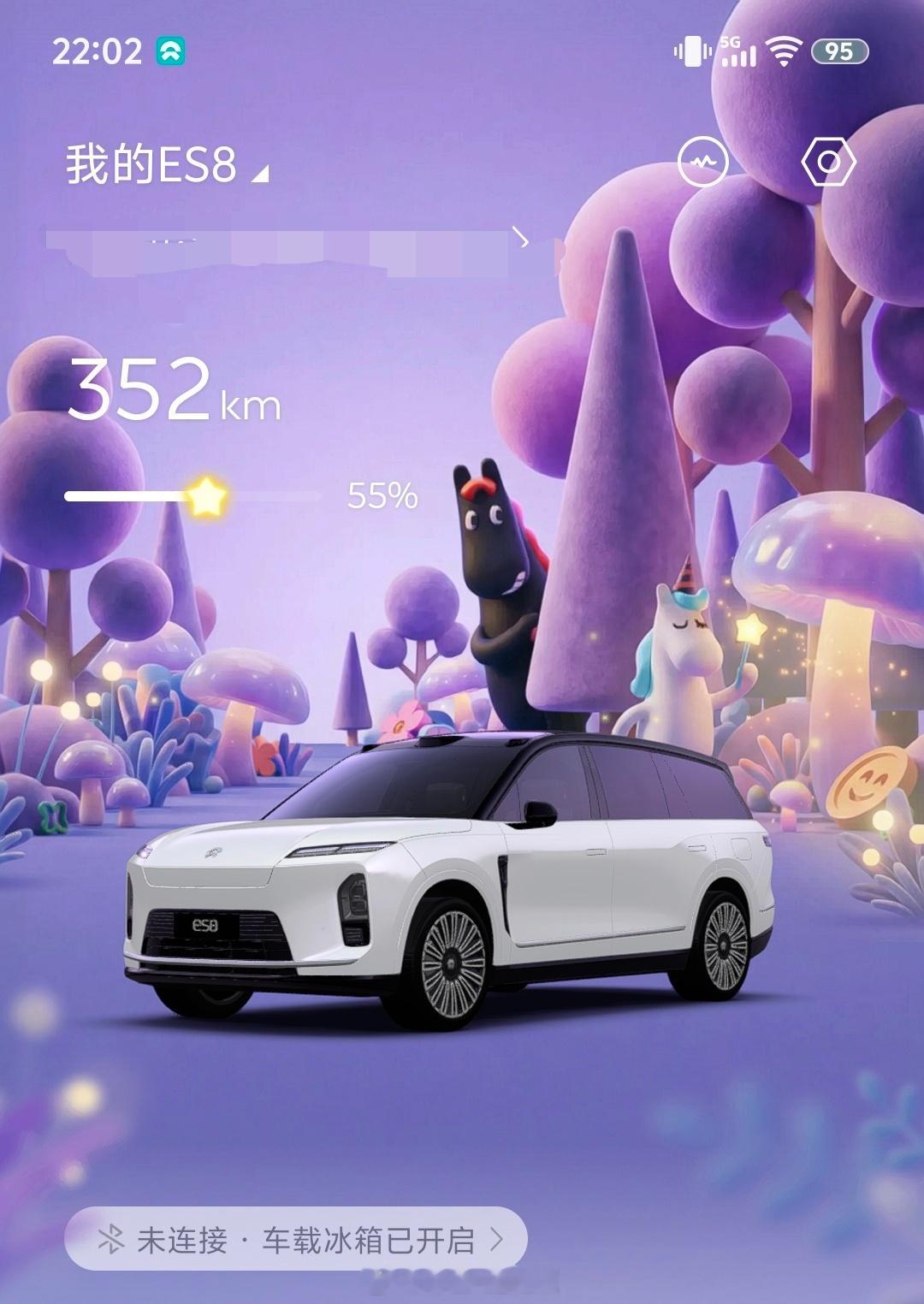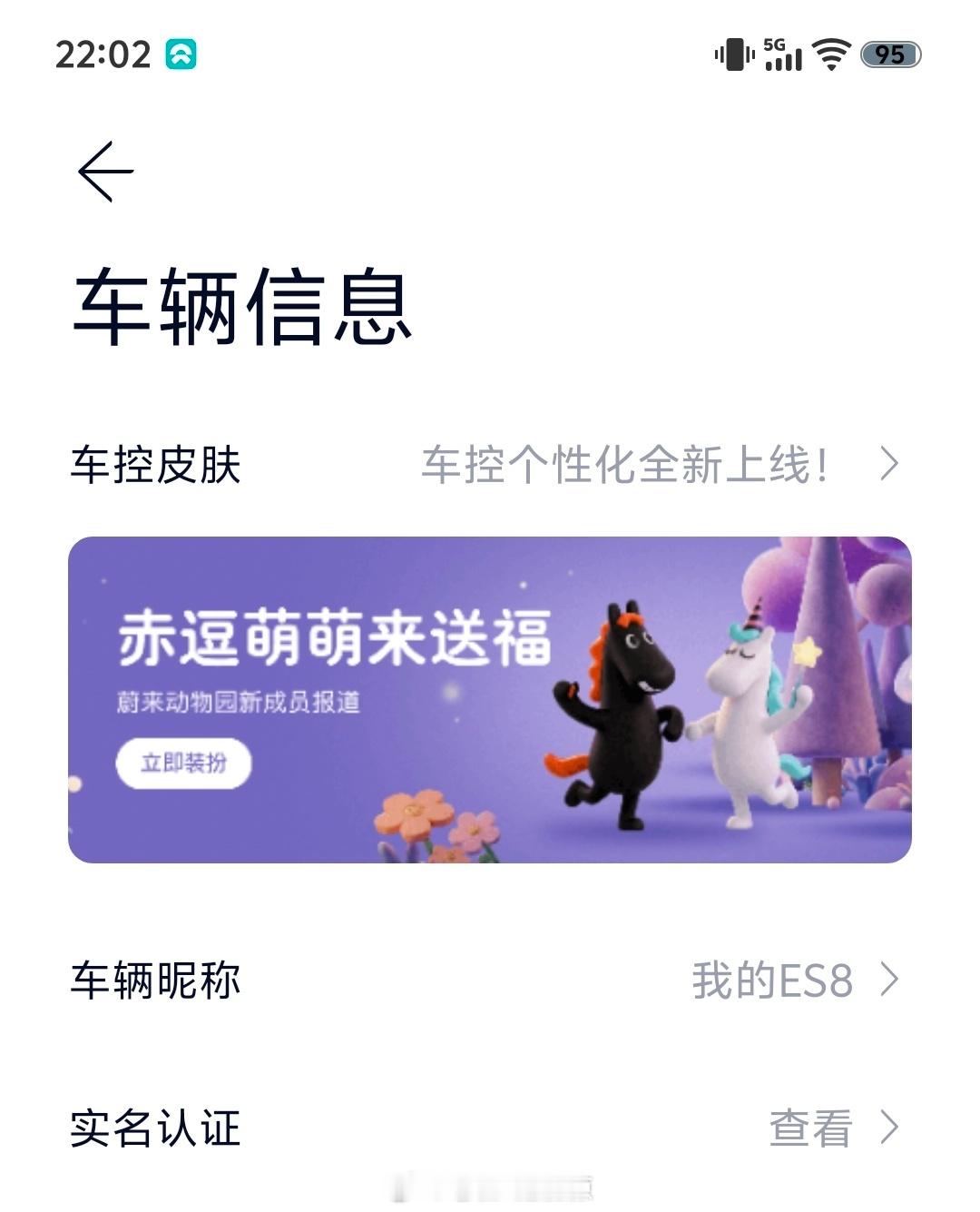 蔚来APP车控页面更新,有主题皮肤了~目前有两款,一款是赤豆萌萌的,紫色系,一款