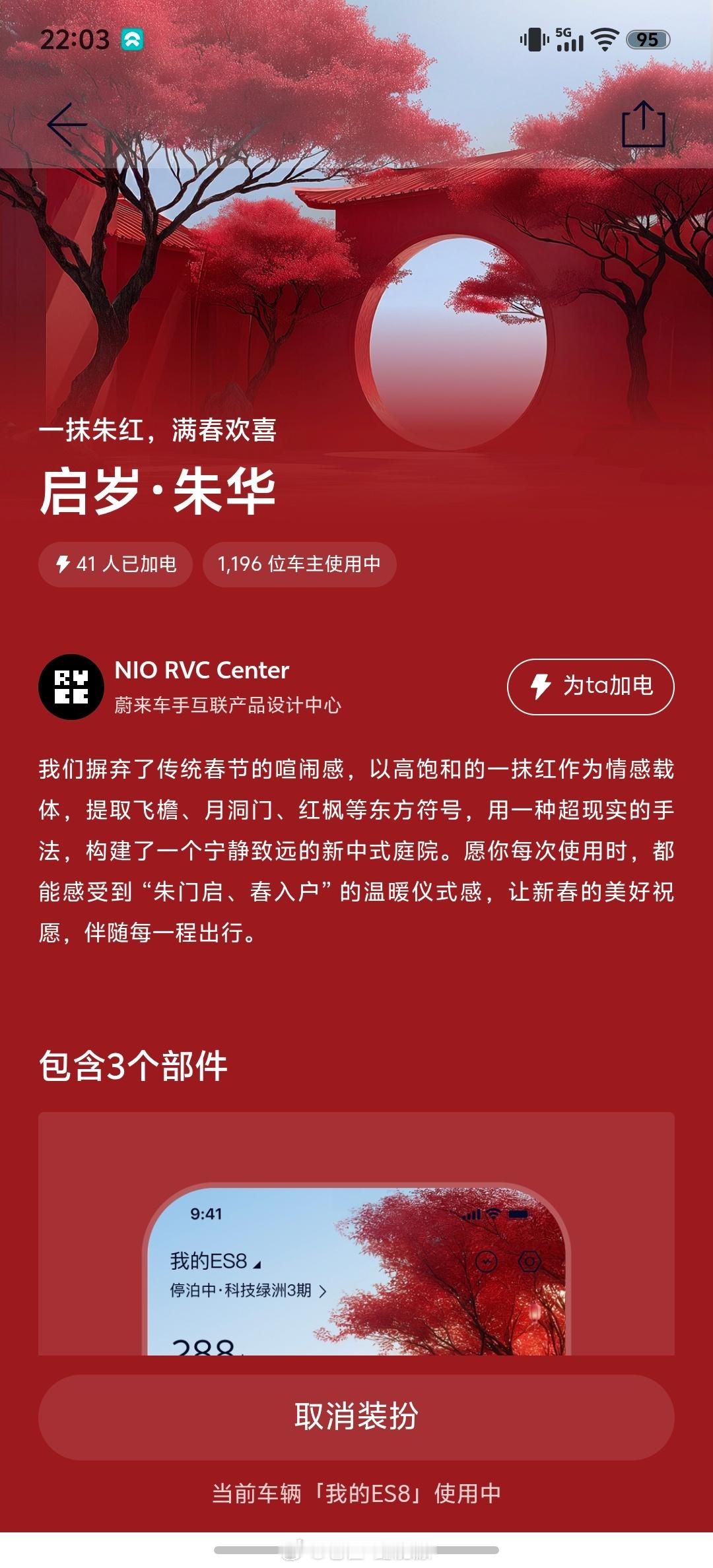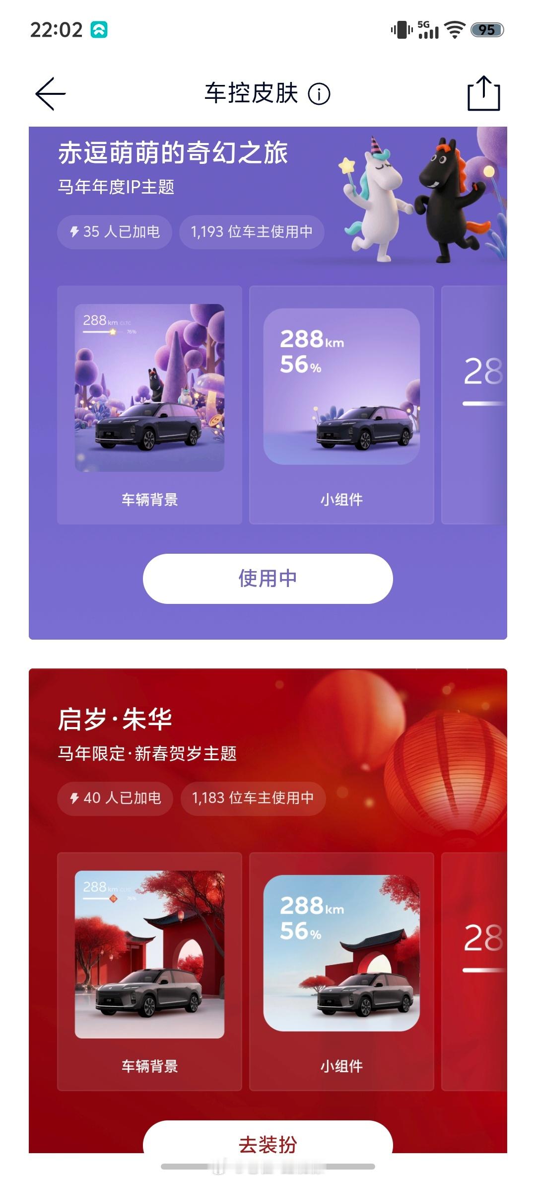 蔚来APP车控页面更新,有主题皮肤了~目前有两款,一款是赤豆萌萌的,紫色系,一款是启岁朱华,红色系的过年皮肤