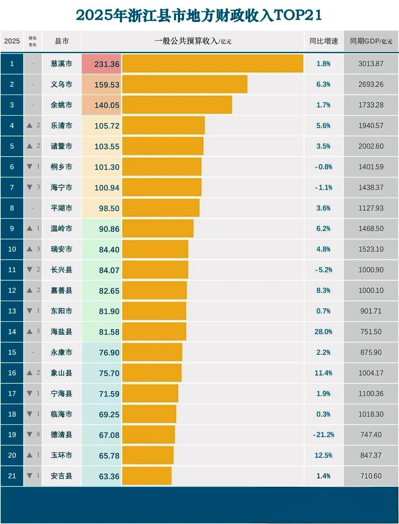 2025年浙江地方财政收入最多的21个县市——从表中排名及数据来看,很多县市日子越来越难过!有你家乡吗?