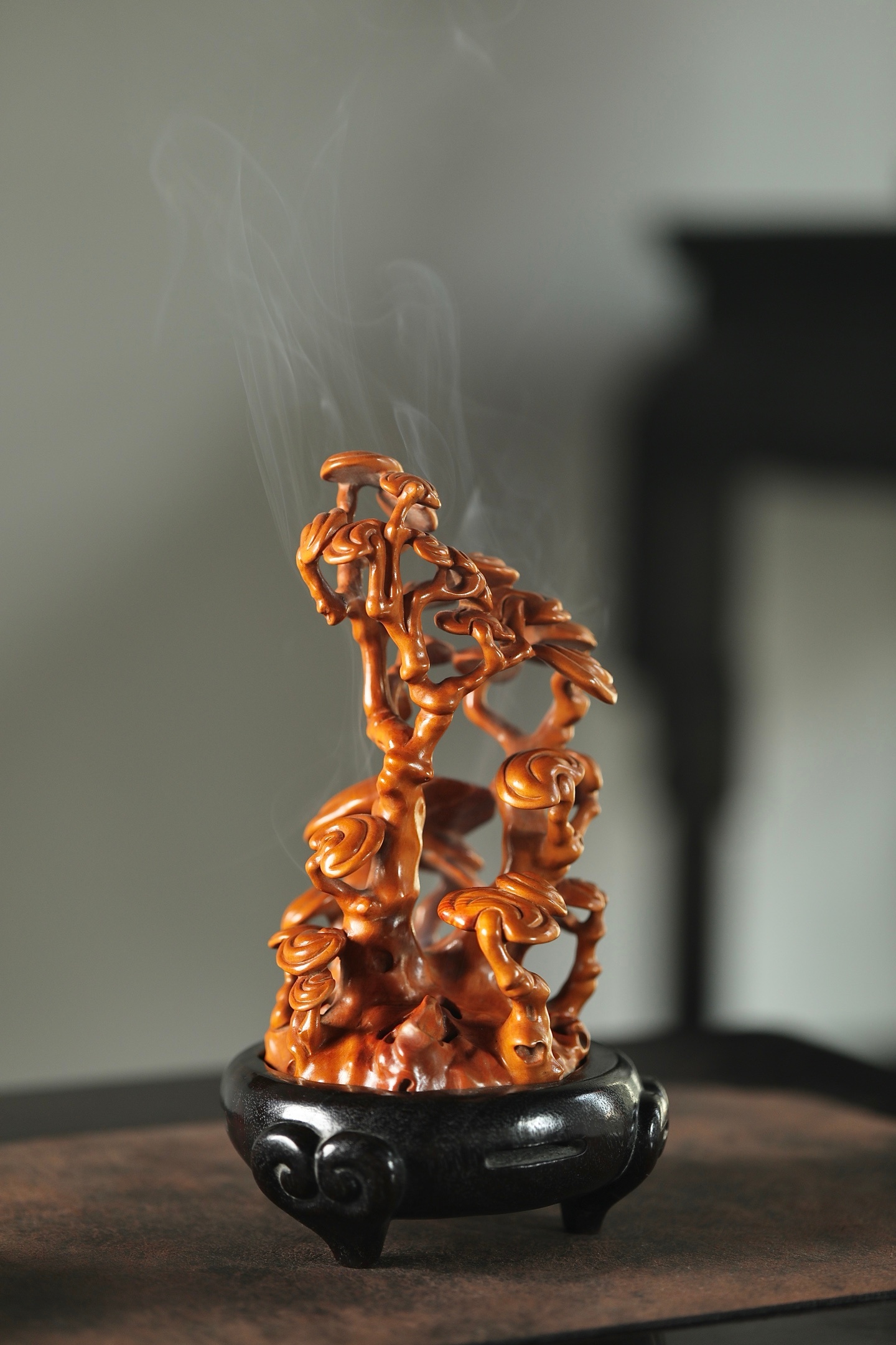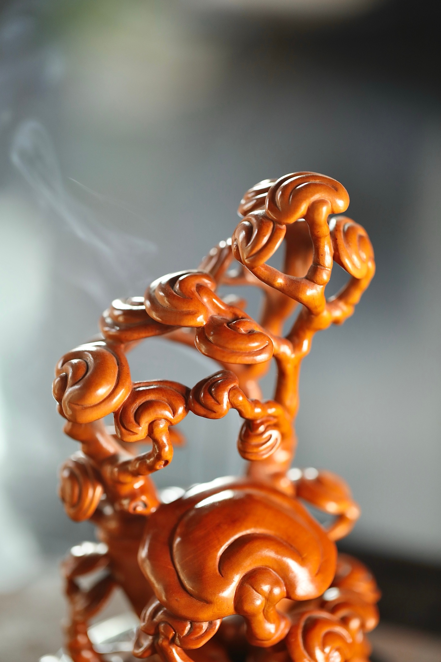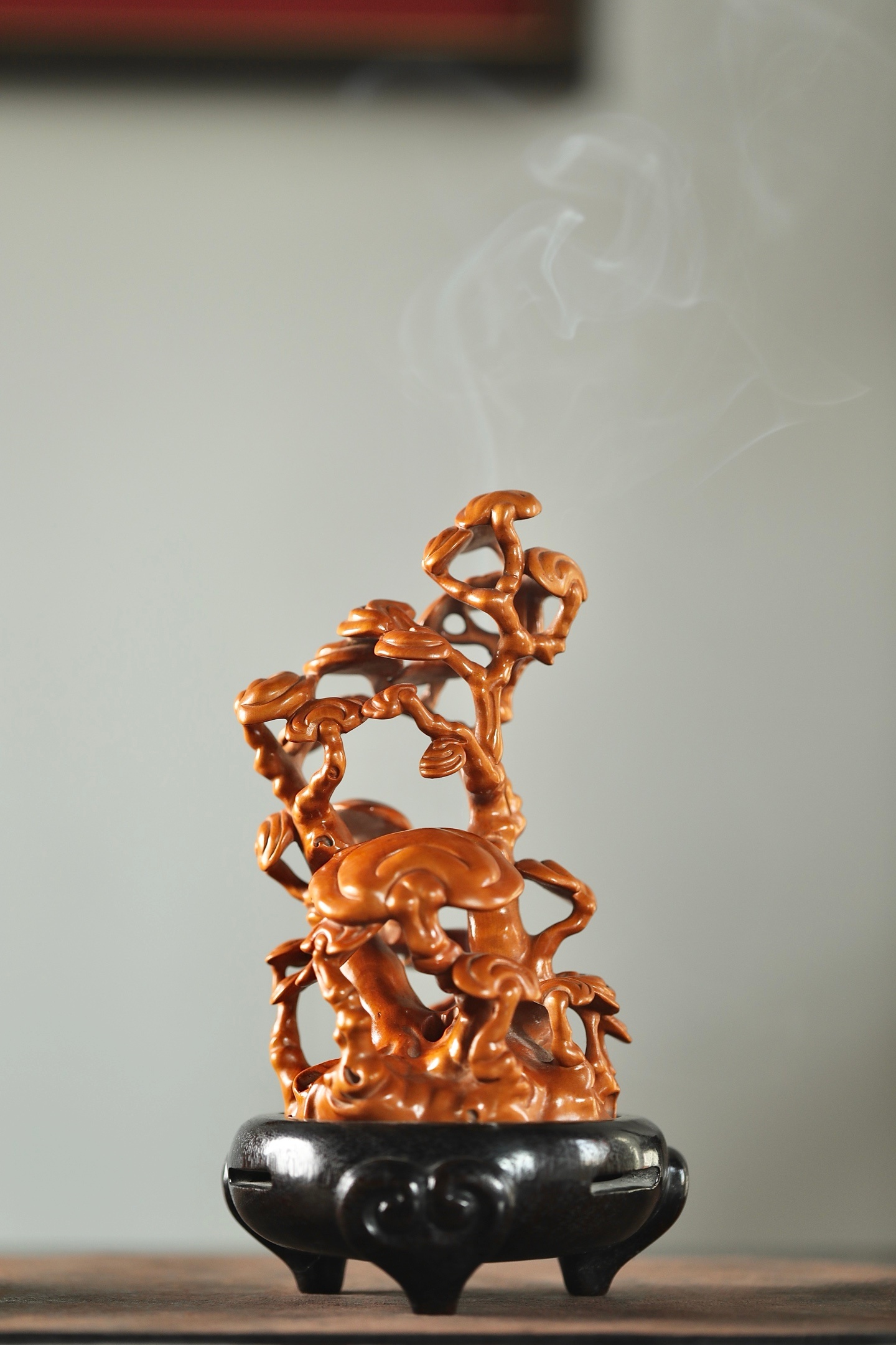 一木成山,一器生香。黄杨木灵芝香炉,以天然木性摹灵芝仙姿,青烟自镂空枝隙间漫出,如云雾绕山。木色暖润,意趣清雅,藏“芝兰玉树,福寿绵长”之愿,静室焚香,自成一方雅境。