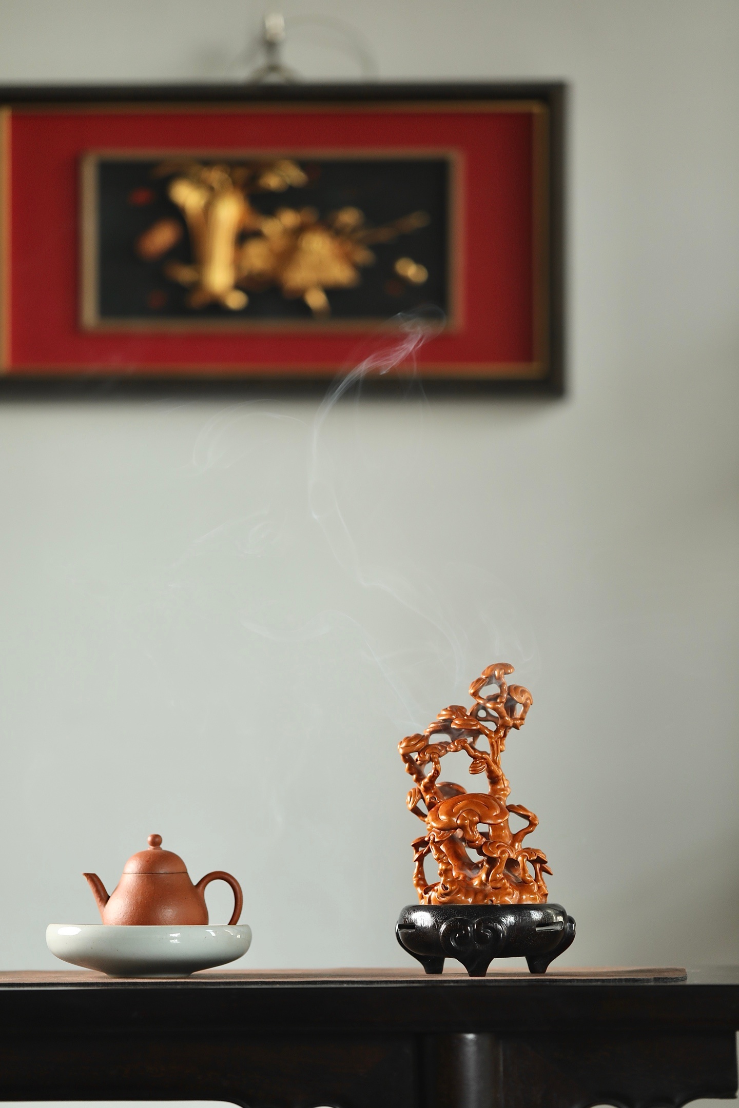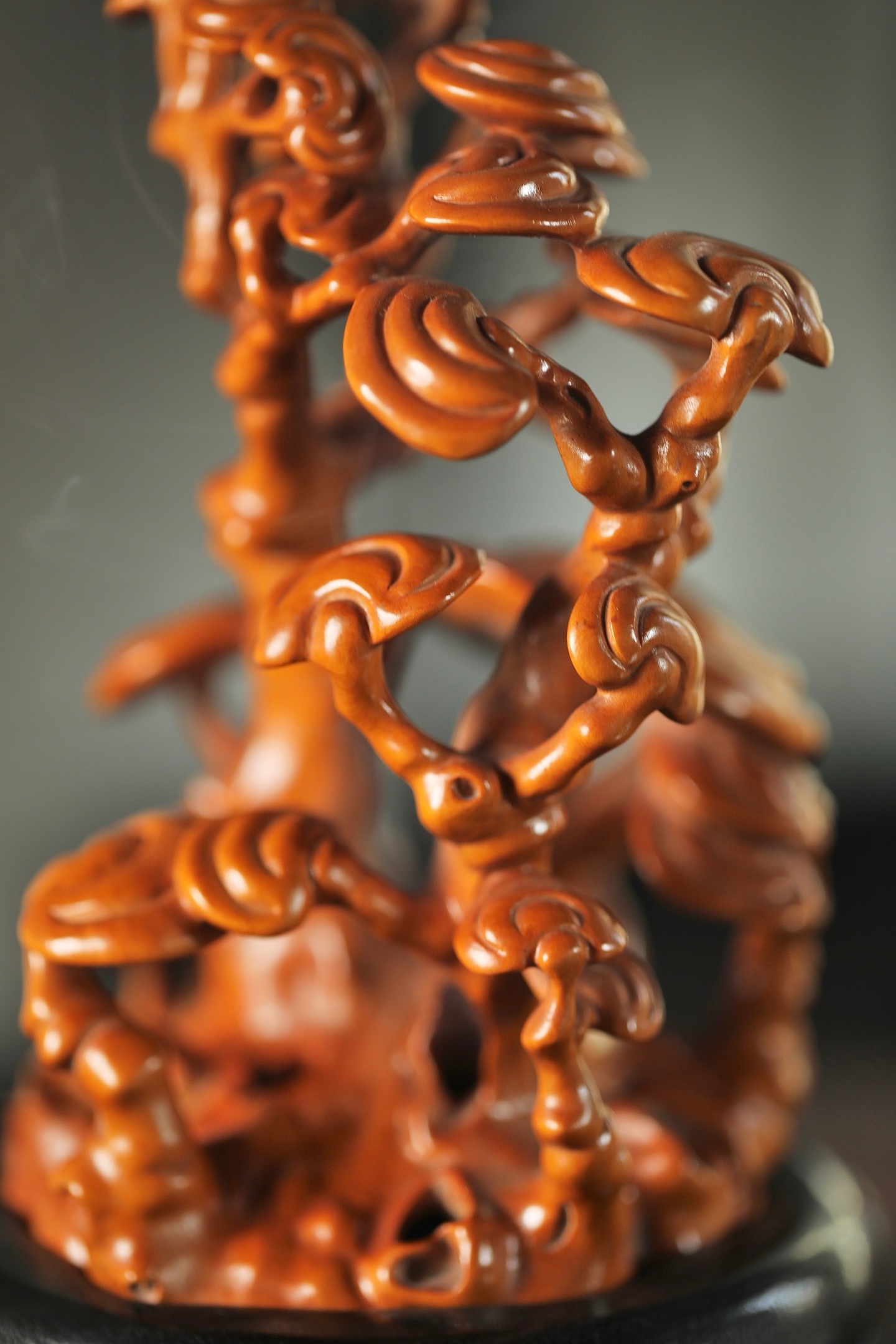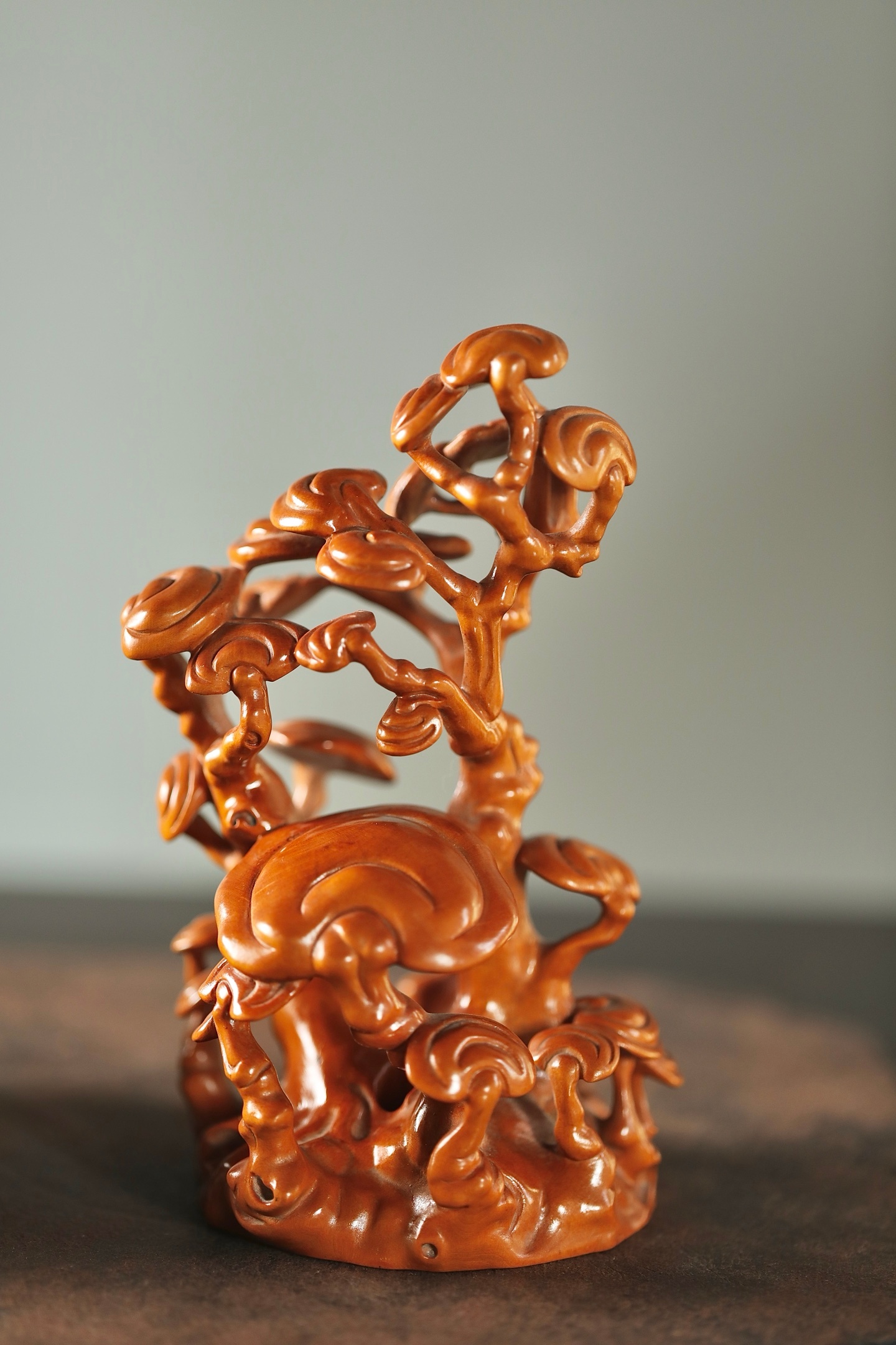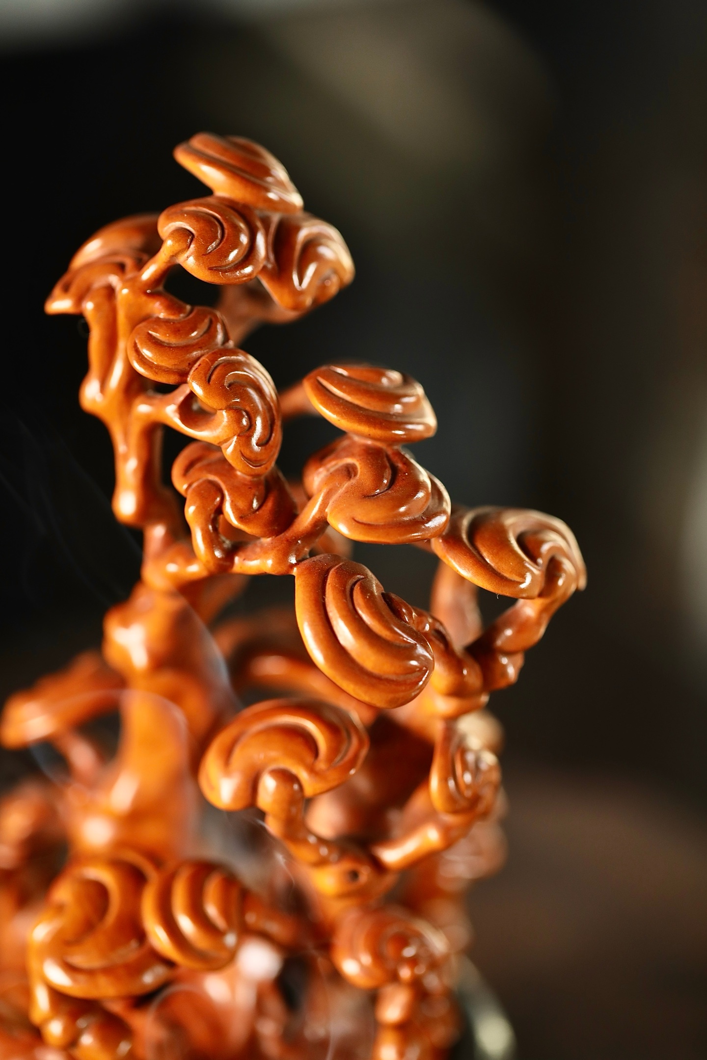 一木成山,一器生香。黄杨木灵芝香炉,以天然木性摹灵芝仙姿,青烟自镂空枝隙间漫出,如云雾绕山。木色暖润,意趣清雅,藏“芝兰玉树,福寿绵长”之愿,静室焚香,自成一方雅境。