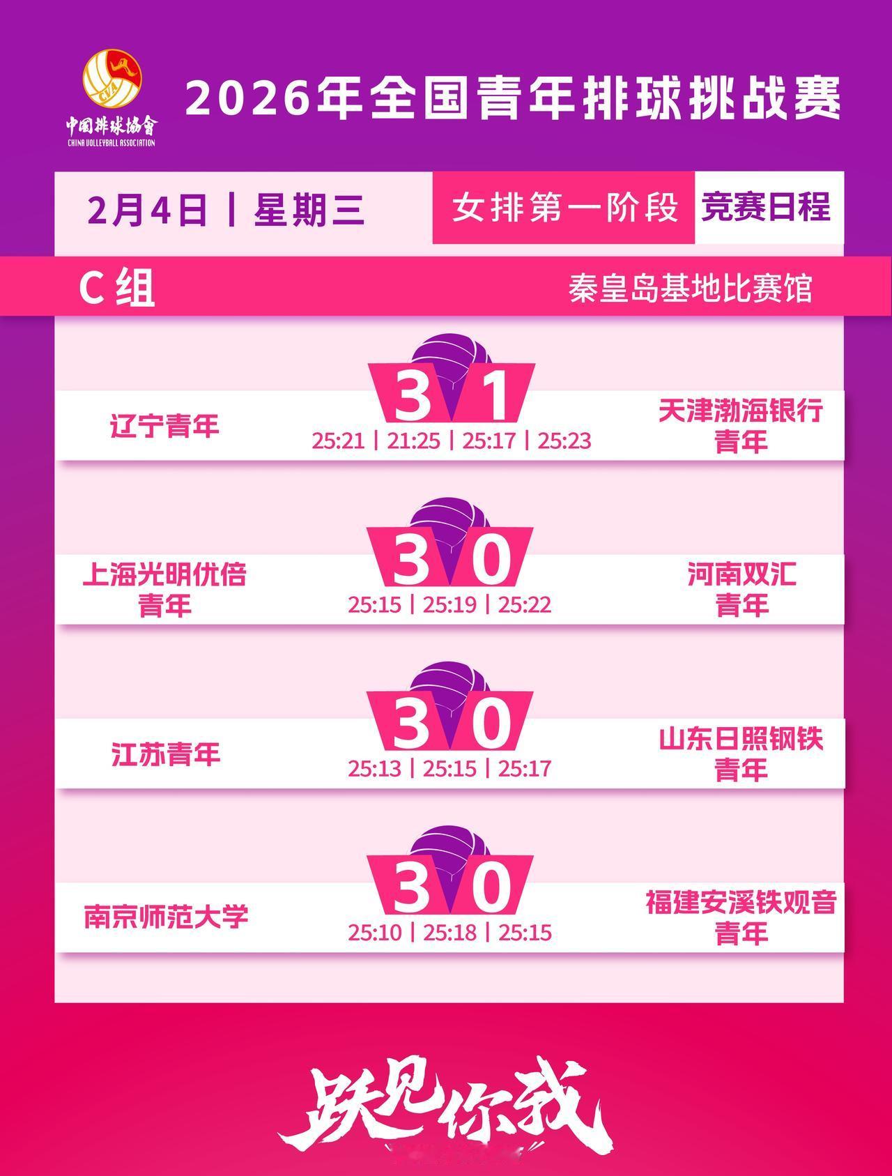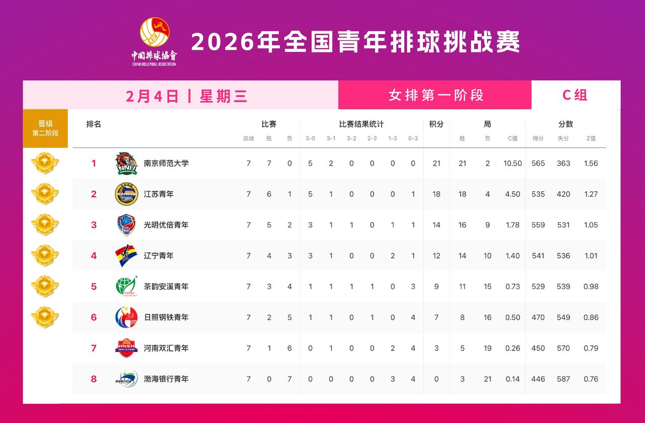 【全国青年女排挑战赛六强诞生】 全国青年女排挑战赛第一阶段排名赛战罢 B组前四南师大、江苏、上海与辽宁 对阵A组前四全部都喜提四连胜! 这A组也太水了吧~ 最终以上四队加上福建和山东 六队晋级第二阶段的较量! 1胜6负排名第7的河南 以及0胜7负排名垫底的天津被淘汰 殷娜作为领队和助理教练 心里肯定不是滋味儿~ 辽宁女排队长张美涵发挥不错 除了南师大成年队的戴思聪 张美涵在新一代主攻里面数据突出 得分榜第3、扣球榜第2、一传榜第8 辽宁另一位主攻张煜发挥也不赖 得分榜第7、扣球榜第8、发球榜第并列第3 拦网榜是江苏青年队小有名气的陈晓辉 总得分29、局均1.26 最后一轮2月4日赛果见附图 只有辽宁在天津身上丢了一局