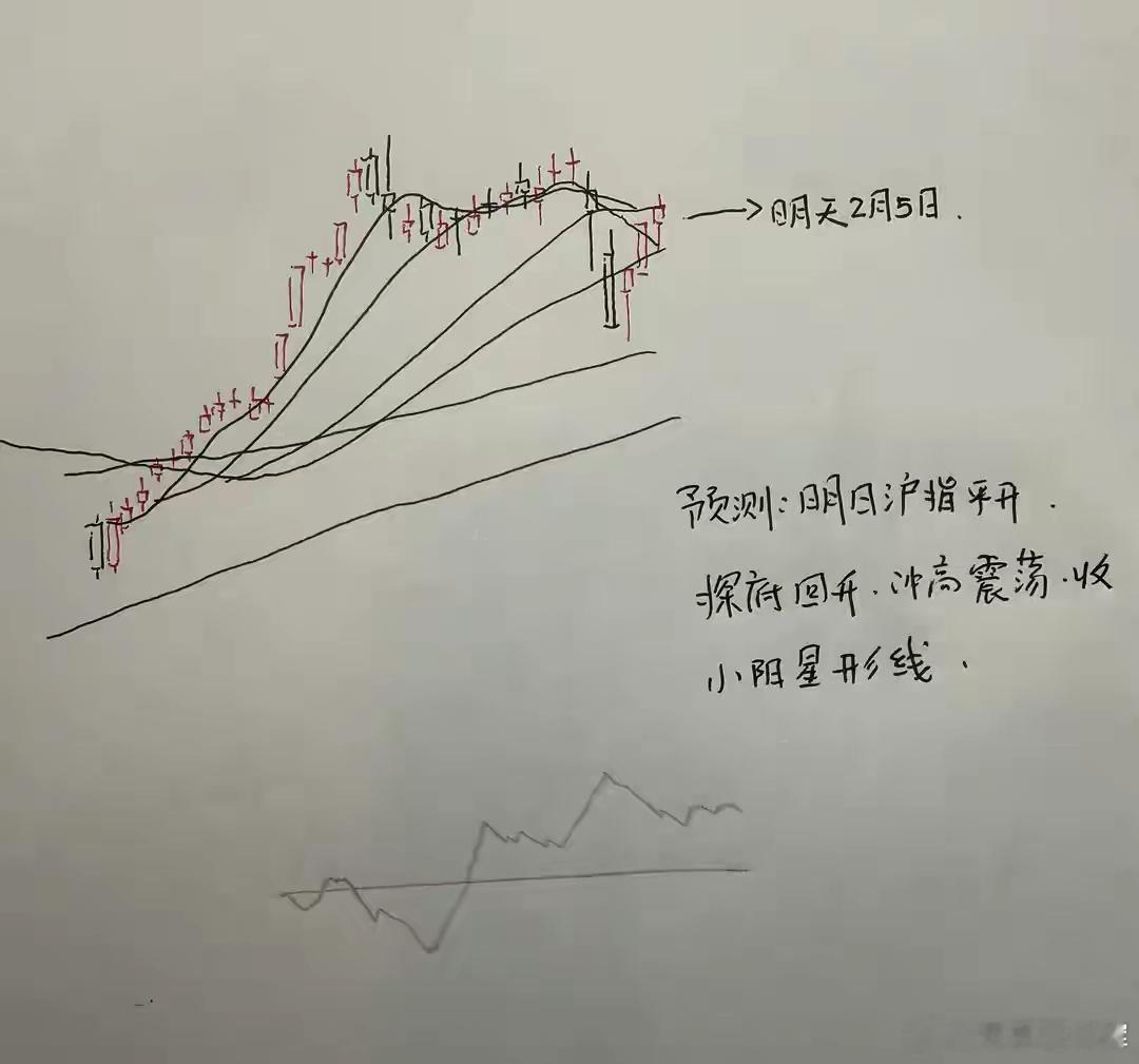 所以综合以上分析,对于明天市场的走势,我维持相对乐观的判断,我认为明天上证指数或者收出一颗小实体的阳线。那么明天A股到底怎么走?大家请看关于明天走势的手绘预测图: