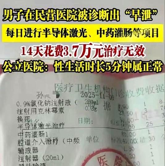 山东青岛的38岁孙先生14天掏出3.7万却没换来更长的亲密时间,正规医院一句“你没病”把他从自责拉回现实,这则报道出自红星新闻,引发了朋友圈里“到底是谁有病”的灵魂拷问。 先别忙着嘲笑,当下互联网小广告一张嘴就能给你判刑,男性时间女性塑形儿童视力都被包装成刚需焦虑,在搜索栏随手一敲就会被精准投喂,孙先生只是被算法挑中的普通样本。 问题核心不在“五分钟”而在“收费票据都不给”,按照《医疗纠纷预防和处理条例》医院必须公开诊疗项目和价目,连单子都不留等于把监管手伸在暗处,让患者连举证都无处下手。 监管部门其实也难躲锅,地方卫健委官网一年一公布的处罚名单很难跟上街头巷尾新冒出的诊所速度,信息壁垒让患者维权像打怪升级,步骤全对却总差一把钥匙。 孙先生说要走法律途径,我希望他坚持到底,也希望每一次维权都能逼着制度补洞,否则下一个把存款交出去的也许就是正在屏幕前翻评论的你。