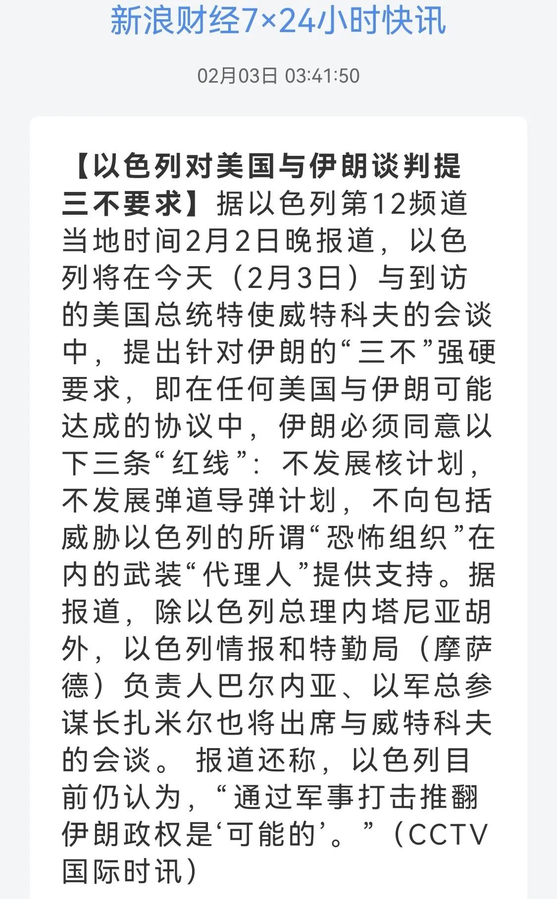 美伊核谈判破裂 军事行动早晚会来 在美伊对抗中伊朗有胜算吗 特朗普是否会真的对伊朗采取军事行动 市场消息,美伊核谈判无果。为什么呢?先看看美乙的要求。 据以色列第12频道当地时间2月2日晚报道,乙与到访的美国总统特使威特科夫的会谈中,提出针对伊朗的“三不”强硬要求,即在任何美国与伊朗可能达成的协议中,必须同意以下三条红线:1)不发展核计划,2)不发展弹道导弹计划,3)不向包括威胁乙的所谓恐怖组织在内的武装代理人提供支持。 核计划还可以挥泪斩马谡,弹道导弹也不让搞,这是斩断伊朗的防御能力,因为伊朗的防御能力威胁到乙方的安宁。再有就是不许给受乙方压迫的提供帮助,这样,伊朗怎么再做中东反抗力量的老大? 丛林法则之下,谁强大只能听谁的。伊朗不管怎么忍,都会是乙方的 眼中刺,除非 改朝换代,扶植一个听话的 小绵羊。 (图片源自网络侵权告知删除)