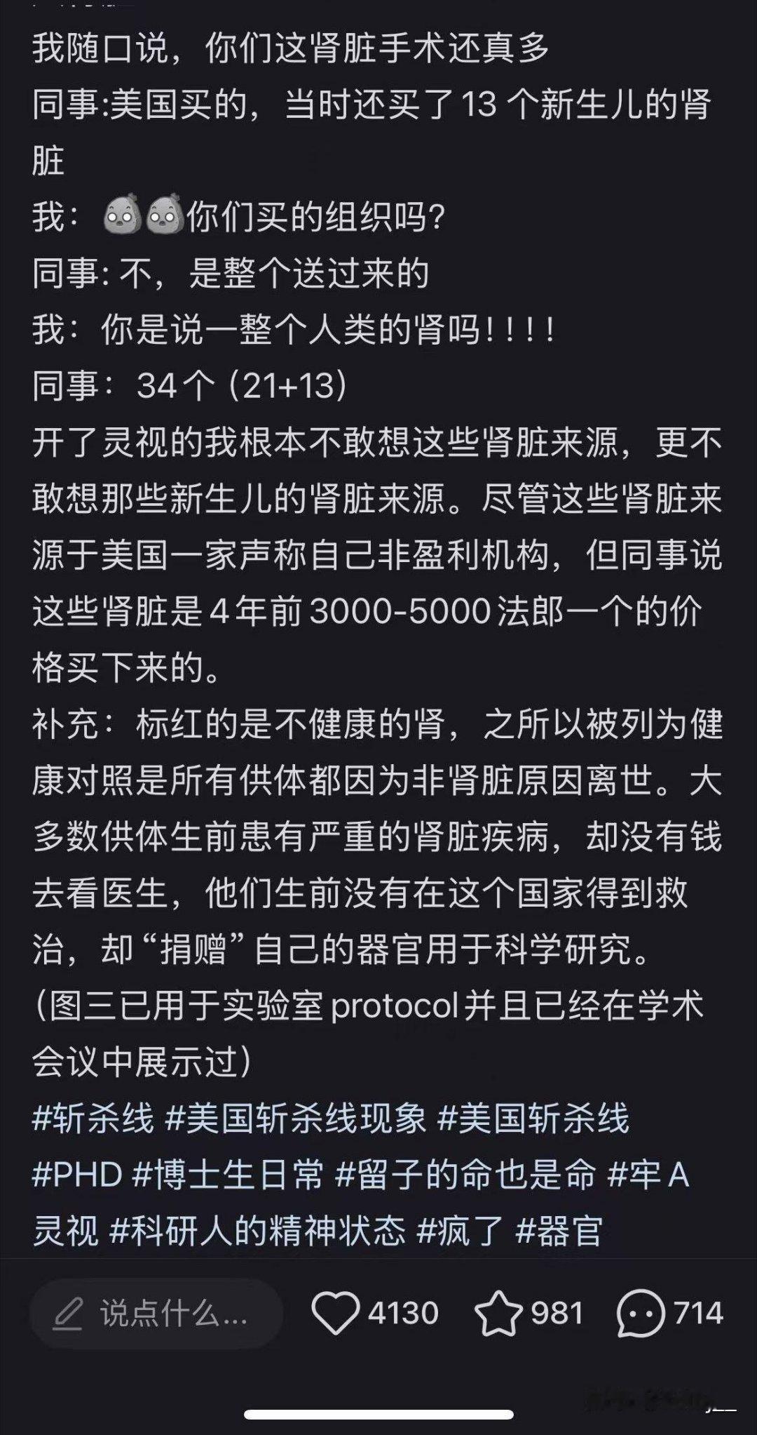 这些器官的供体生前都是因“非肾脏原因离世”的底层人群——他们活着时因贫穷无法获得医疗救治,死后器官却被“捐赠”,成了科研的耗材。