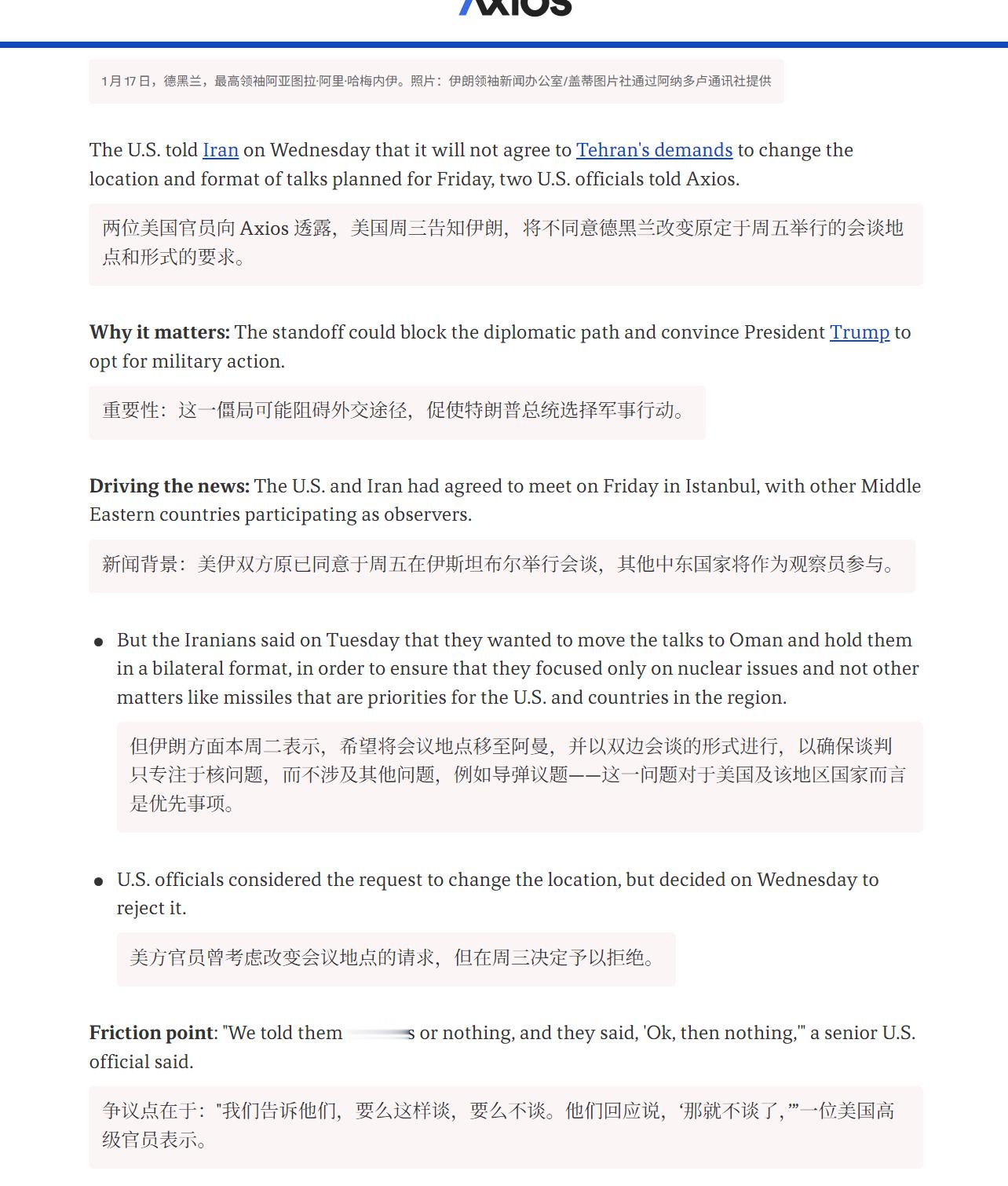 🔻金融时报:“华盛顿方面接受了德黑兰提出的将会议地点改至阿曼的马斯喀特,并将讨论范围限定于伊朗核计划(不涉及地区问题或导弹问题)的请求。鉴于双方军事紧张局势持续升级,此次会谈定于周五举行。”🔻但鲁比奥公开表示:“在我看来,为了让对话真正取得有意义的成果,就必须涵盖某些要素。其中就包括其弹道导弹的射程,并且必须停止对地区恐怖组织的支持,必须叫停核计划,并且改善伊朗国内治理的方式。”🔻随后,来自Axios新闻网的消息称:原定于周五举行的美国与伊朗核谈判因伊朗拒绝讨论非核问题而面临取消,“两位美国官员向 Axios 透露,美国周三告知伊朗,将不同意德黑兰改变原定于周五举行的会谈地点和形式的要求。美伊双方原已同意于周五在伊斯坦布尔举行会谈,其他中东国家将作为观察员参与。但伊朗方面本周二表示,希望将会议地点移至阿曼,并以双边会谈的形式进行,以确保谈判只专注于核问题,而不涉及其他问题,例如导弹议题——这一问题对于美国及该地区国家而言是优先事项。美方官员曾考虑改变会议地点的请求,但在周三决定予以拒绝。争议点在于:‘我们告诉他们,要么这样谈,要么不谈。他们回应说,那就不谈了’,一位美国高级官员表示。🔻该官员称,若伊朗方面愿意回到最初的会议形式,美国准备在本周或下周会面。“我们希望能迅速达成一个实质性的协议,否则人们就会考虑其他选择,”这位高级官员说,他指的是特朗普一再发出的军事行动威胁。伊朗称失联无人机曾传回图片伊朗总统已下令启动核谈判海外新鲜事热点现场伊朗称失联无人机曾传回图片海外新鲜事热点现场