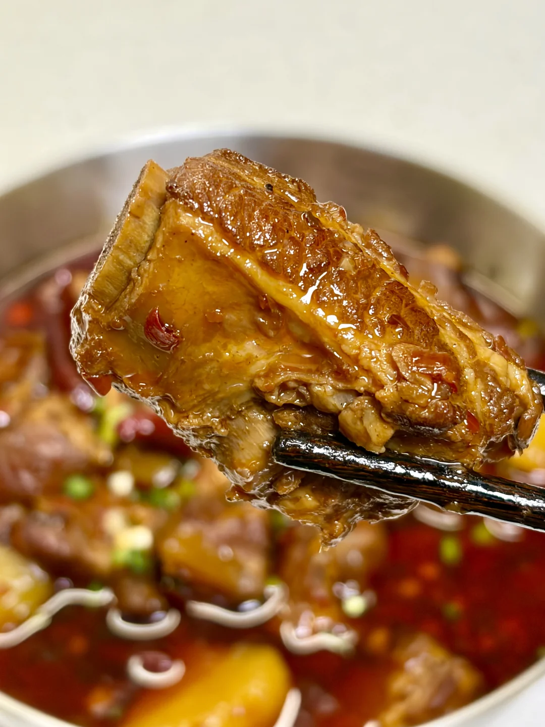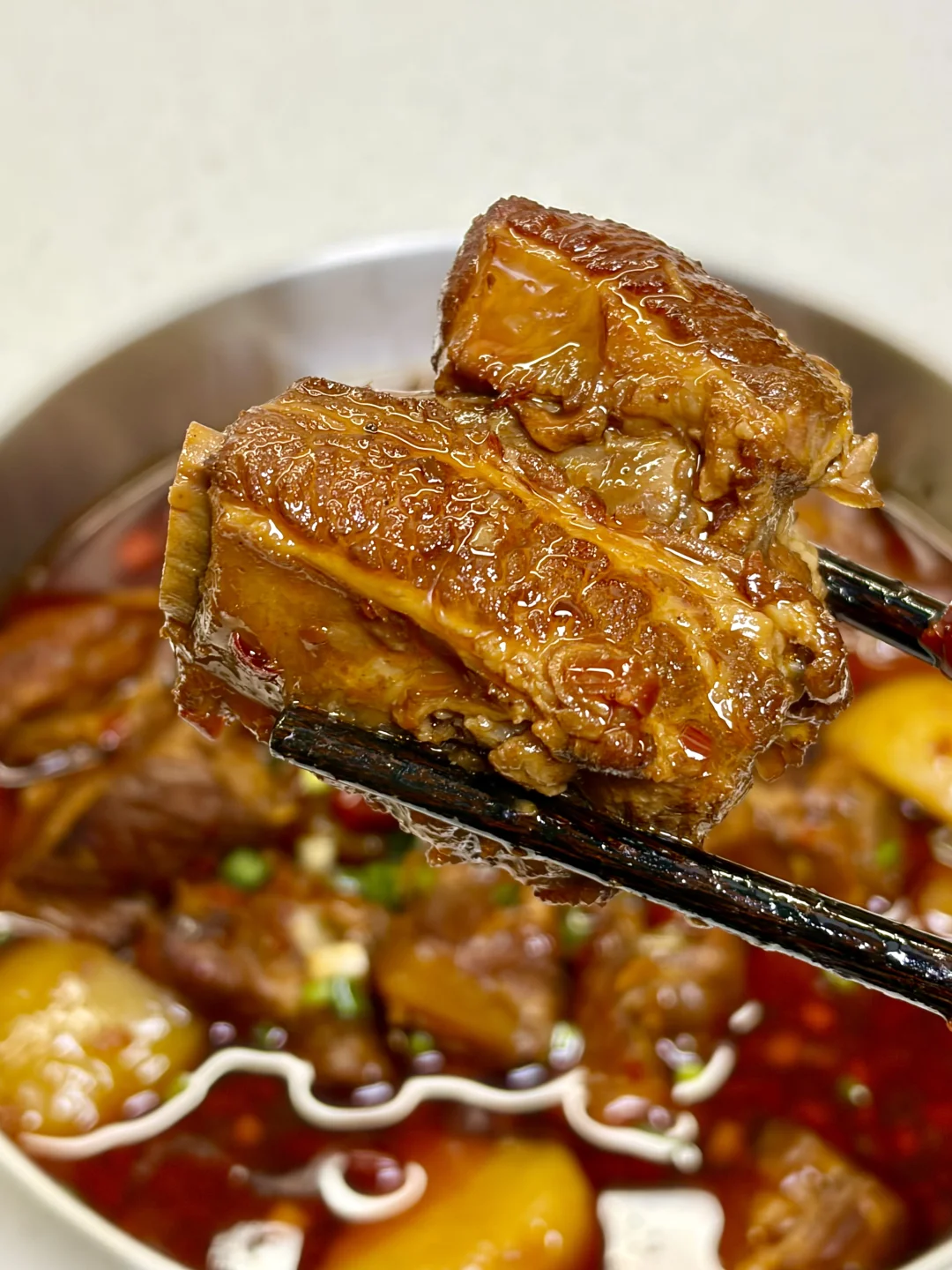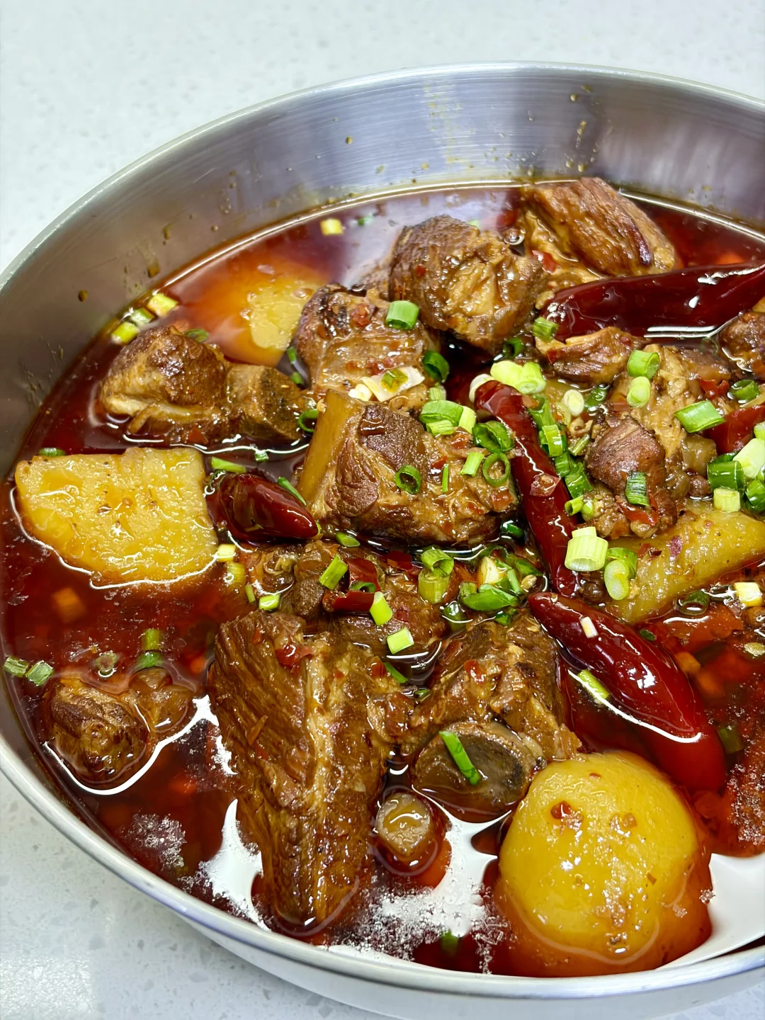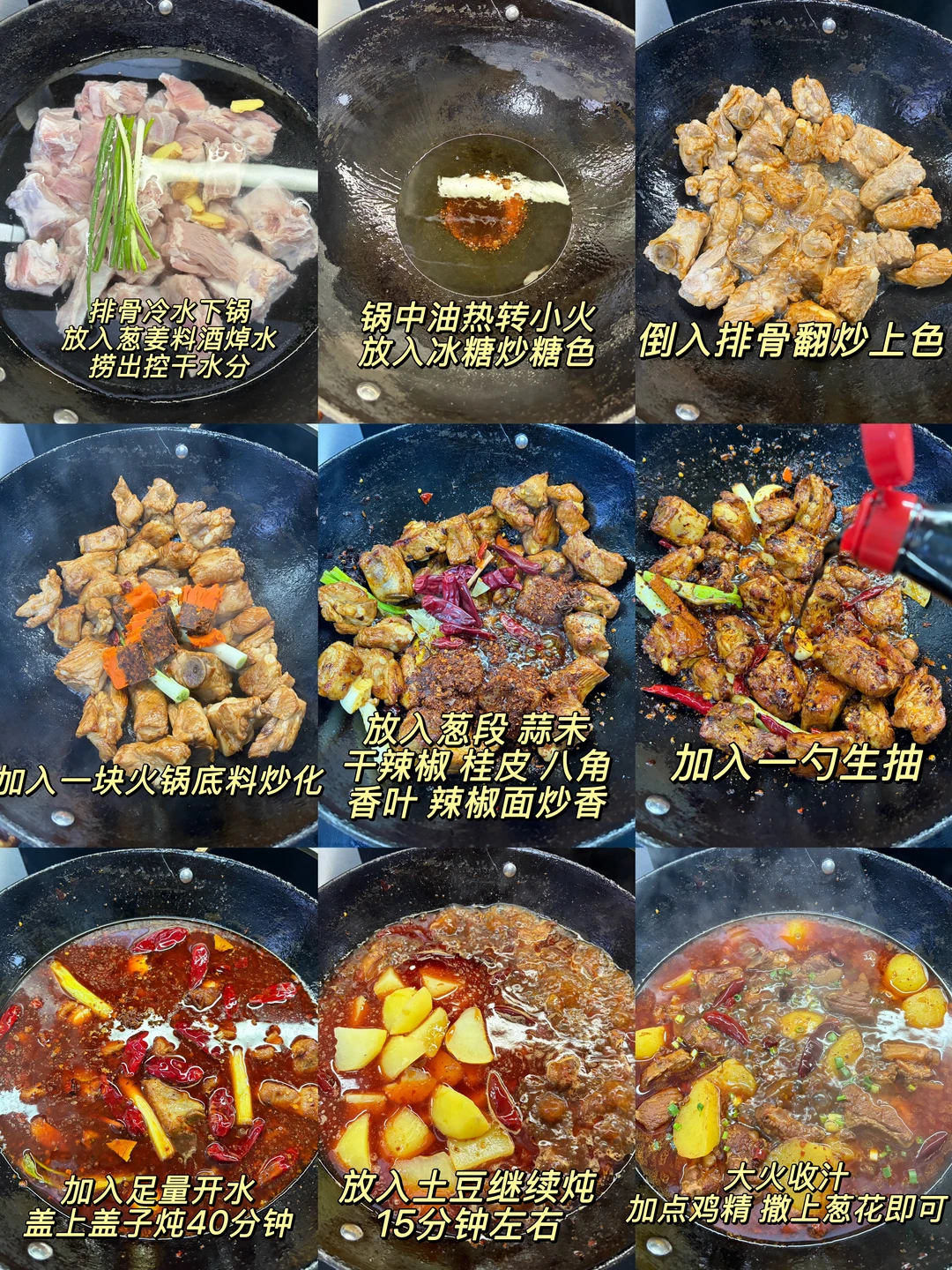 香辣土豆炖排骨 软糯的土豆加上脱骨的排骨超级香!汤汁用来拌饭拌面绝了~ 1️⃣:排骨冷水下锅,放入葱姜料酒焯水后捞出控干水分 2️⃣:锅中油热转小火放入冰糖炒糖色,倒入排骨翻炒上色,加入一块火锅底料炒化,放入葱段 蒜末 干辣椒 桂皮 八角香叶炒香,加入一勺生抽炒匀 3️⃣:加入足量开水,盖盖炖40分钟左右,放入土豆继续炖15分钟,大火收汁,加点鸡精,撒上葱花即可