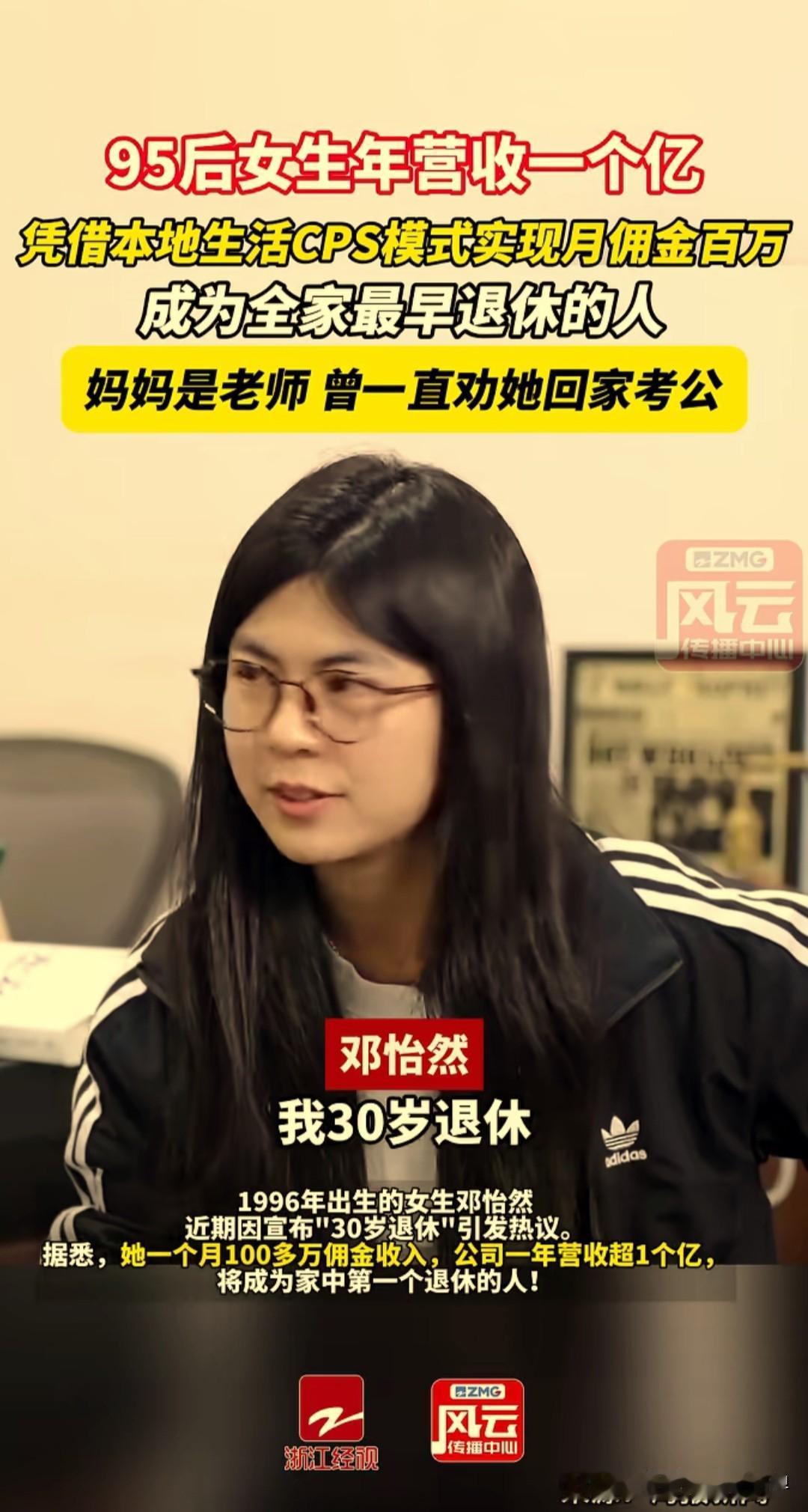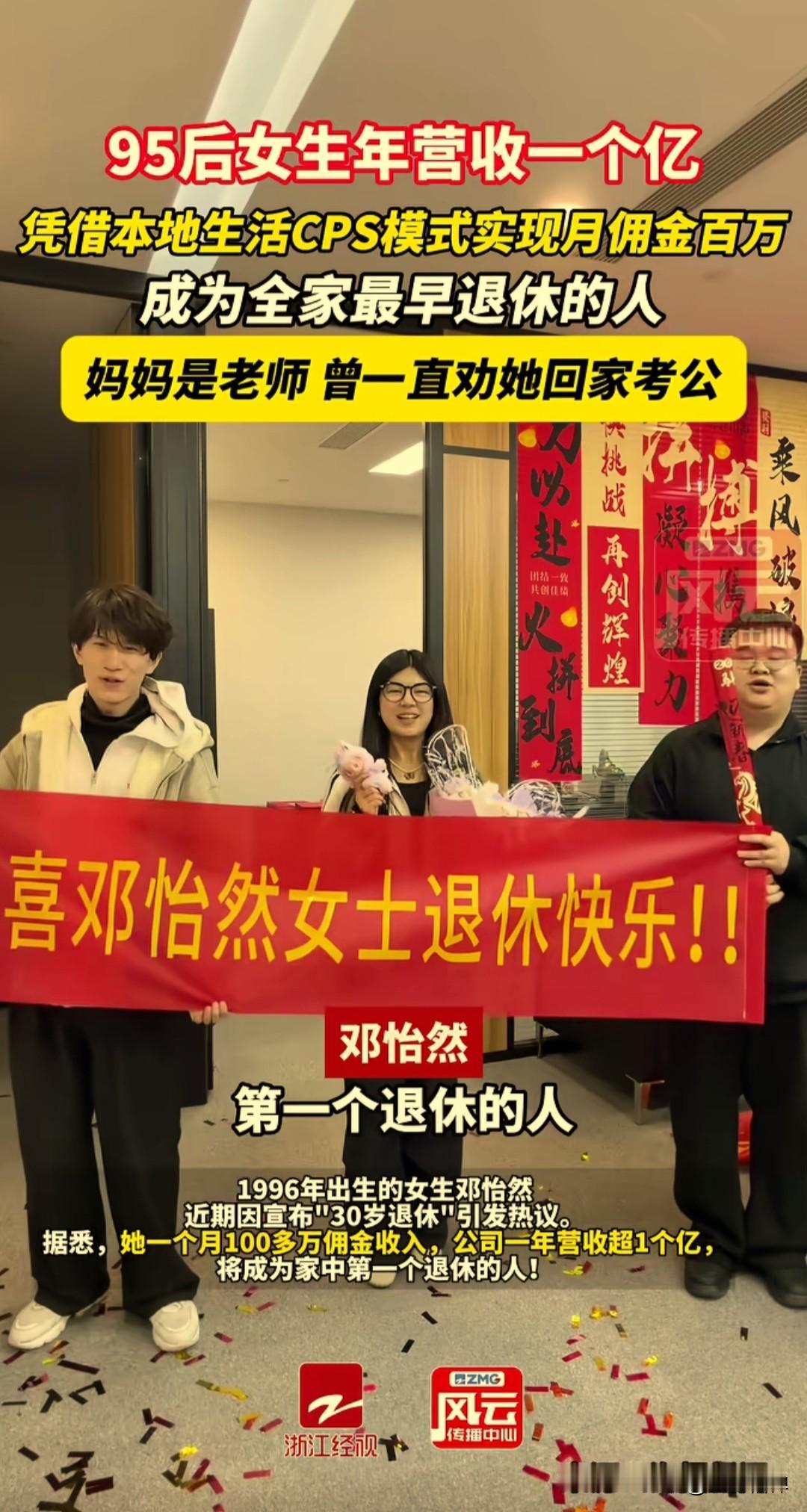 95后女生年营收1个亿,30岁宣布退休,妈妈曾劝她回家考公。 1996年出生的女生邓怡然,她凭借创业公司年营收超过1个亿,个人月入超百万的成绩,宣布计划在30岁退休,成了全家第一个退休的人。 谁能想到,这位现在的“人生赢家”,曾经也面临着和大多数年轻人一样的困境,当老师的妈妈,一直苦口婆心地劝她回家考公,找个稳定的工作。 但邓怡然顶住了压力,选择了一条没人看好的路。她抓住了本地生活服务的风口,与品牌方合作,通过CPS模式(按销售效果付费),把吃喝玩乐的商家链接到线上,靠推广赚取佣金。 如今的她,已经宣布她的“退休”计划,她定义的“退休”并不是完全停止工作,而是希望将年工作时间控制在90天以内,实现高度的个人自由,她已经购买了前往冰岛的机票,计划用三年时间环游世界。 她的成功和规划并未完全获得家人理解,母亲始终认为考取公务员才是“正经工作”,比较稳定有保障,但是她选择了创业这条路。 如果是你,会选择考公安稳一生,还是创业放手一搏?评论区聊聊~