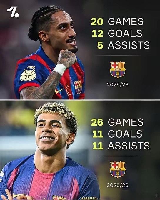 巴萨双子星拉菲尼亚与拉明・亚马尔本赛季状态炸裂:拉菲尼亚:20场12球8助攻亚马