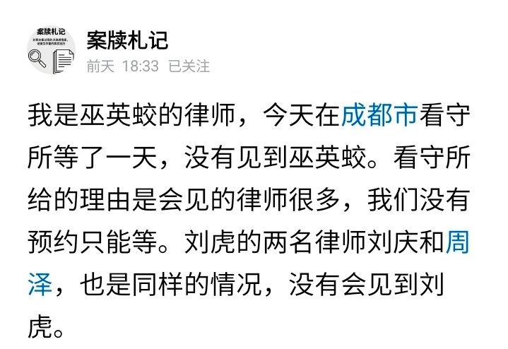 犯罪嫌疑人刘虎和巫英蛟的代理律师,昨天在成都市看守所等了一天,没有见到巫英蛟。看守所给的理由是会见的律师很多,巫英蛟没有预约只能等。刘虎的两名律师刘庆和周泽,也是同样的情况,没有会见到刘虎。法律明文规定最迟48个小时必须按排律师会见,等等…让时间飞一会儿我不是很懂法律,特地用ai搜了一下律师会见被拘留的嫌疑人是否要预约,答案是一般情况无需预约,但需按流程办理,这个比较好理解,就是出示各种证件委托书之类的,最迟48个小时按排…