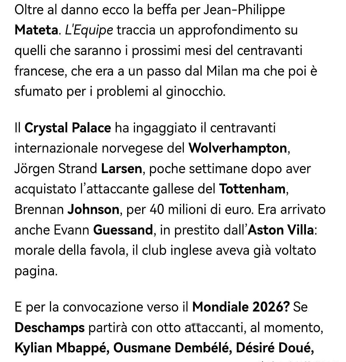 只差一步就进豪门,一条烂膝盖毁所有。 3500万欧元的合同摆在桌上,AC米兰的球衣,就差穿在你身上。你兴冲冲跑进体检室,医生却对着你的膝盖X光片直摇头。旧伤,又是2019年的旧伤。 米兰当场撤回报价,电话里只留下一句“抱歉”。换做是你,这口气怎么咽? 你还没从被退货的打击中缓过来,回头一看,俱乐部已经不声不响买了两个新前锋。一个3500万,一个4800万,都是来抢你饭碗的。 主教练直接把你踢出大名单,说你“状态不好”。球迷在看台上对你发出嘘声,他们忘了你曾经带伤为球队拼命。 更要命的是世界杯。德尚要带8个前锋,姆巴佩、登贝莱早就锁定了位置。最后一个名额,图拉姆、科曼、恩昆库一堆人盯着。你在俱乐部连球都踢不上,拿什么去争? 要么手术,错过整个赛季。要么硬撑,被新援死死按在板凳上。两条路,都是死路。 压垮一个职业球员的,从来不是一次伤病,而是在你受伤时,全世界都把你当成了废品。