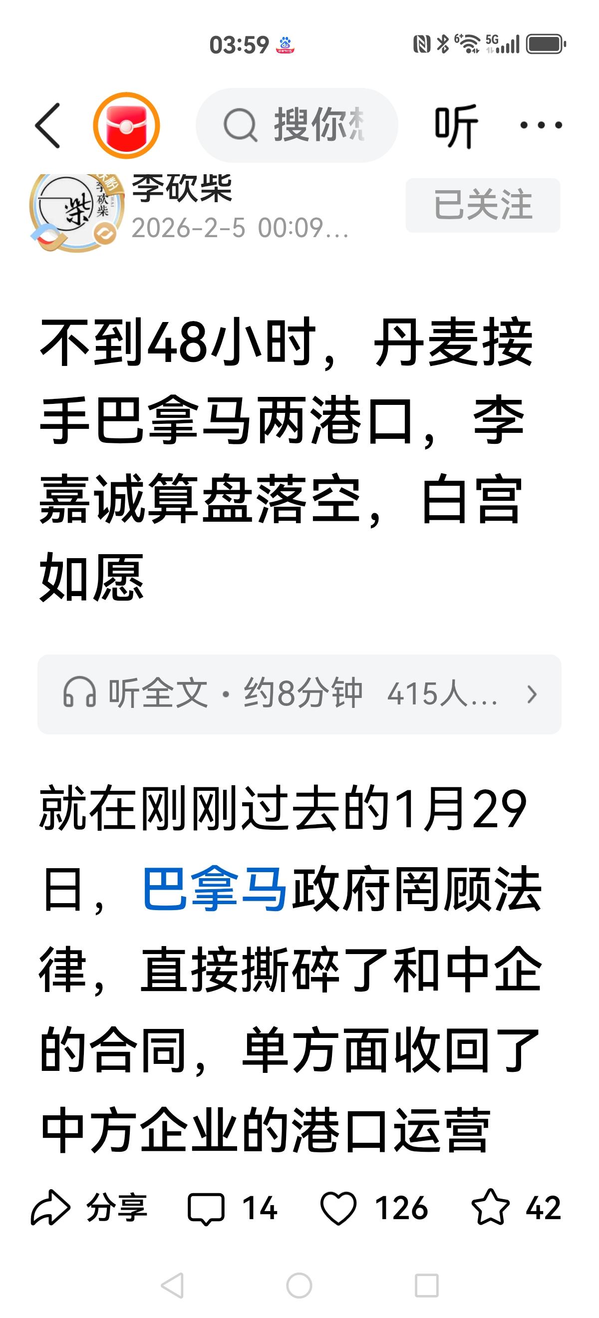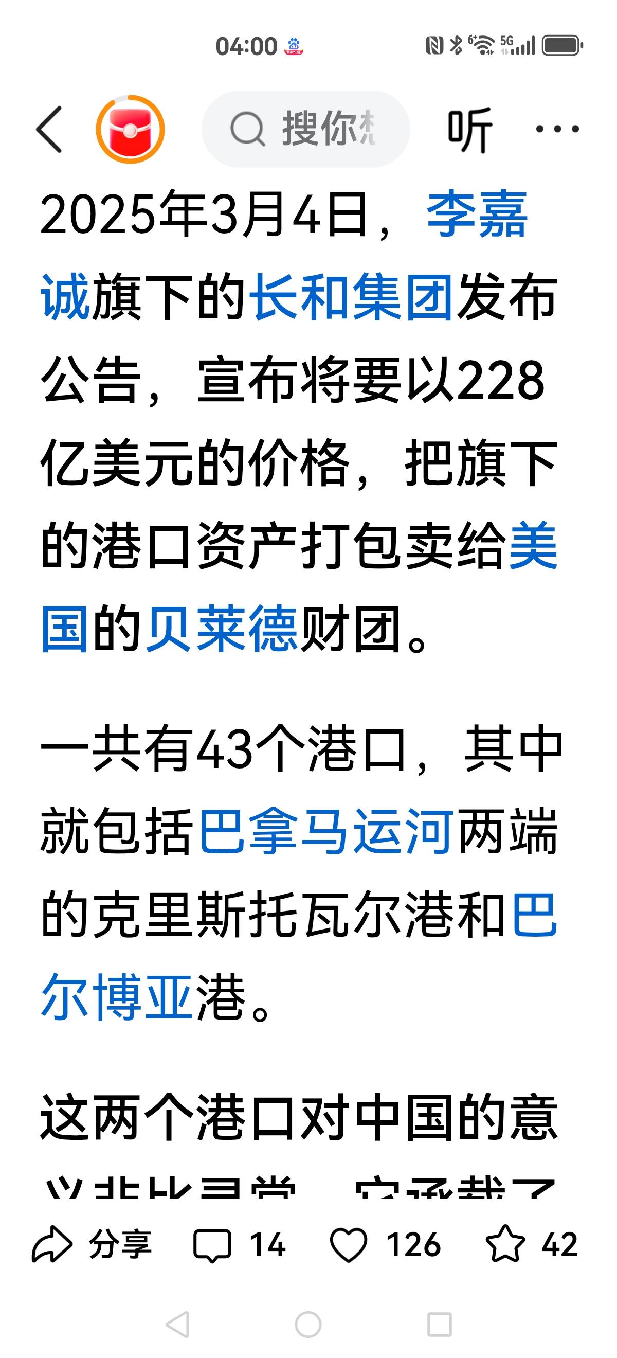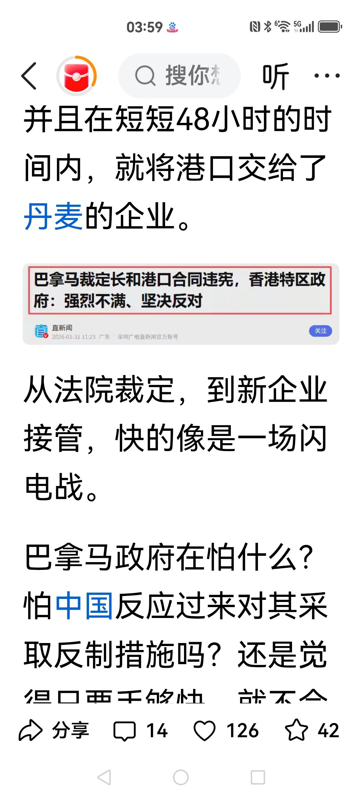 【丹麦接手了】 李嘉诚与贝莱德集团谈妥了,以228亿出售港口。 大公报横空出世,把这次商业买卖堪称投美所好,损害**利益,让我们失去重要战略意义的港口。 叫停后,开始多方接洽,谈来谈去,巴拿马法院突然判决收回港口。 目前丹麦接手了,看来按照沈逸指点应该出手了,沈逸警告过巴拿马:巴拿马走着瞧,你做初一别怪我做十五。
