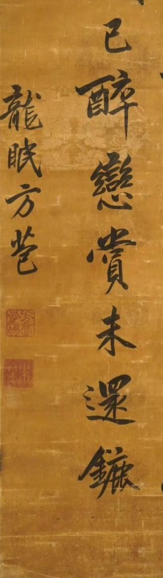 清 · 方苞行书轴 行书:“别业临青甸,鸣鸾降紫霄。长筵鸳鹭集,仙管凤皇调。树接南山近,烟含北渚遥。承恩咸已醉,恋赏未还镳。”款署:“书为次辰年台。龙眠方苞。”下钤:“方苞之印”朱文方印、“灵皋”白文方印。