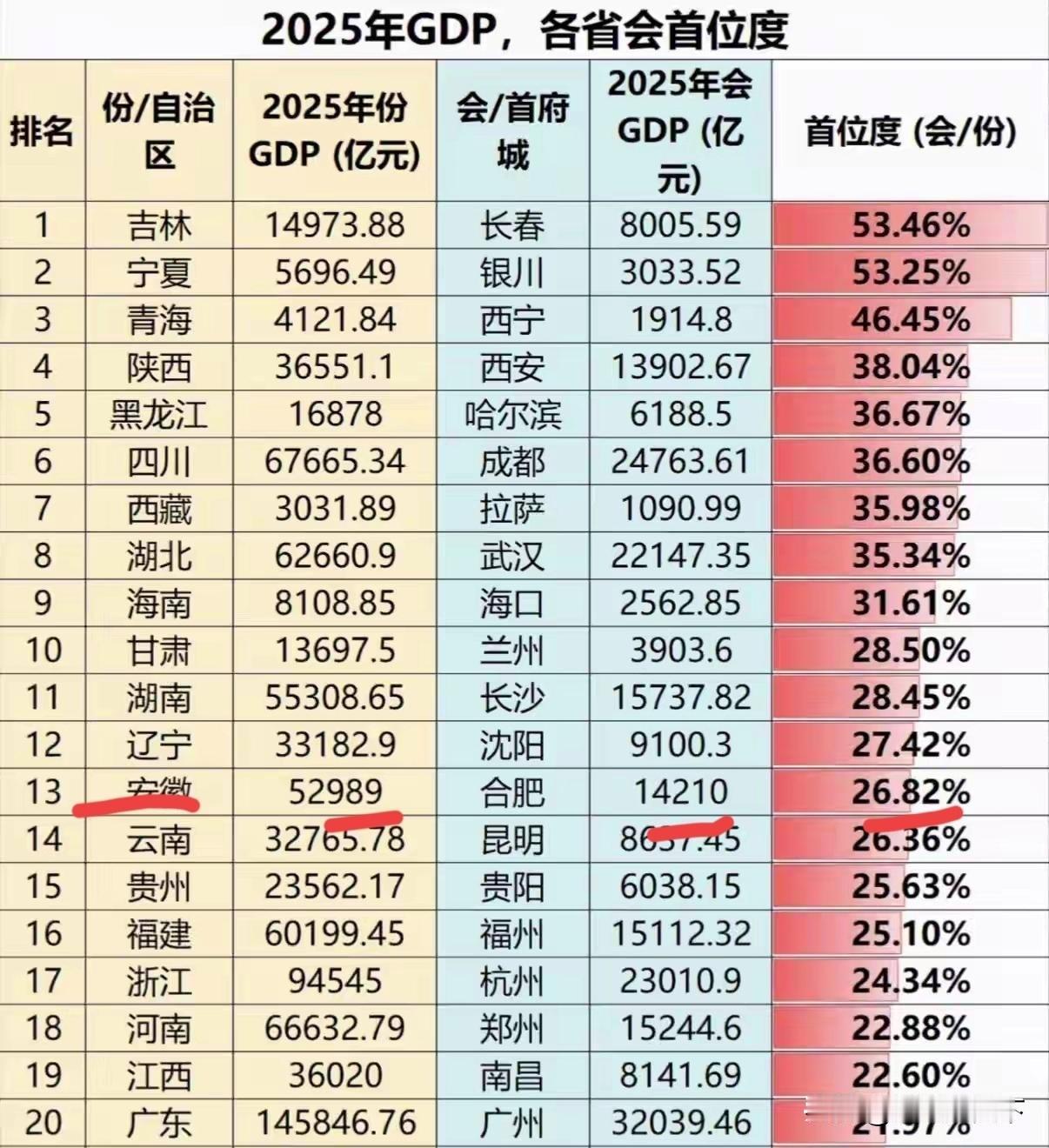 合肥的首位度排名第13名,前面还有12位更厉害的“大佬” 首位度,简单理解就是省会城市经济占比全省的比重,占比越高,首位度就越高。 2025年,合肥数据是14210亿元,安徽省数据是52989亿元,合肥占比安徽省26.82%,合肥首位度在全国省会首府城市里排名13名。 首位度比合肥高的12个城市是:吉林长春,宁夏银川,青海西宁,陕西西安,黑龙江哈尔滨,四川成都,西藏拉萨,湖北武汉,海南海口,甘肃兰州,湖南长沙,辽宁沈阳。 江苏南京,山东济南依然是首位度最低的2个城市。 所以总体来说,合肥的首位度没有那么夸张,虽然合肥有26.82%,但是首位度排名里,连前十名都没有进入。合肥GDP增速 合肥GDP 合肥城市竞争力 合肥经济增长 合肥实力 合肥gdp