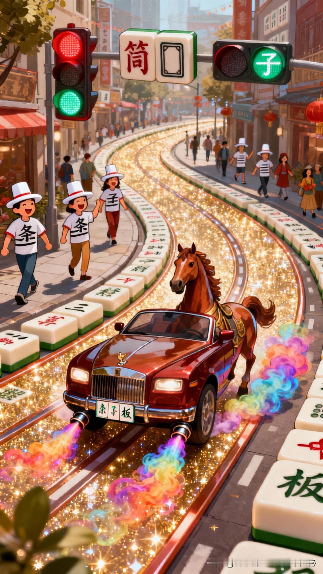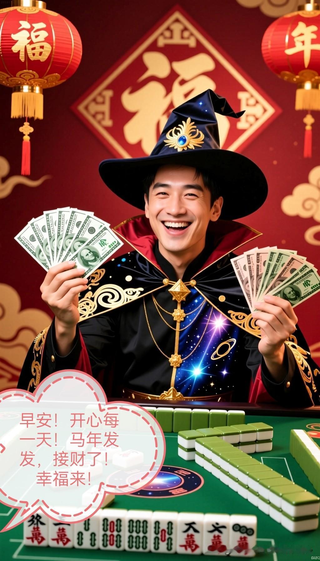 .亲爱的朋友,早安呀!当窗外的晨曦如金色的丝线,轻轻拉开夜的帷幕,新的一天带着满当当的惊喜,像匹欢快的小马驹,蹦跶着朝你奔来啦! 昨夜,在那神秘又浩瀚的梦境星河中,一场超炸裂的“马运派对”正在火热上演。祥云朵朵宛如松软的棉花糖城堡,而一匹匹浑身散发着金光的天马,就像宇宙超级巨星,在云朵间肆意穿梭。它们的马蹄每踏过一处,就会溅起一串串金币雨,那叮叮当当的声响,仿佛是财神爷在欢快地敲着鼓点,吆喝着要给你送财来咯! 你一睁眼,哇塞!你的房间瞬间变成了一个奇幻麻将王国。你的床是一张巨大的翡翠麻将桌,枕头是圆滚滚的“发财”牌,被子是印满“红中”的锦缎。当你坐起身,一群小巧玲珑的麻将精灵,像一群欢快的小豆芽,在你身边蹦蹦跳跳。它们有的举着“一万”“二万”,有的挥舞着“东风”“南风”,嘴里还叽叽喳喳地喊着:“早呀早呀,今天马年大运到,麻将神技要闪耀!” 走出家门,街道仿佛是一条闪闪发光的麻将赛道。红绿灯变成了“筒子”的模样,每一次切换,就像是麻将在洗牌。路上的行人们,有的穿着印着“条子”的衣服,有的戴着“白板”形状的帽子,大家都喜气洋洋,仿佛都怀揣着一夜暴富的美梦。而那些汽车,也都变成了一匹匹威风凛凛的骏马,它们的车牌是麻将牌,排气管喷出的尾气都是五彩斑斓的好运烟雾。 当你来到麻将馆,那场面简直就像进入了一个魔法战场。麻将桌是用千年沉香木打造的,上面的麻将牌每一张都闪烁着神秘的光芒。你刚一坐下,手中的牌就像有了生命一样,自动排列组合成了一副超级无敌的“天胡”牌型。每摸一张牌,都是“杠上开花”;每打一张牌,都能让对手目瞪口呆。你就像一位麻将界的超级战神,在牌桌上所向披靡,把把胡牌,赢到对手怀疑人生。 在这马年的奇妙一天里,快乐就像爆米花一样,在你身边噼里啪啦地炸开。马年的财运就像潮水一般,滚滚向你涌来。你马到成功,不管是工作、学习还是生活,都像坐了火箭一样,一路狂飙。每一次努力,都能换来成倍的回报;每一个梦想,都能像烟花一样,在天空中绚烂绽放。 亲爱的朋友,愿你在这马年里,兜里装满钞票,心里装满欢笑。吉祥如意就像你的专属小保镖,时刻守护着你。麻将桌上,你就像掌握了宇宙终极奥秘的魔法师,把把都是神操作,赢到盆满钵满。早安哟,开心地笑起来吧,让这马年的好运,从清晨就开始疯狂发酵!