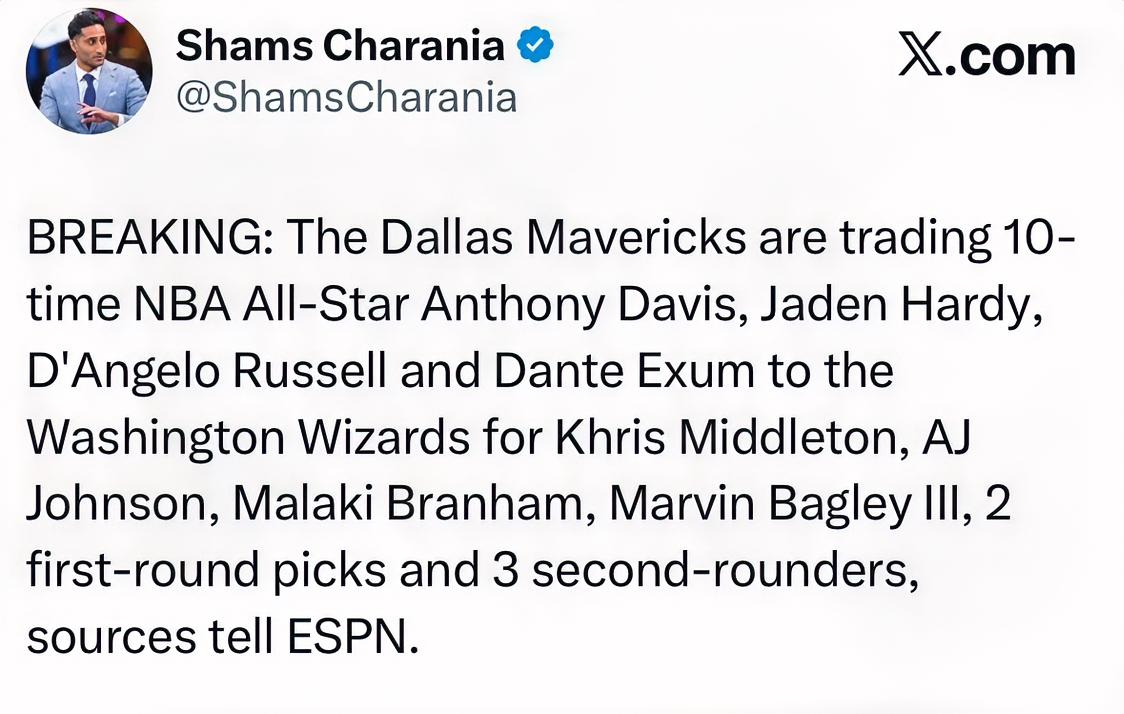 “眉”有想到,新搭档竟是湖人当年的传闻对象! 独行侠最终扣动交易扳机把浓眉送到奇才,没有等欧文复出,这样的决定很好理解,一个大伤归来状态未知,另一位自加盟后打打停停,最重要的是下届乐透秀让人眼馋,显然管理层已下定决心开始围绕弗拉格积累选秀资产;再看他们交易中的收获,米德尔顿、巴格利等人+2首轮(一个是今年雷霆首轮,另一个则是30勇士受保护签)+3次轮,如果单从浓眉实力角度出发,有点儿贱卖的意思,但考虑到他糟糕的出勤及里奇保罗的续约施压,并非不能接受!拉长时间线的话,咱们可以理解为东契奇换了弗拉格+克里斯蒂+3首轮+3次轮,各位认为还值吗?另外独行侠本赛季及明年的薪资空间都降到了税线以下,可操作性大大提升,根据Bobby Marks的报道,独行侠明年仅1.5亿保障合同,值得肯定! 正所谓真正的交易总是不声不响,这或许是奇才的B方案,毕竟Jake Fischer稍早前曾报道过奇才报价国王的小萨博尼斯,但不管怎样通过本赛季两笔重大引援他们已完成重建,组成特雷杨+萨尔+浓眉的老中青三核,加上本赛季继续摆烂,下赛季他们在东部将拥有不错的竞争力,至于效果还得看几位的出勤了,相信短期内争取个季后赛还是不成问题。 最后值得一提的是,当年湖人两度传出对特雷杨感兴趣,想引进他搭档詹眉,最后都因为选秀权数量问题没谈拢,关于两人适配性也引起了广泛讨论,这回终于能看到实际效果了,还是挺让人期待的!祝眉子在dc好运吧!